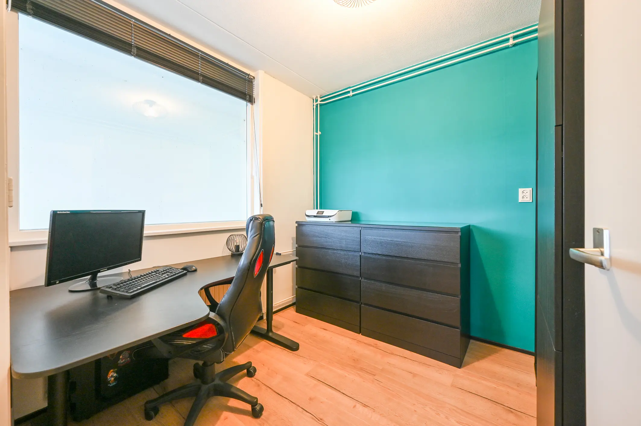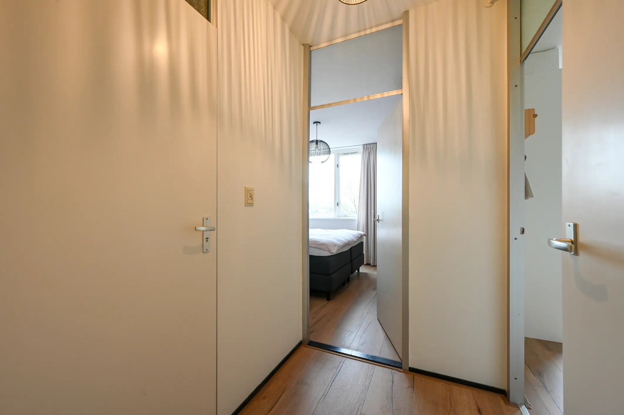 De slaapkamer aan de voorzijde is geschikt als kinder- of werkkamer. De twee slaapkamers aan de achterzijde zijn ruimer van formaat en bieden voldoende plaats voor een tweepersoonsbed en kastruimte. Alle slaapkamers zijn keurig afgewerkt met een moderne laminaatvloer, strakke wandafwerking en hardhouten kozijnen met dubbel glas.