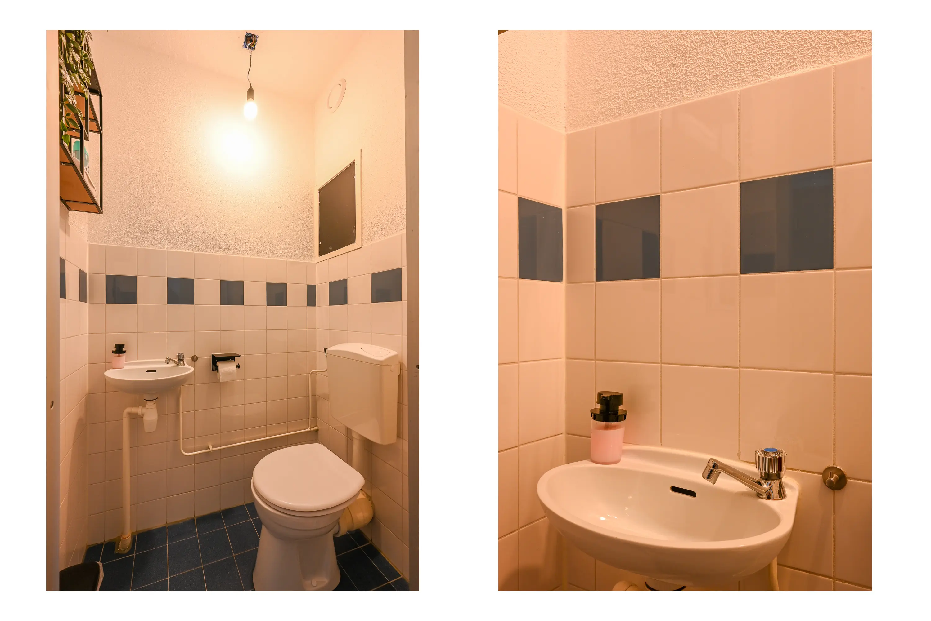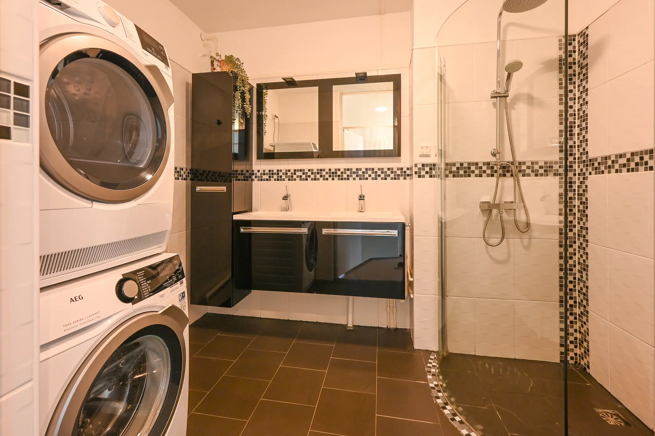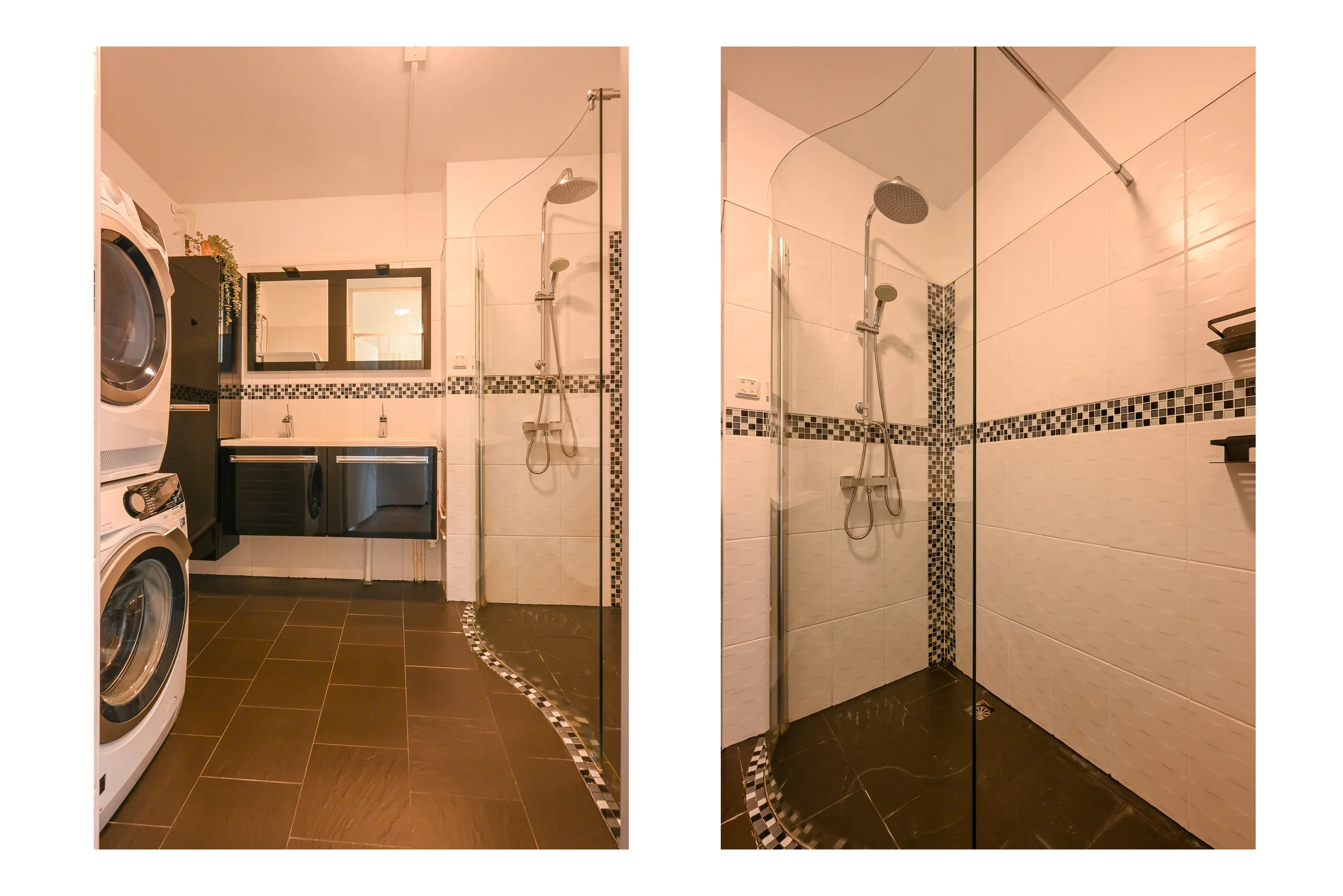 De badkamer is ruim en verzorgd afgewerkt, grotendeels betegeld en voorzien van een inloopdouche, een dubbel wastafelmeubel met bijbehorende kasten en spiegelkasten met opbouwverlichting. Tevens bevinden zich hier de aansluitingen voor wasmachine en droger. Separaat is er een toiletruimte aanwezig met closet en fonteintje.