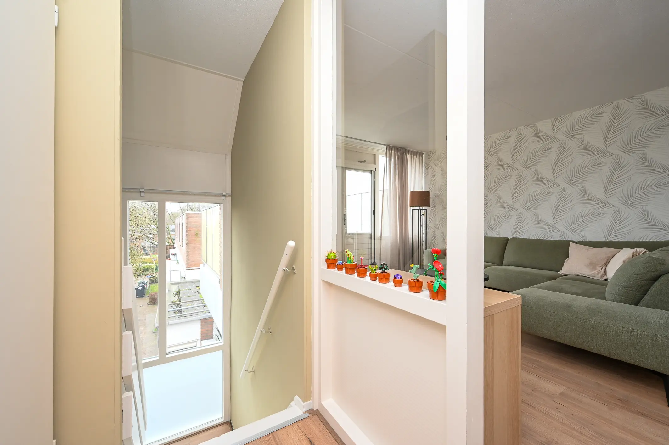 Via de lichte trap bereik je de woonverdieping. Doordat je hier boven woont, geniet je van extra privacy, veel licht en een weids uitzicht.