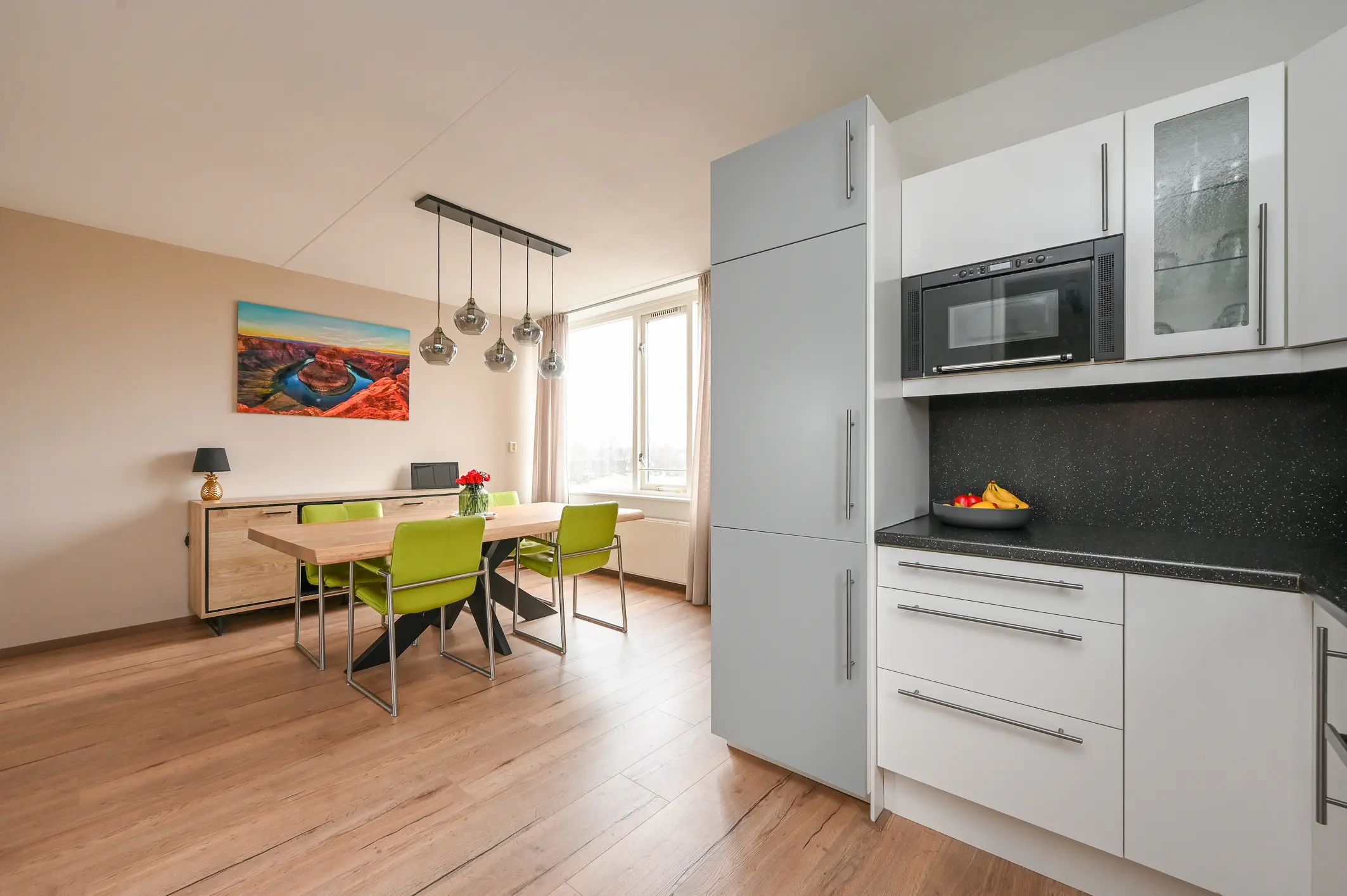 De royale woonkamer is opvallend diep en biedt volop ruimte voor een comfortabele zithoek en een grote eettafel. Via openslaande deuren heb je toegang tot het zonnige dakterras van circa 11 m², gelegen op het zuidwesten. Hier kun je een groot deel van de dag genieten van de zon en het vrije uitzicht – een echte verlenging van de woonkamer.
