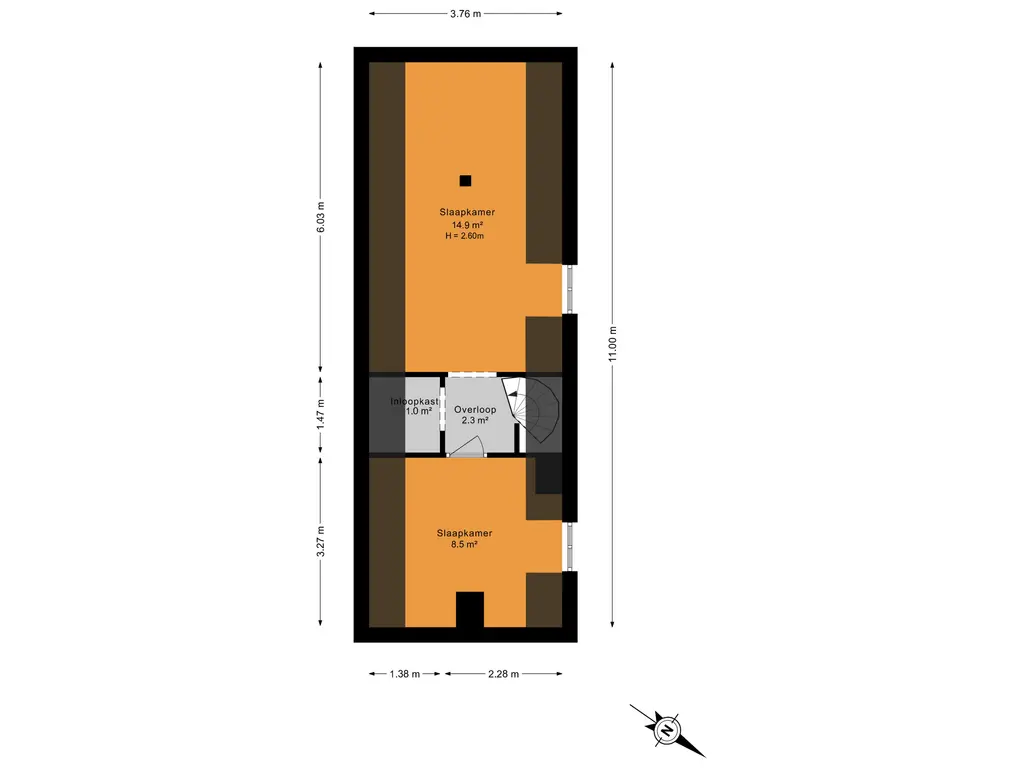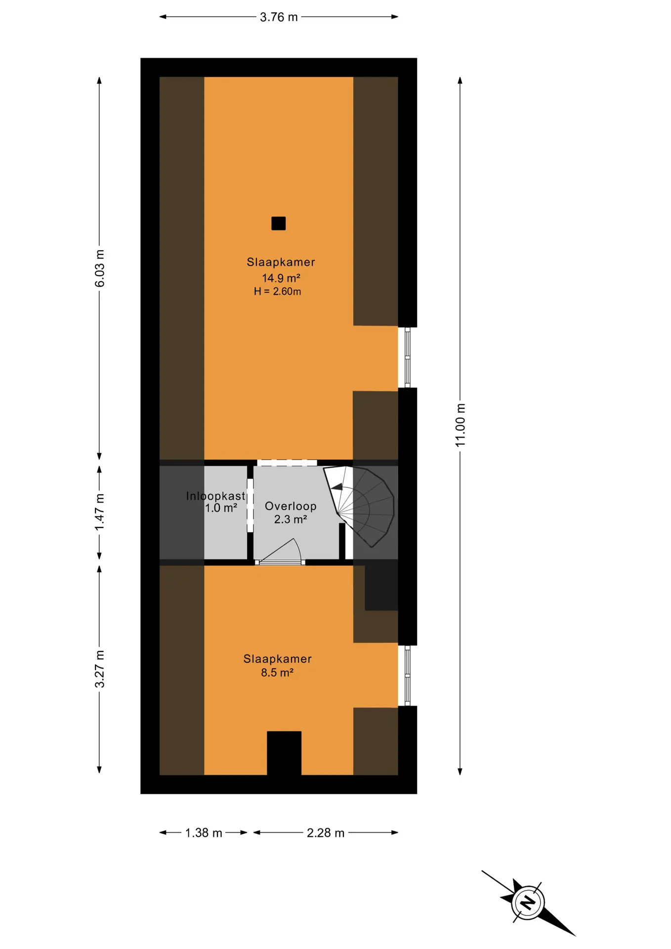 Via een wenteltrap bereik je de eerste etage. Hier vind je een overloop met een grote bergkast en twee slaapkamers, beide voorzien van een dakkapel en een prachtige zichtbare kapconstructie die voor extra hoogte en een ruimtelijk gevoel zorgt. De master bedroom beschikt over een airco die zowel kan koelen als verwarmen – heerlijk comfortabel in alle seizoenen.