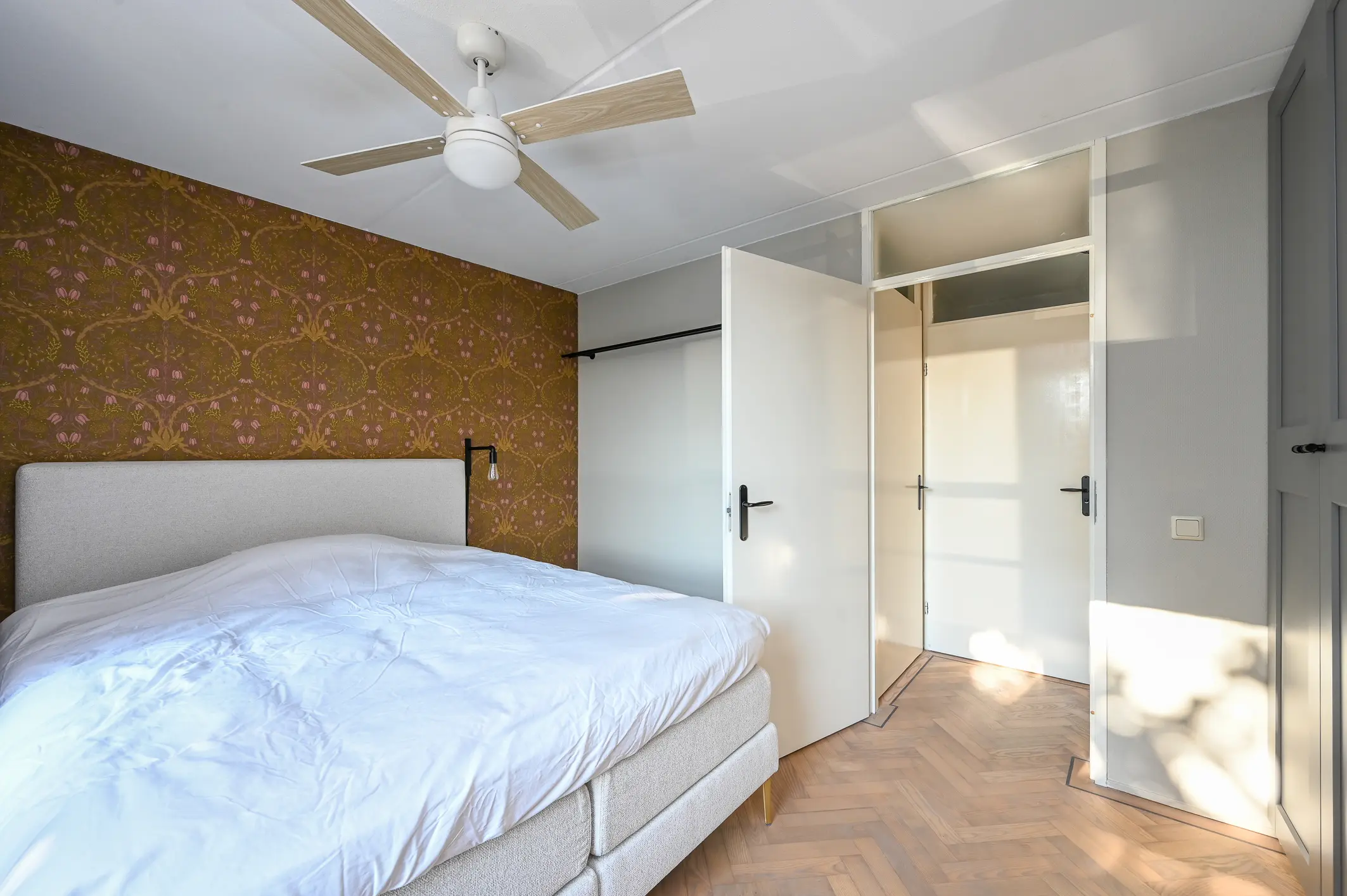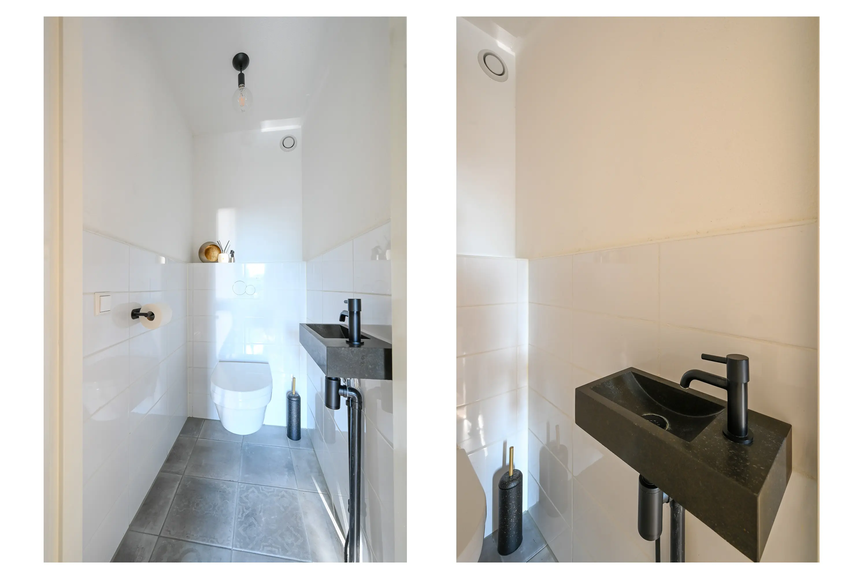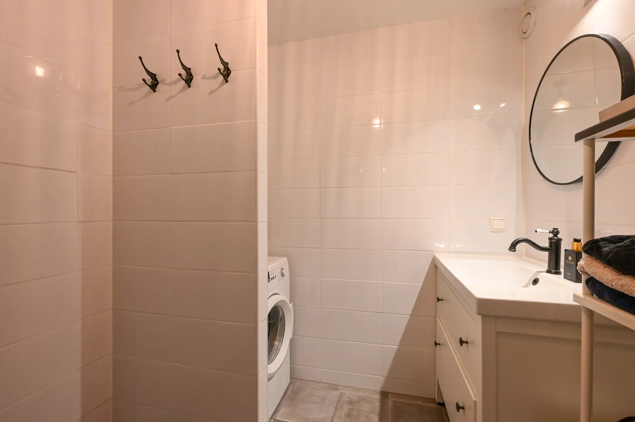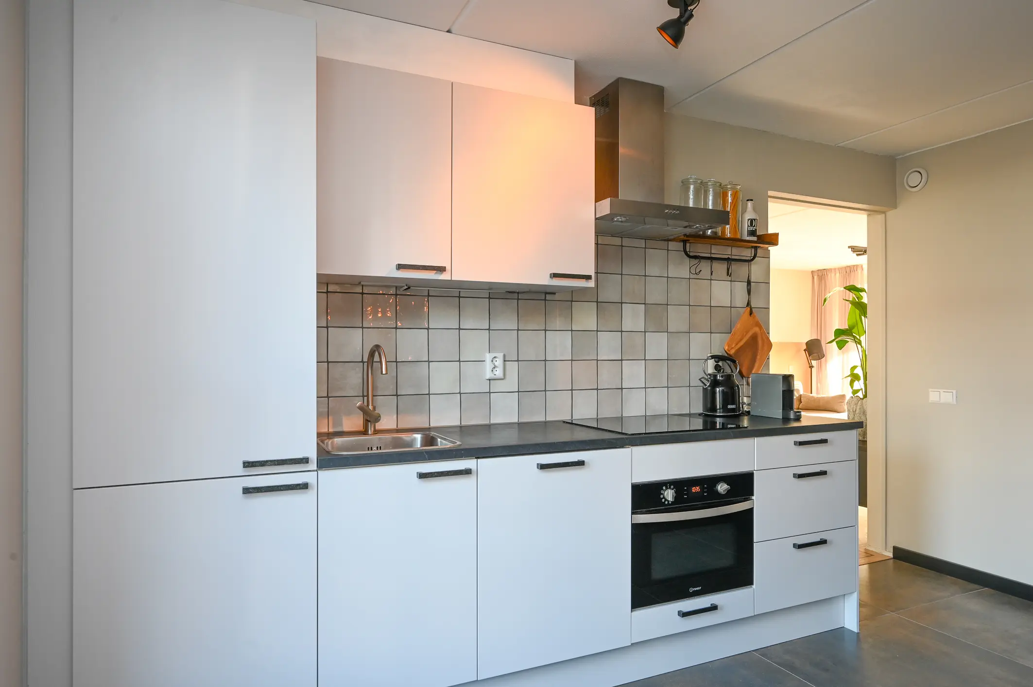 De royale woonkeuken biedt ruimte voor een grote eettafel en kijkt uit op de groene binnentuin – een fijne plek om te koken én te tafelen. Via een tweede gang bereik je een handige kast met de CV-combiketel (2025) en de aansluiting voor je wasmachine. Het toilet is keurig betegeld en voorzien van een fonteintje. De ruime slaapkamer aan de haven zijde heeft ook toegang tot het balkon. De moderne badkamer is uitgerust met een royale inloopdouche, een stijlvol wastafelmeubel en een praktische bergkast.