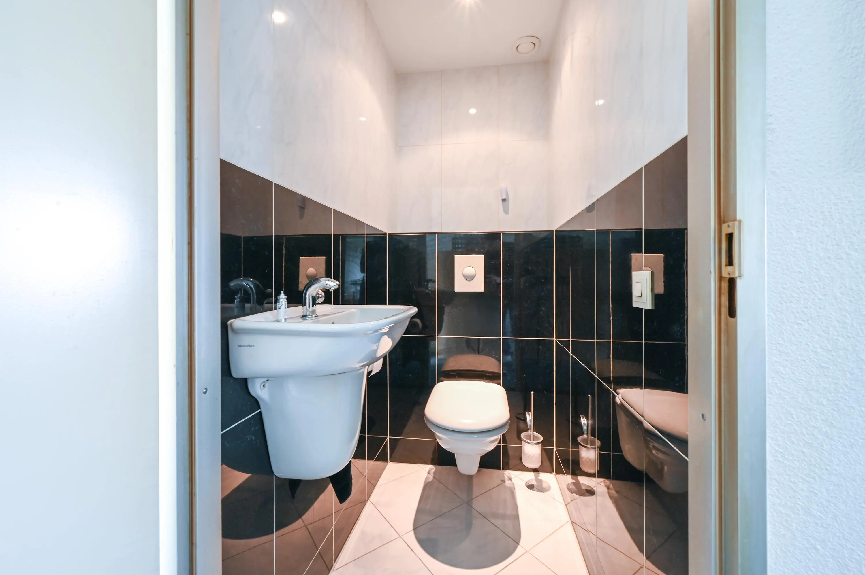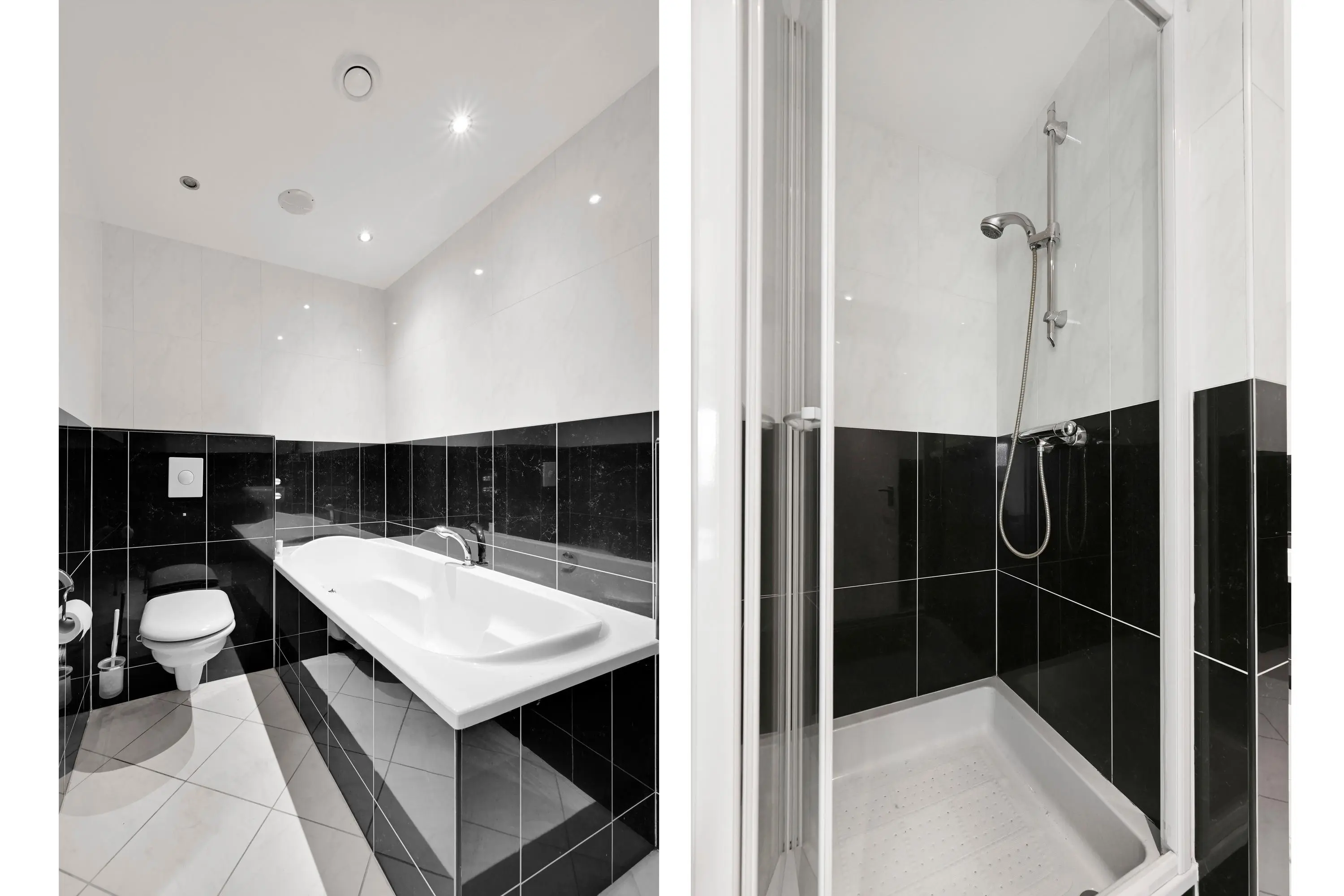 De riante badkamer is volledig betegeld, en beschikt over een ligbad, douche, toilet, wastafel en vloerverwarming. Daarnaast is er een separaat toilet aanwezig. Zowel de badkamer als het aparte toilet zijn bereikbaar via de gang.