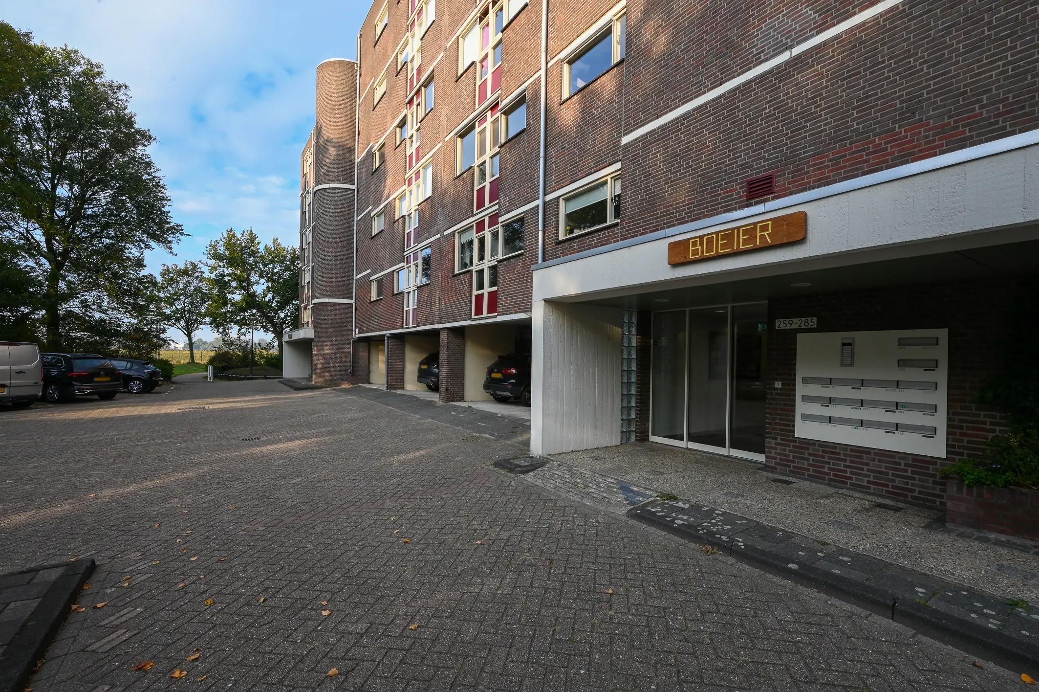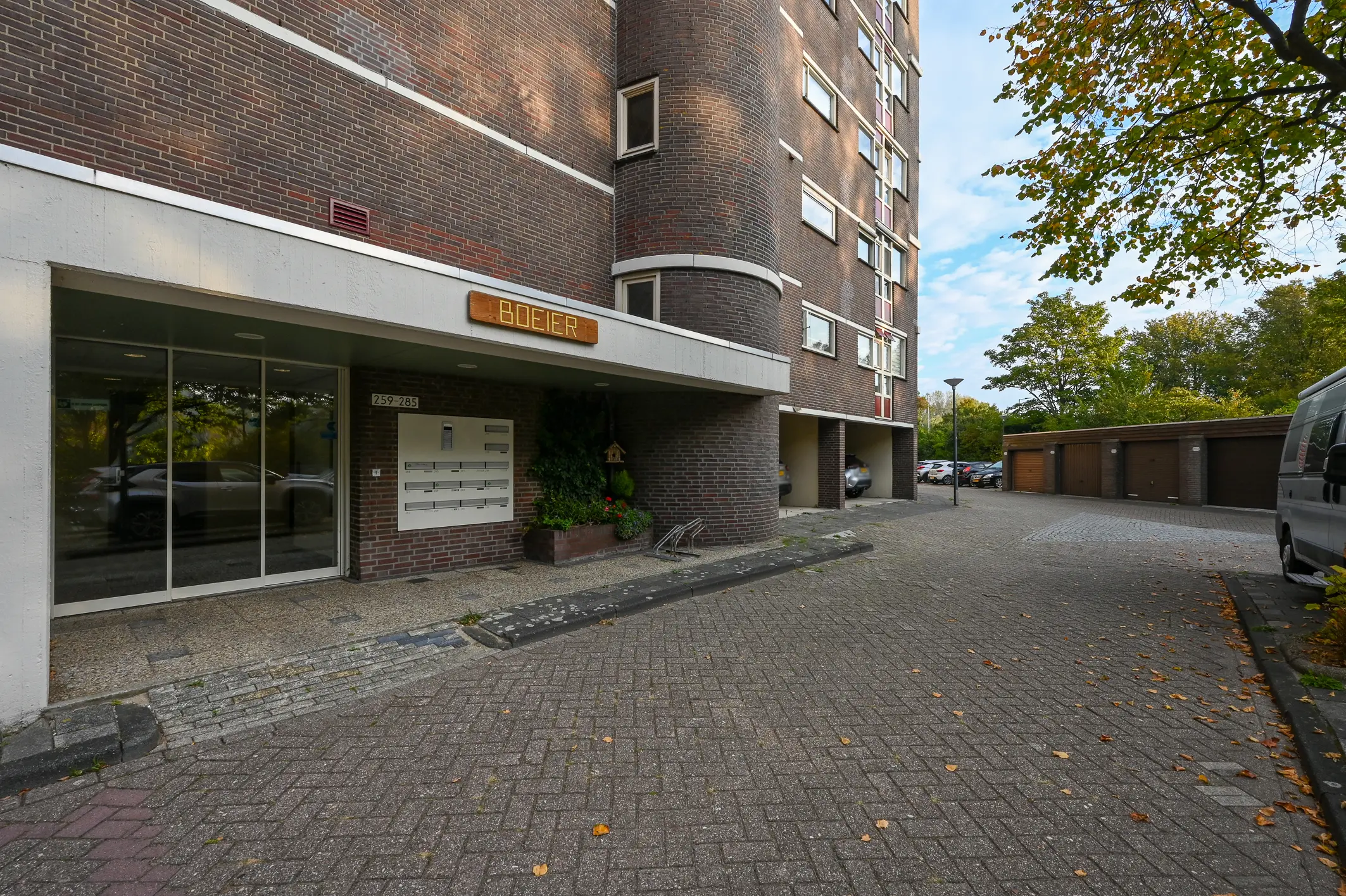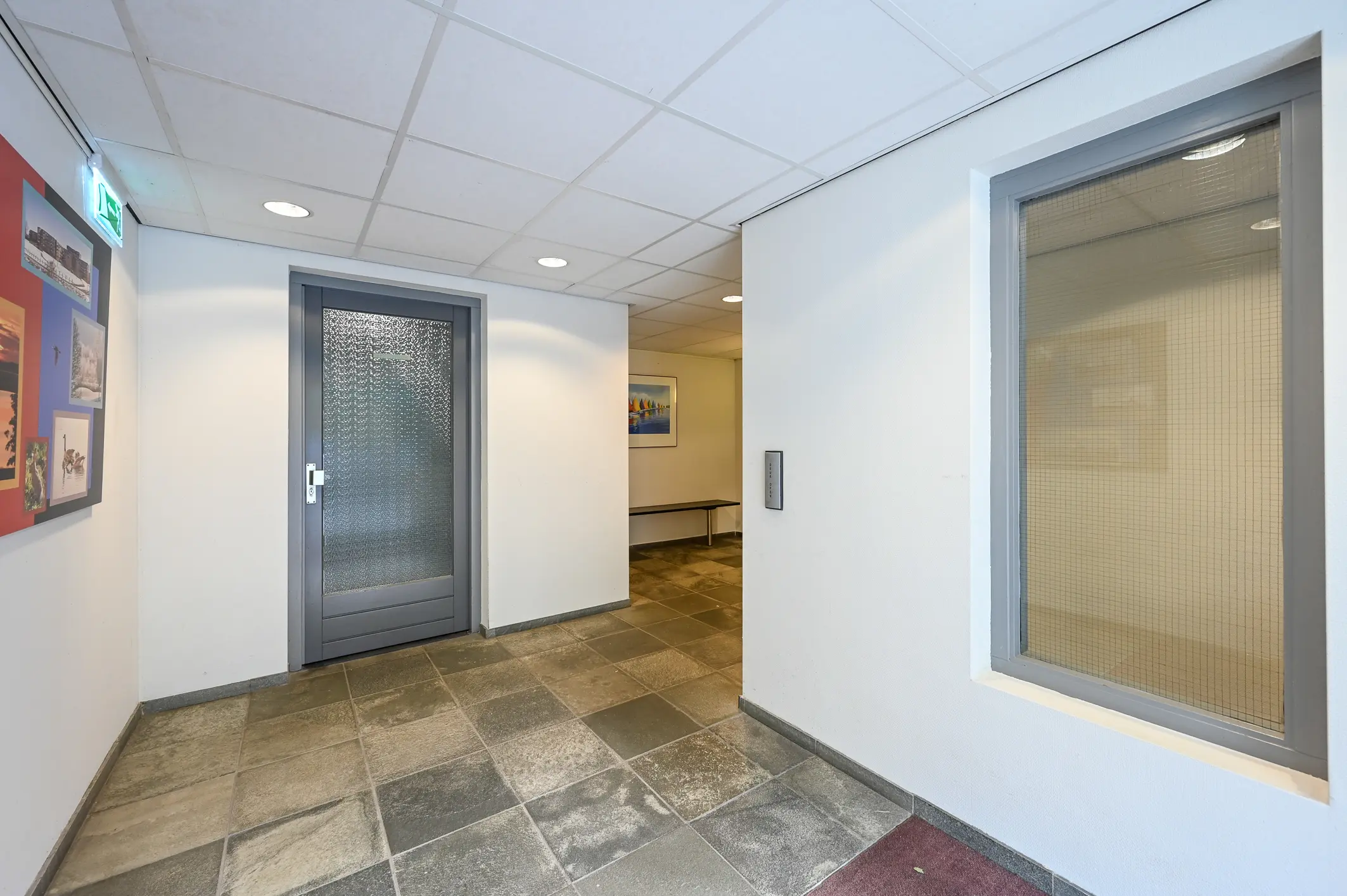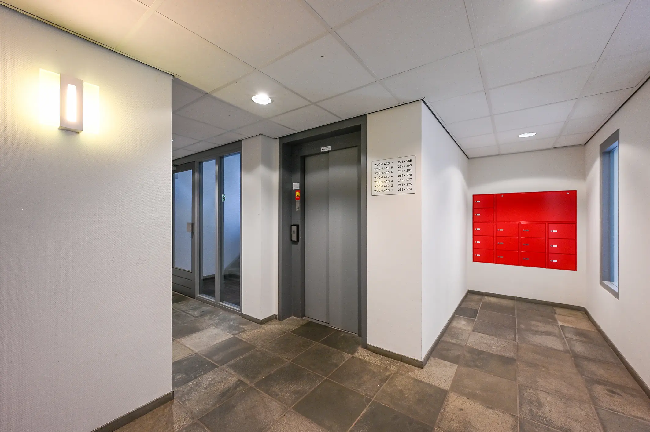 Gemeenschappelijke entree met bellentableau aan de buitenkant geeft toegang tot de nette binnenruimte met toegang tot brievenbussen, bergingen en de lift of trap naar boven.