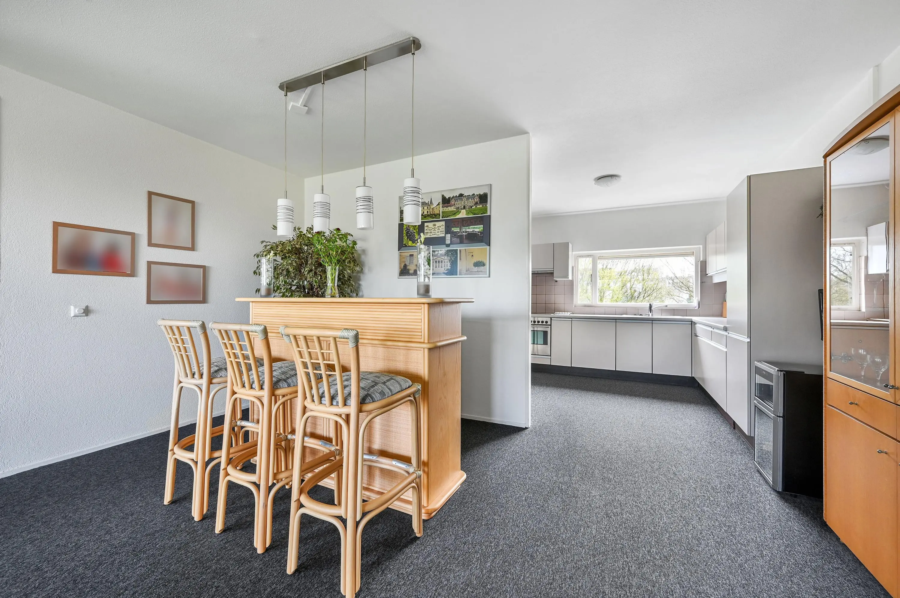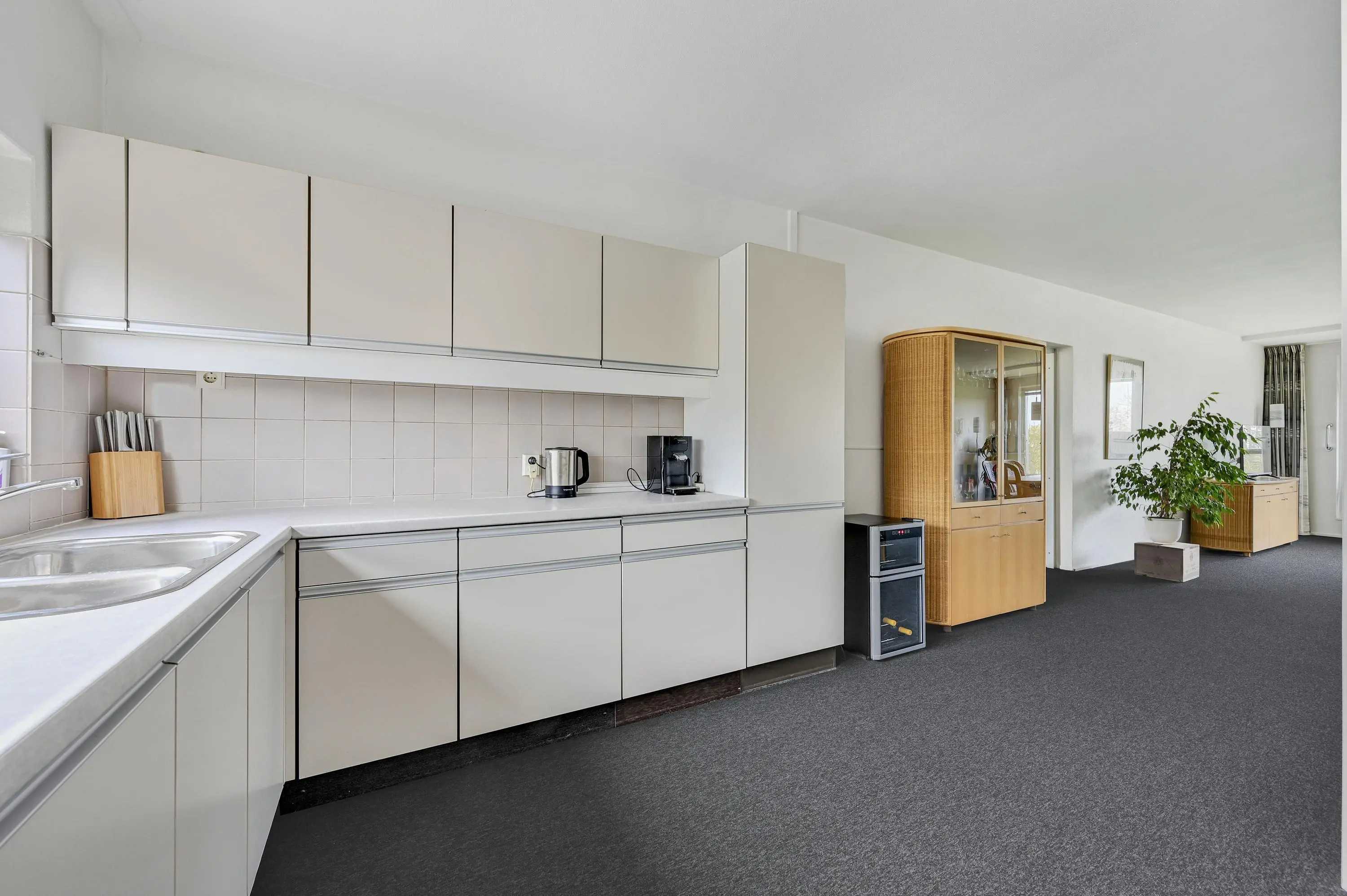 Aan de voorzijde bevindt zich de open keuken in praktische L-opstelling, die naadloos aansluit op de leefruimte. Aangrenzend vind je de dubbele bijkeuken – een luxe extra – verdeeld over twee ruimtes. Hier zijn de aansluitingen voor wasmachine en droger, de cv-opstelling (2021) én volop bergruimte aanwezig.