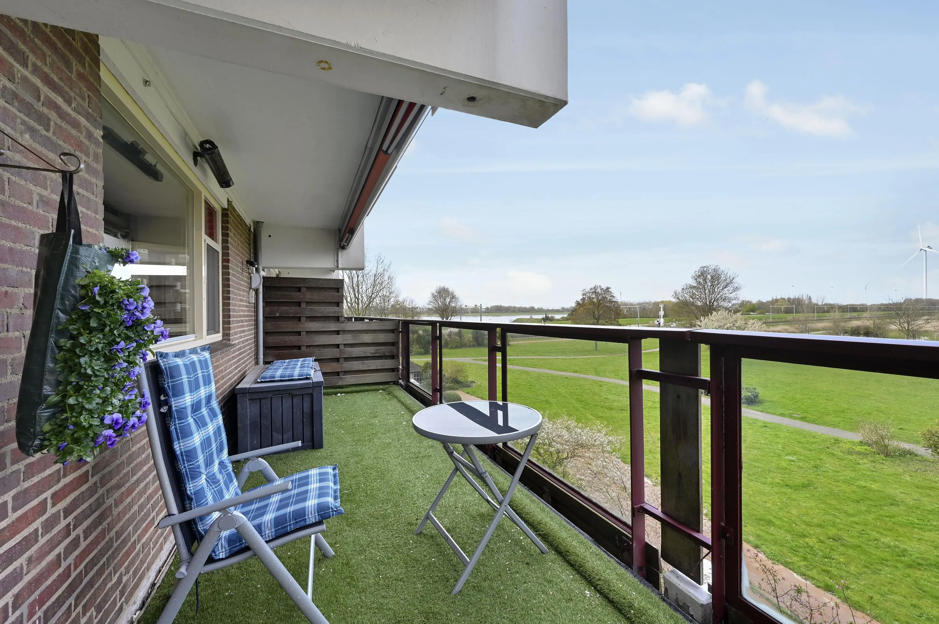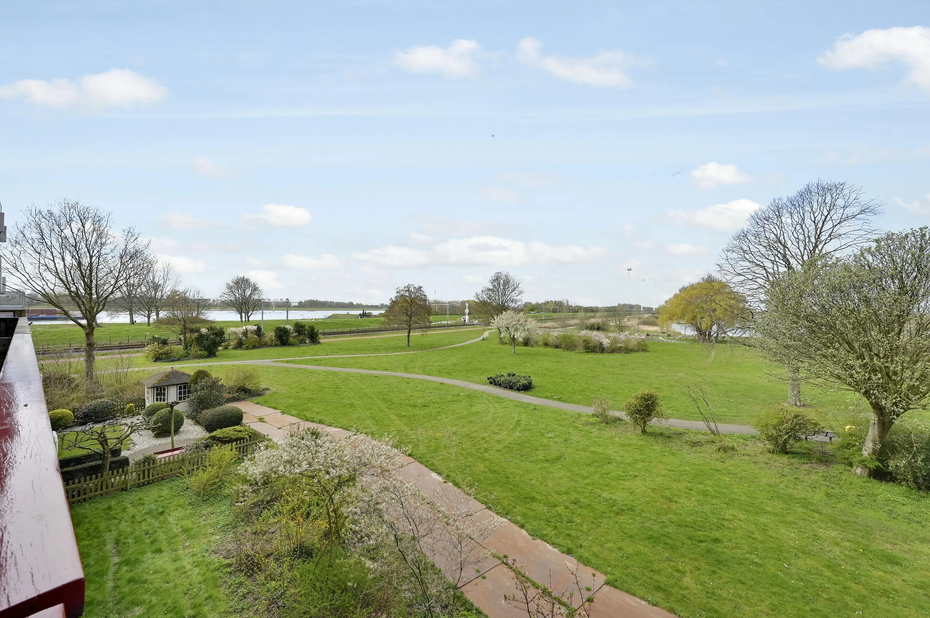 Via de woonkamer bereik je het ruime balkon op het westen. Hier kun je in de middag en avond heerlijk genieten van de zon met uitzicht op de natuur. Een leuke bijkomstigheid zijn de cruiseschepen die met enige regelmaat langsvaren op de waterweg.