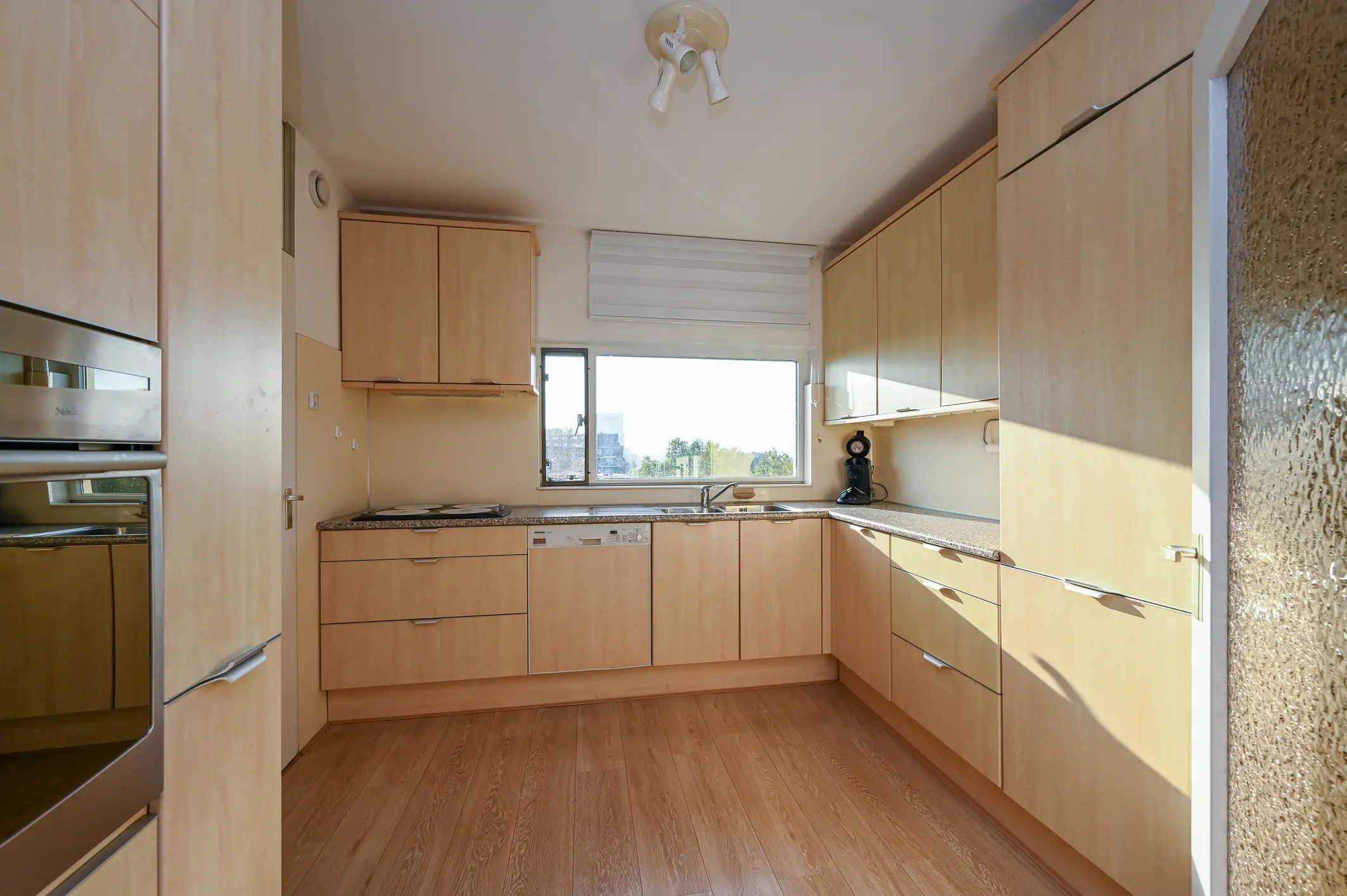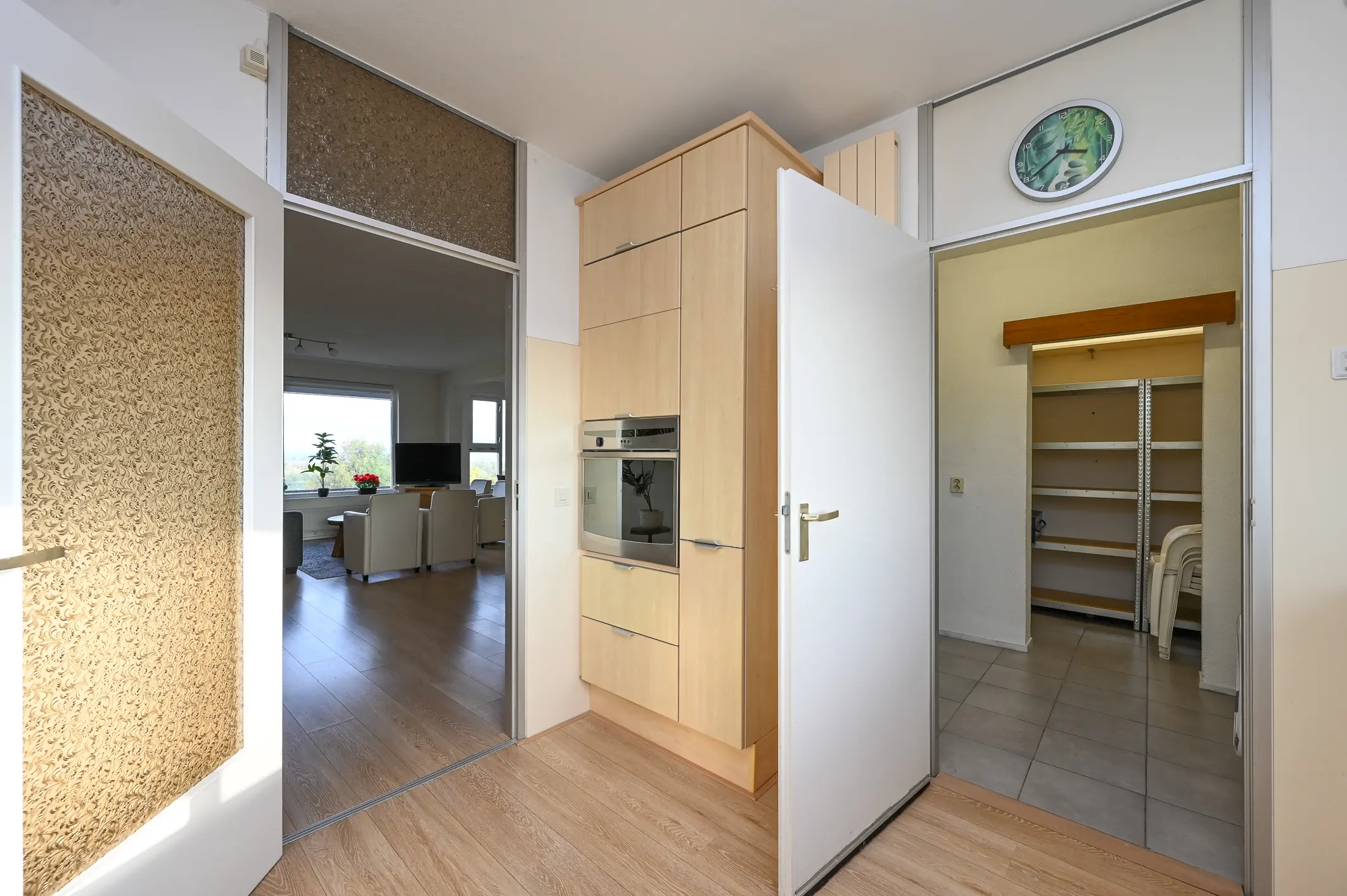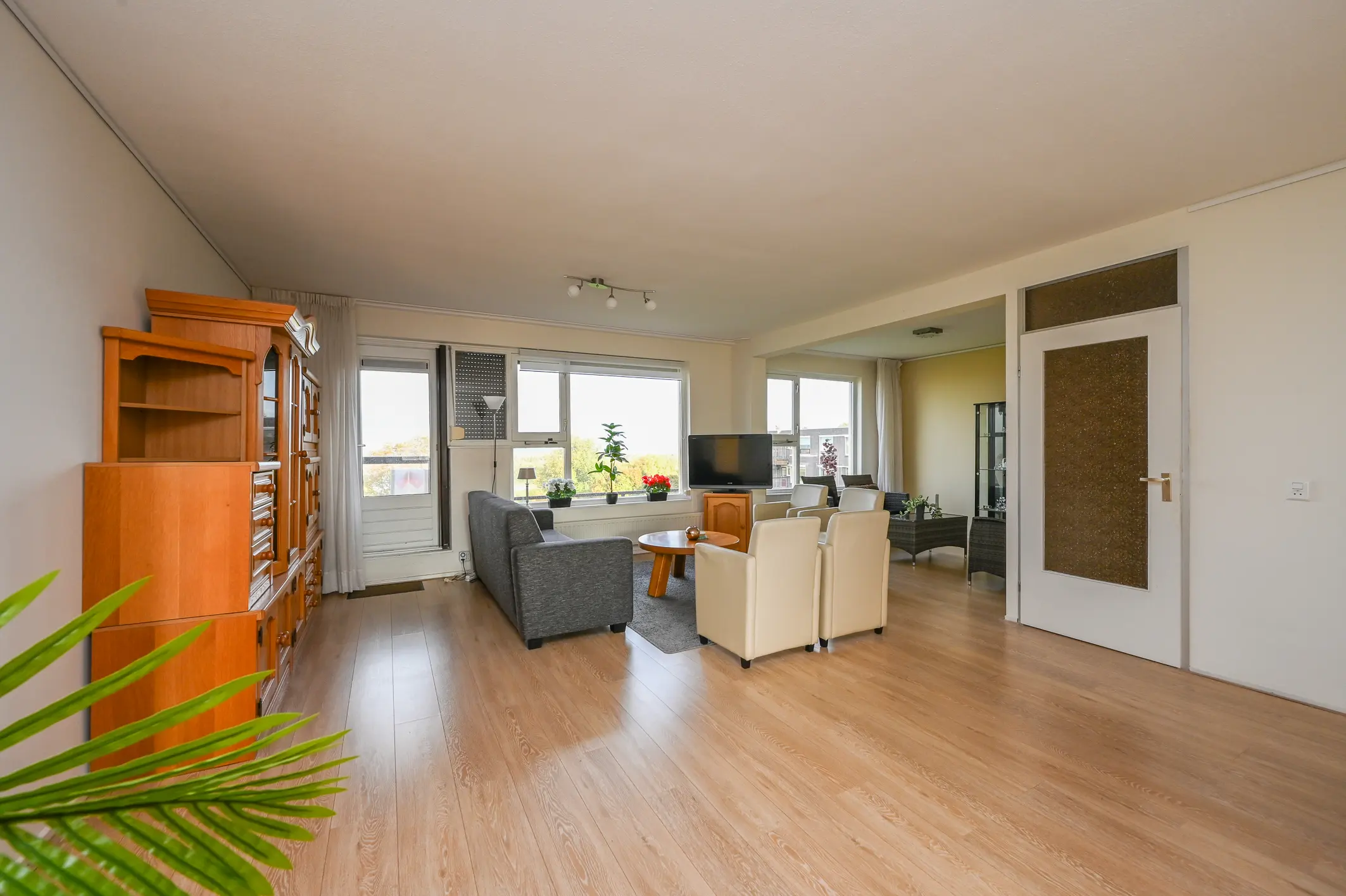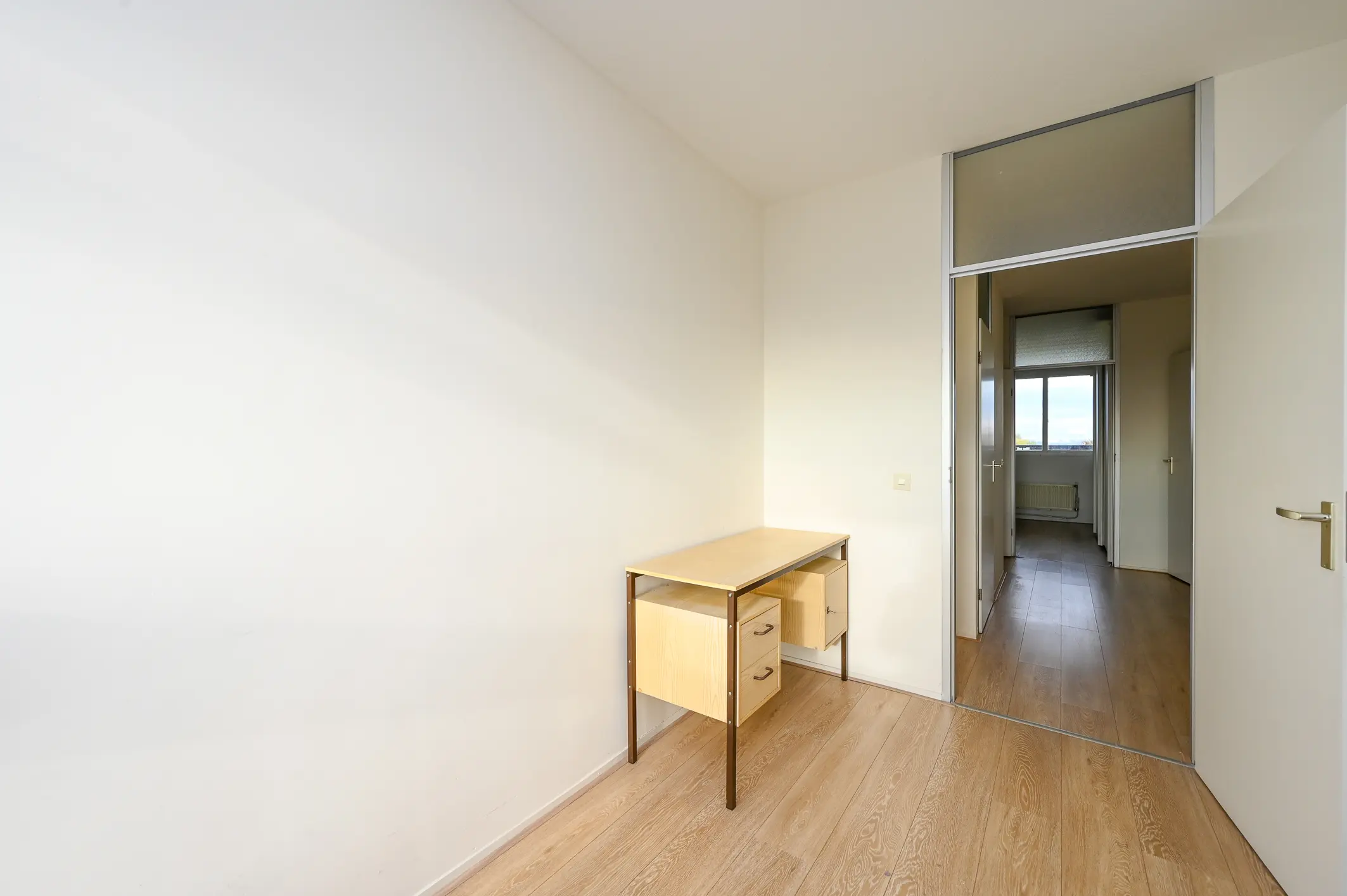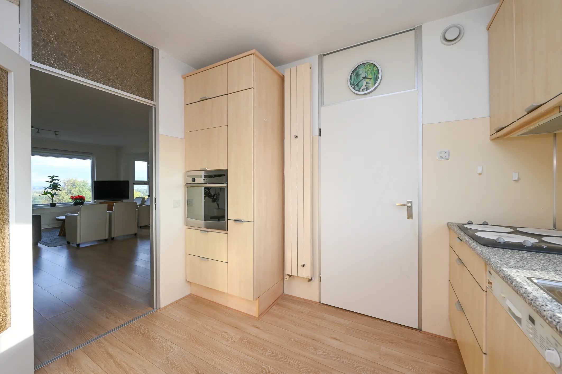 De woonkamer is royaal van opzet en geniet van veel natuurlijk licht dankzij de grote raampartijen aan de achterzijde. Vanaf hier heeft u een fraai uitzicht over De Nieuwe Waterweg, het groene park en de Oranjeplas. De wanden zijn strak afgewerkt en de lichte eiken laminaatvloer loopt door in de gehele woning, wat zorgt voor een rustige en verzorgde uitstraling.