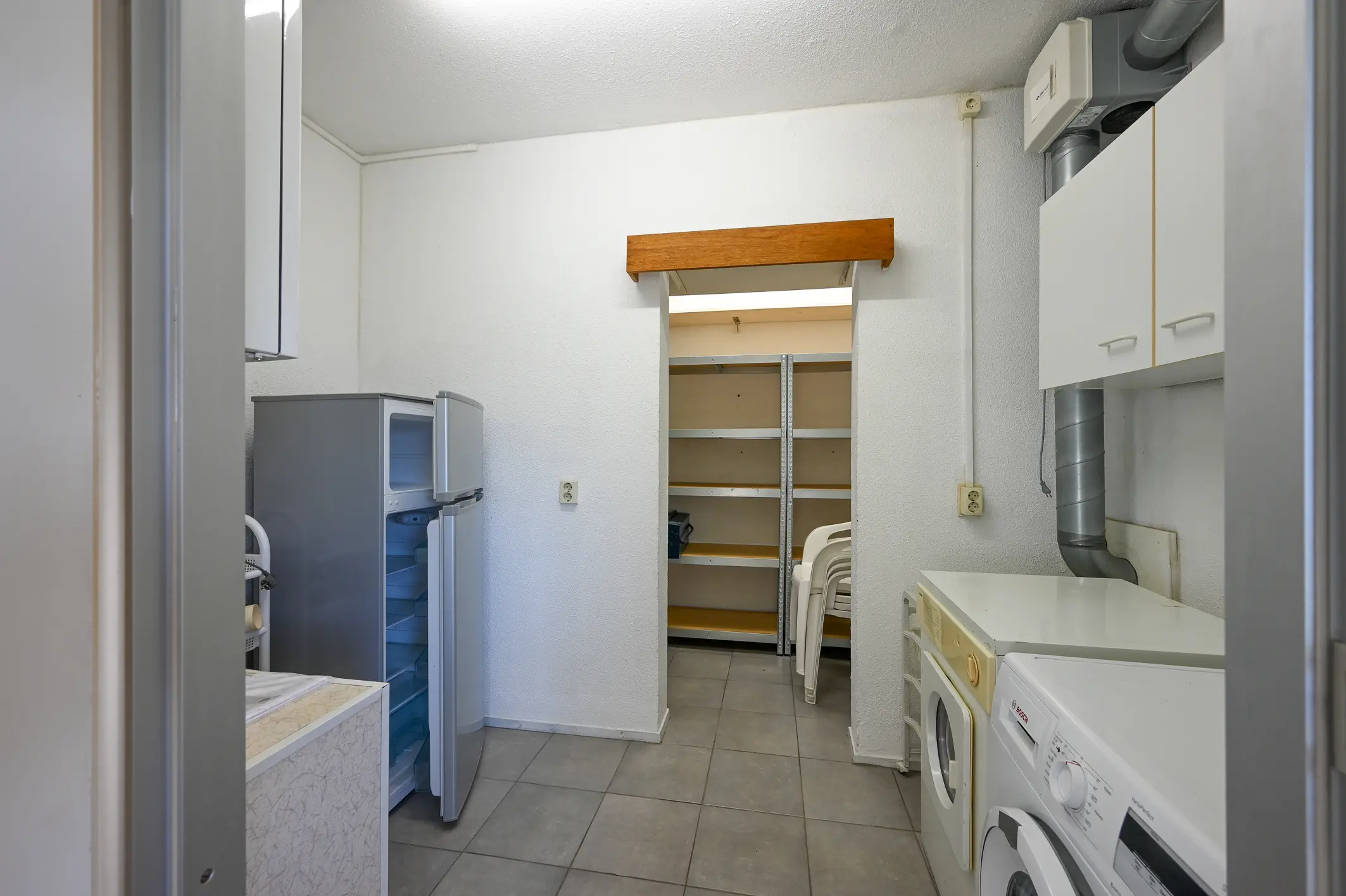 De halfopen keuken sluit aan op de woonkamer en is voorzien van diverse inbouwapparatuur: een vaatwasser, elektrische kookplaat met afzuigkap, koel-vriescombinatie en oven. Vanuit de keuken bereikt u de technische ruimte, waar zich de cv-ketel (2018) en de mechanische ventilatie bevinden. Aangrenzend bevindt zich nog een extra bergruimte, ideaal te gebruiken als bijkeuken of voorraadkast.