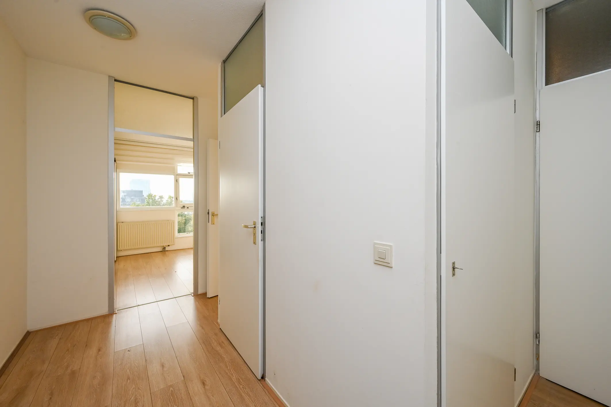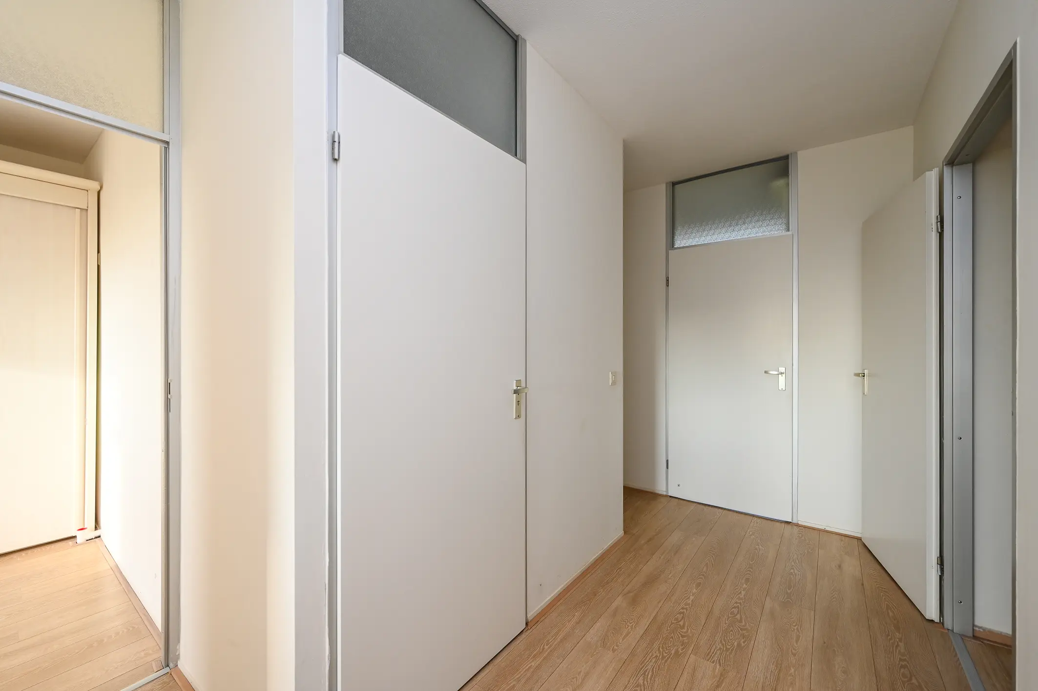 De hal, gelegen achter de woonkamer, geeft toegang tot drie slaapkamers, de badkamer en het separate toilet.