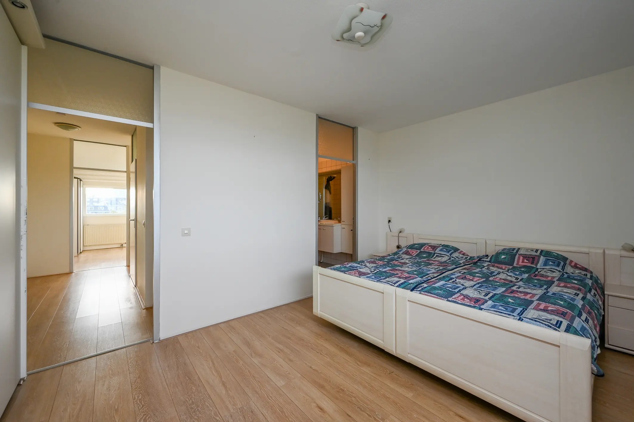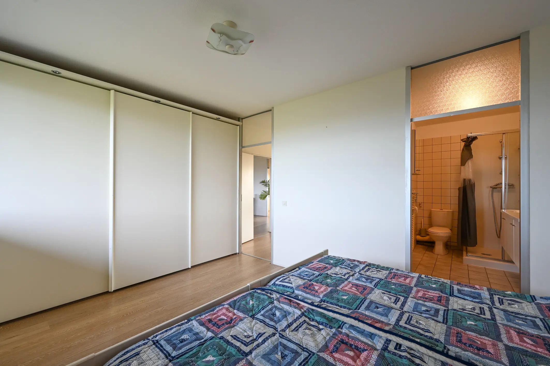 De master bedroom aan de achterzijde is ruim en licht, beschikt over een vaste kast en biedt direct toegang tot de badkamer. Deze is tevens bereikbaar vanuit de hal en is compleet uitgerust met een douchecabine, wastafelmeubel met opbergruimte en een tweede toilet.