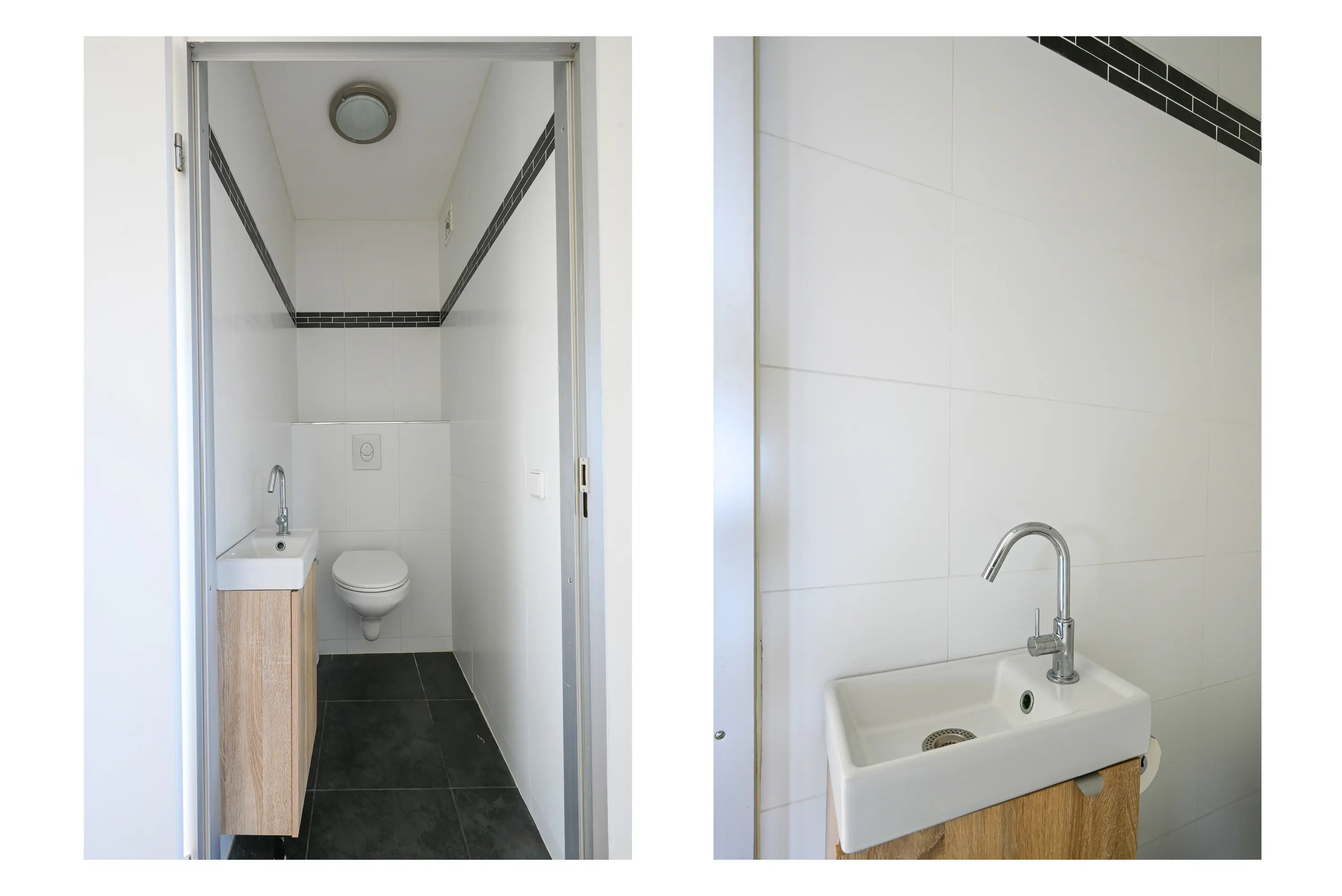 Het aparte gastentoilet is modern uitgevoerd en voorzien van een wandcloset.