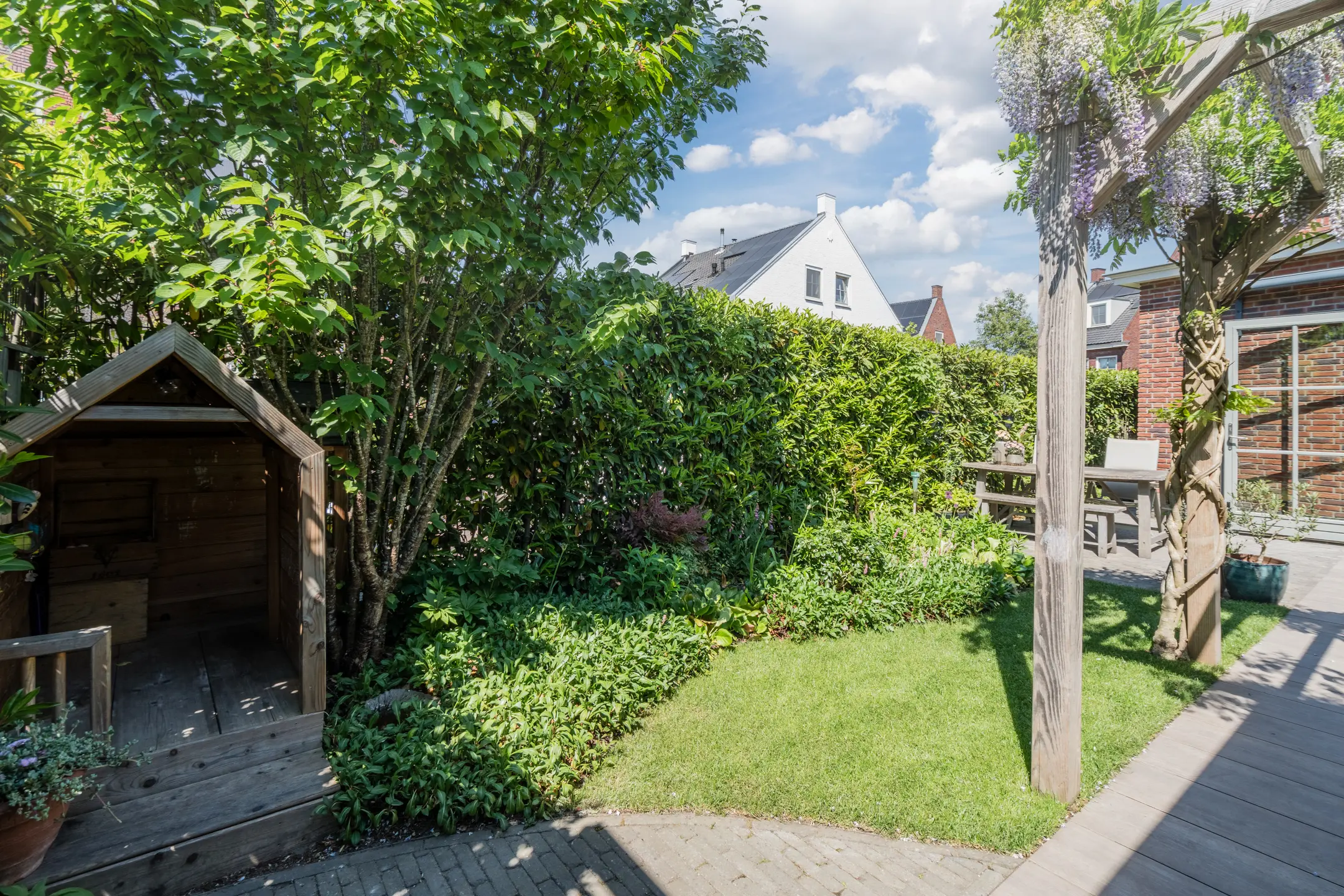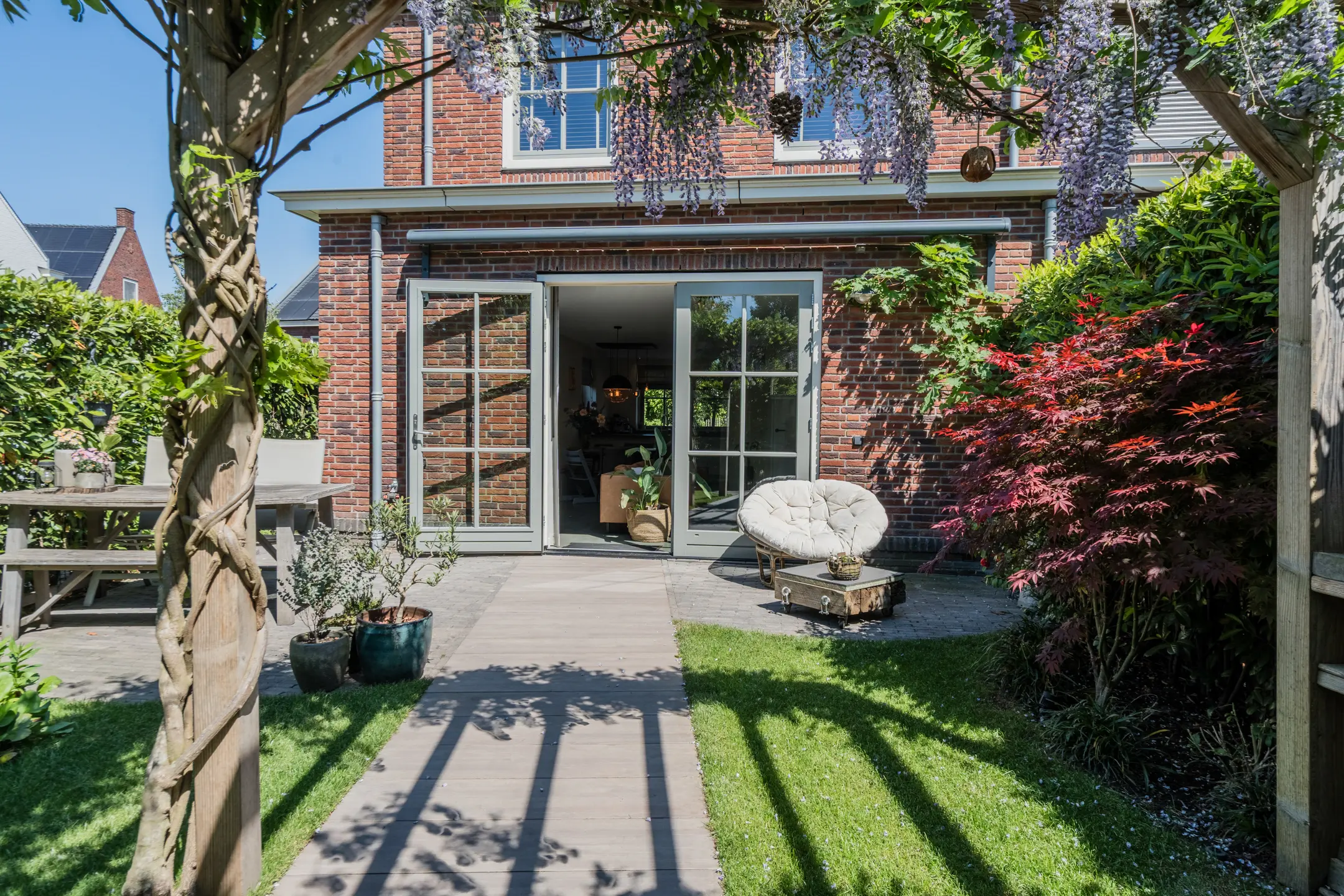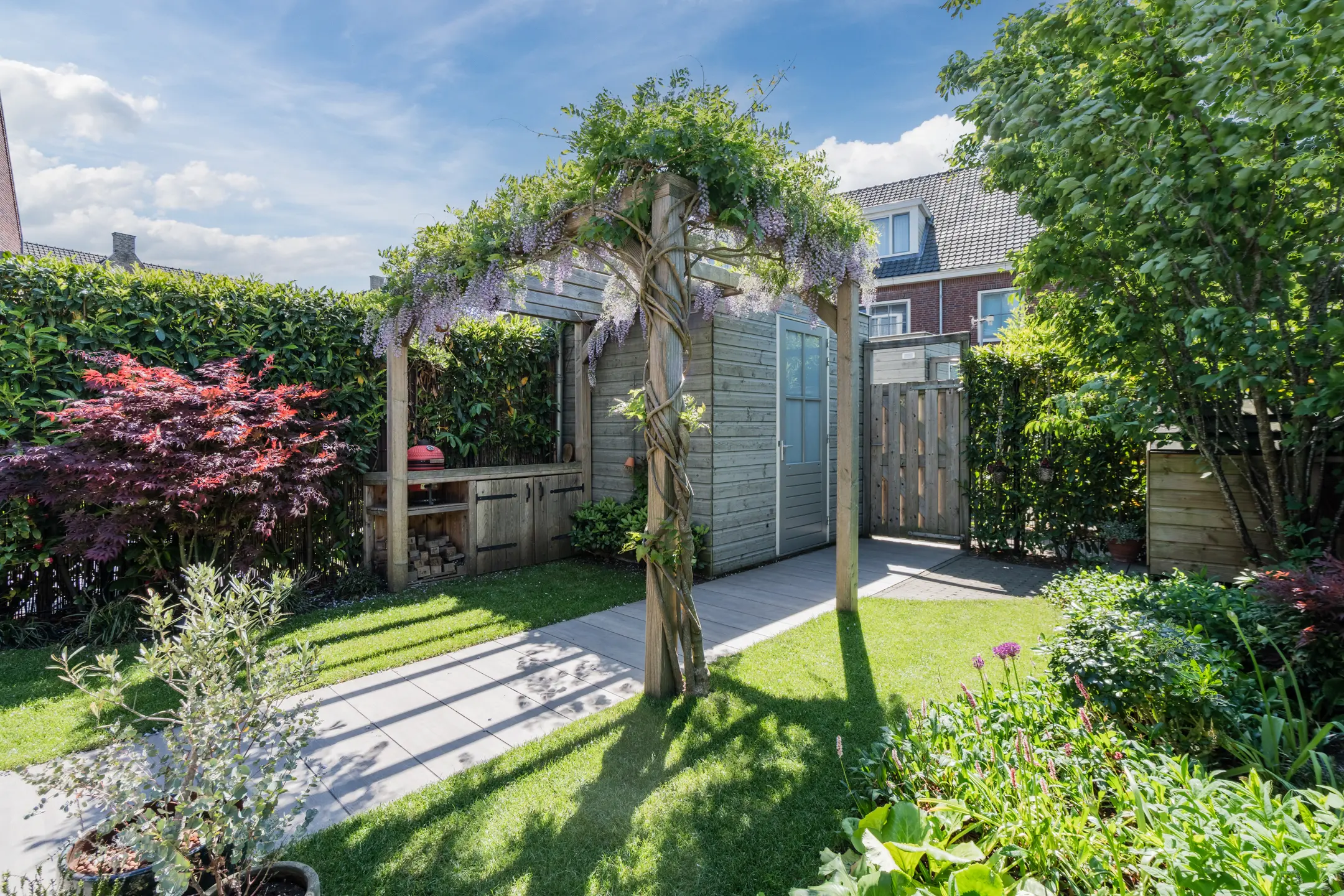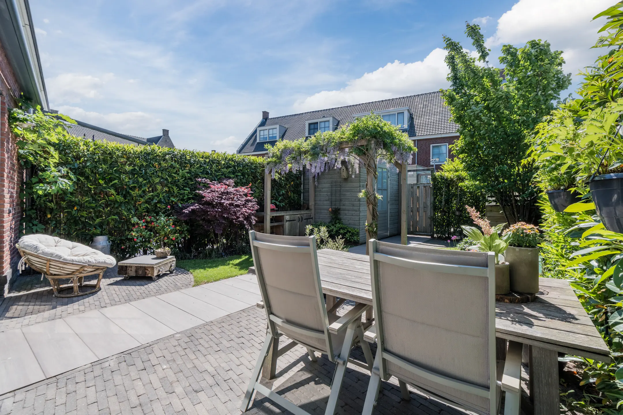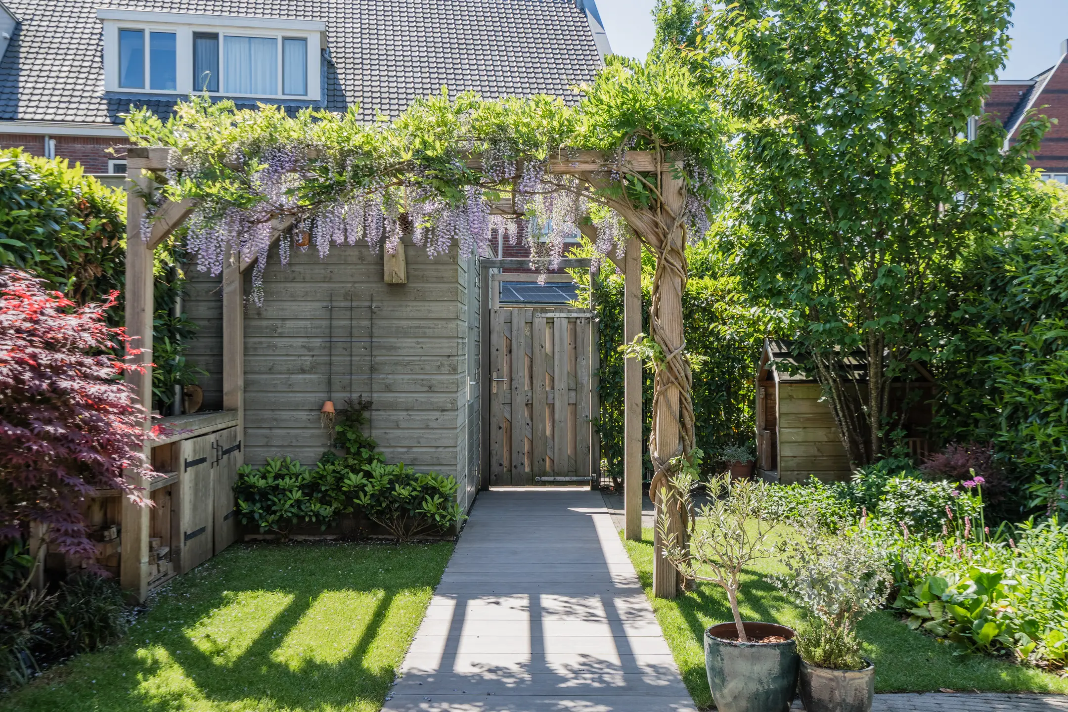 De tuin ligt rondom de woning en biedt door de ligging op het zuidwesten volop zon en privacy. De achter- en zijtuin zijn verzorgd aangelegd en voorzien van een elektrisch zonnescherm en automatisch bewateringssysteem. Achterin staat een vrijstaande houten berging met elektra en een duurzaam sedumdak.