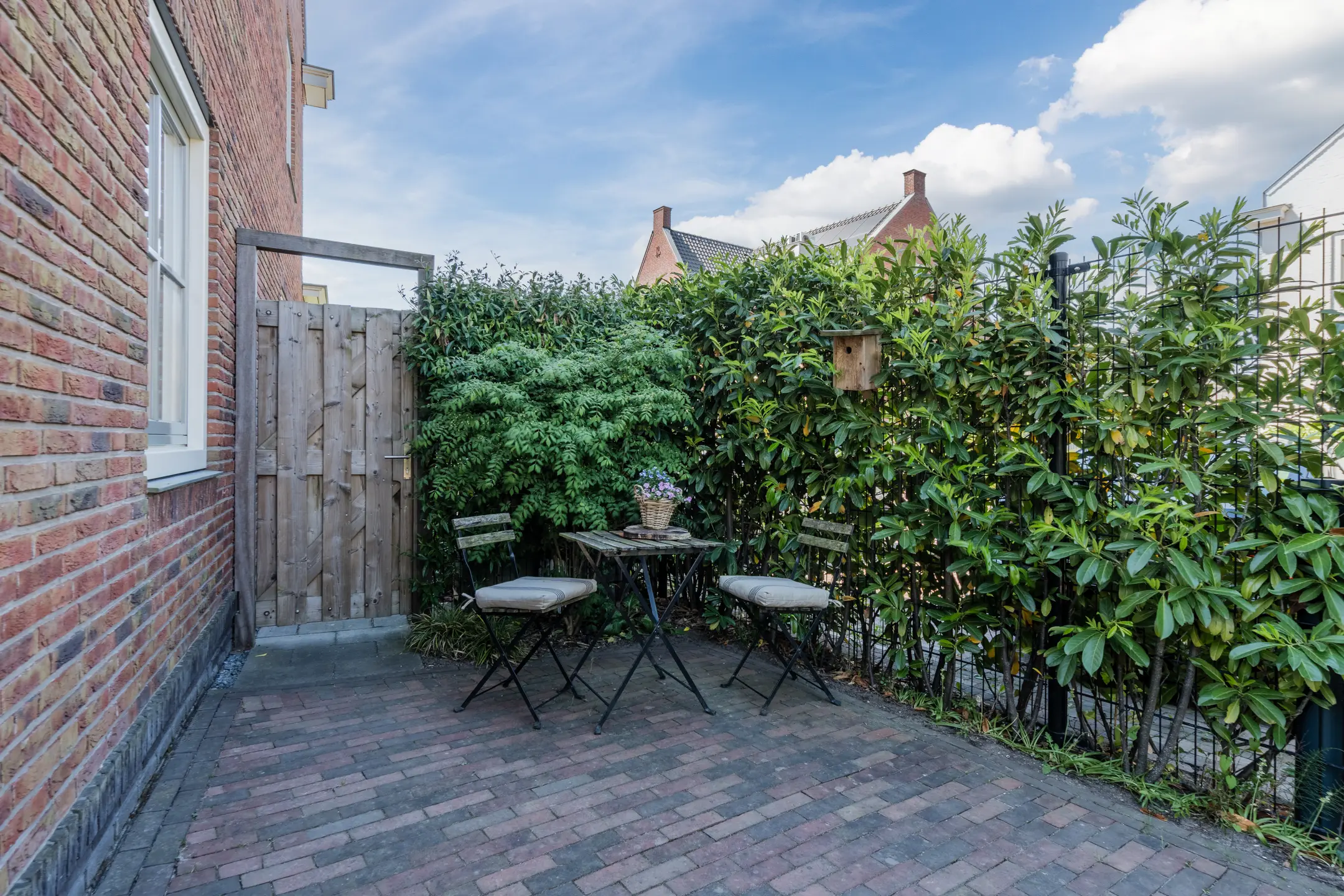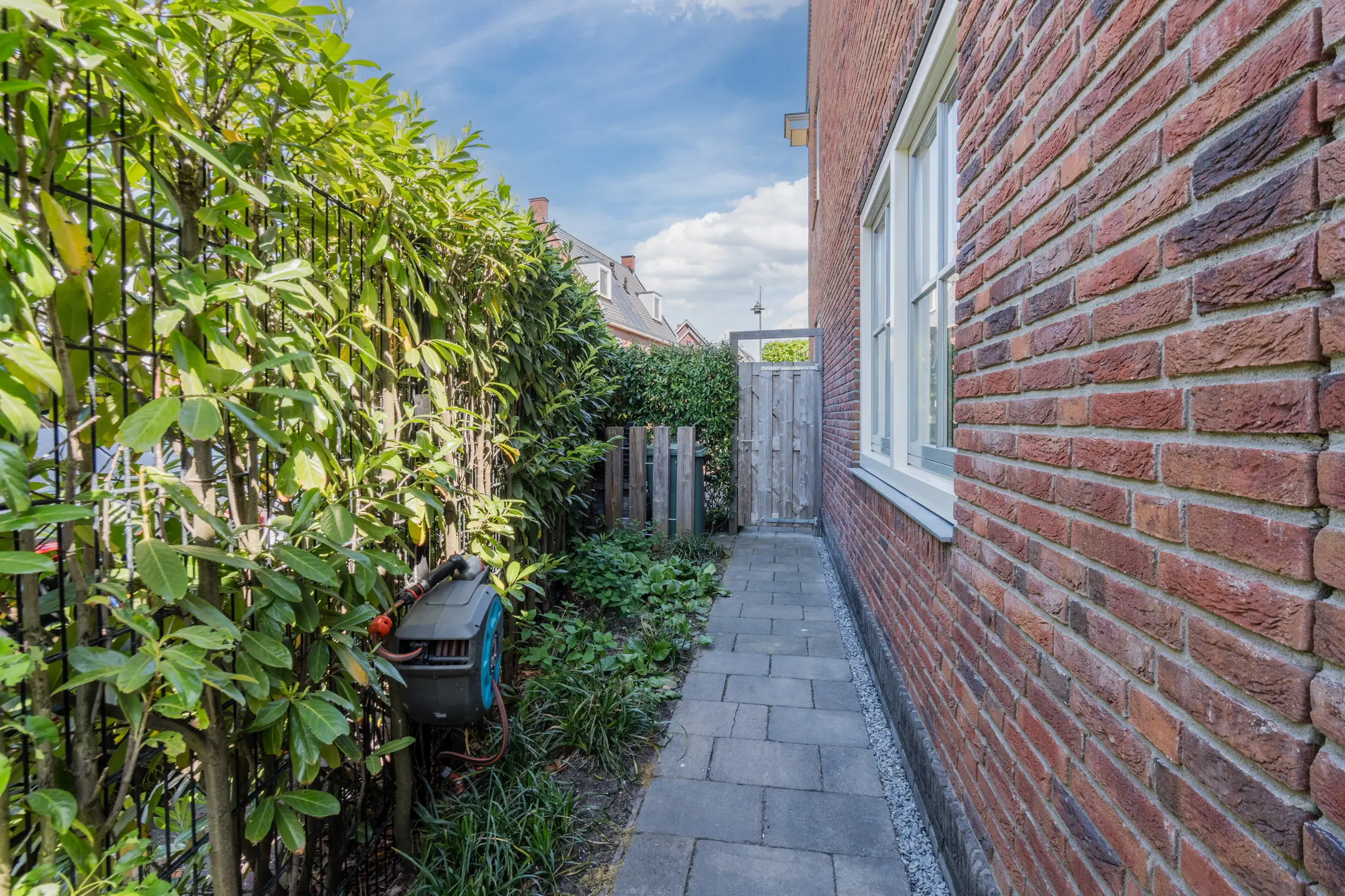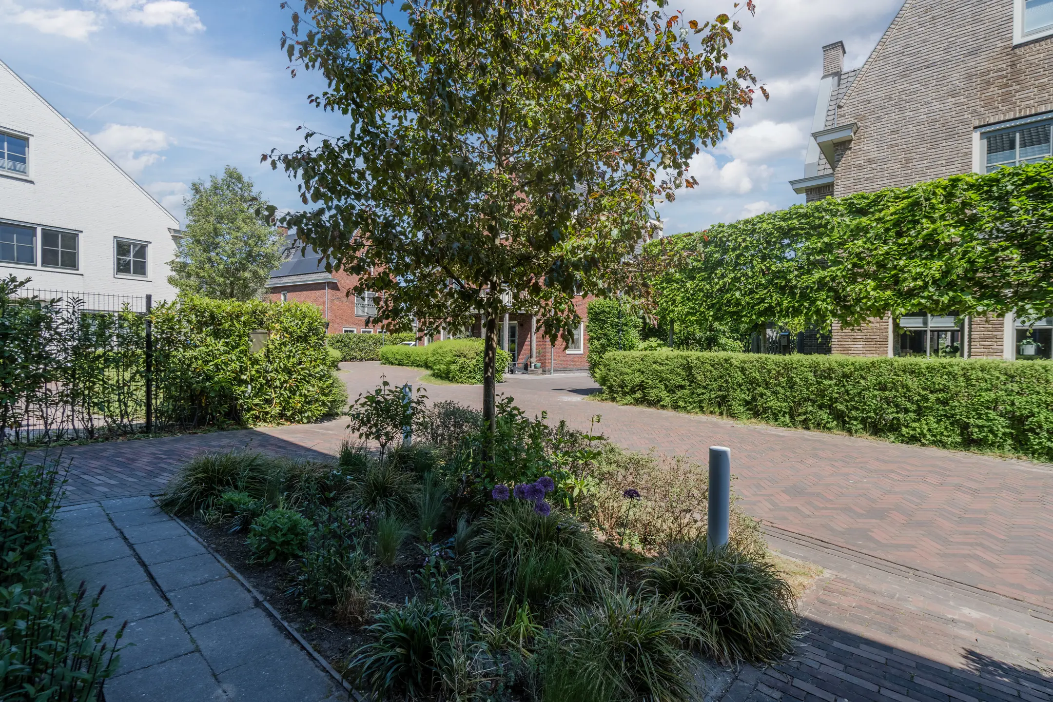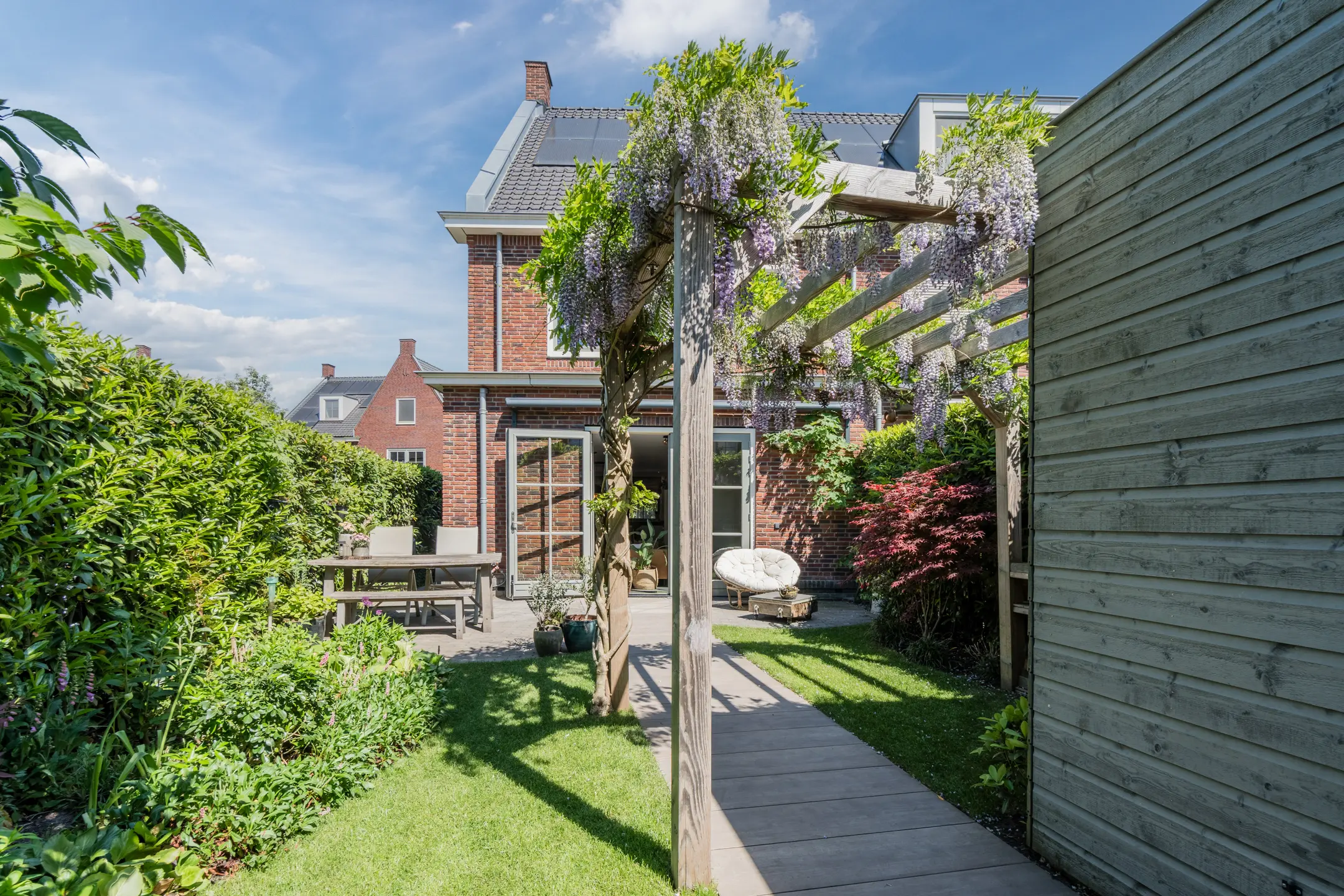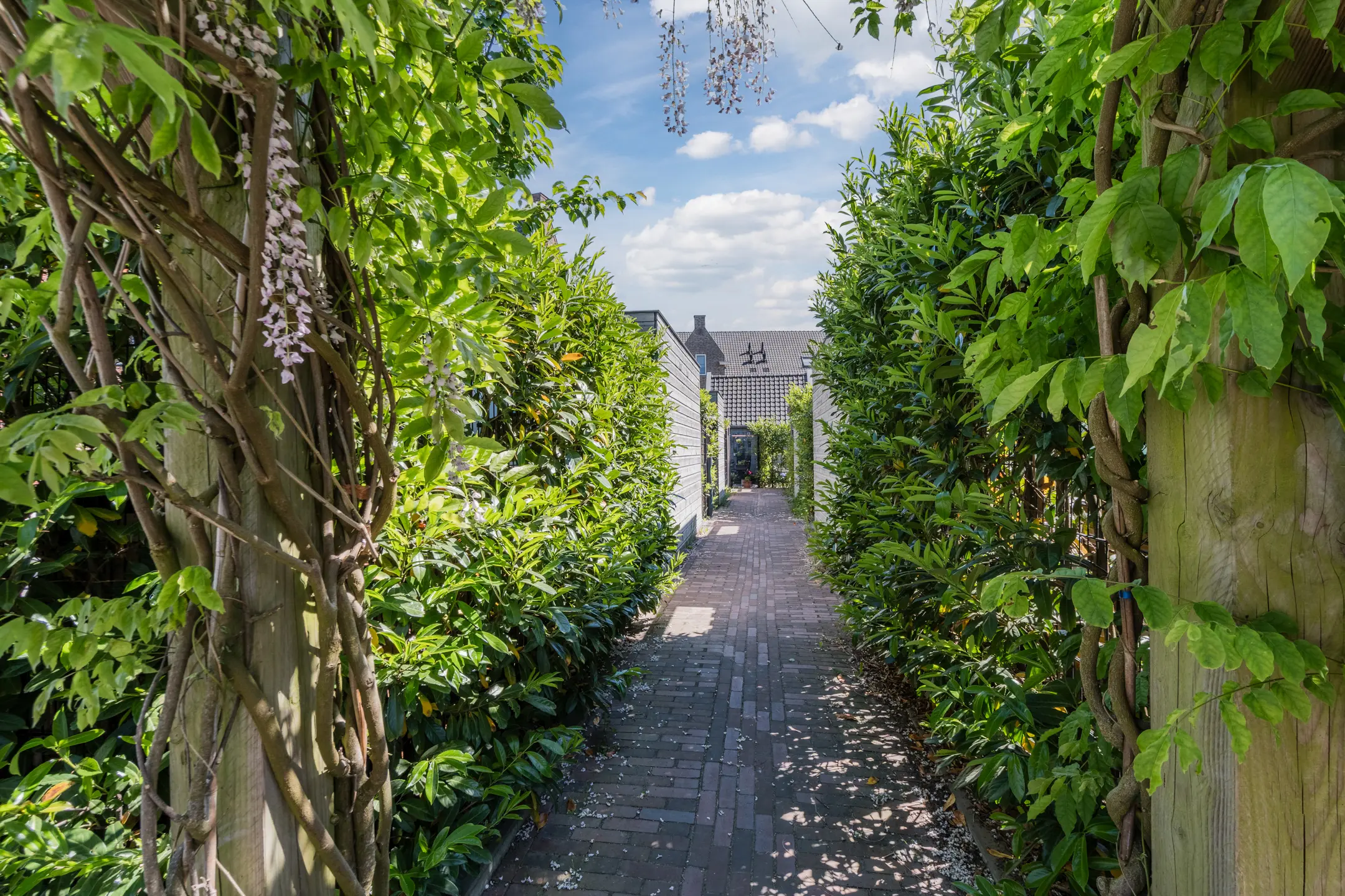 De tuin ligt rondom de woning en biedt door de ligging op het zuidwesten volop zon en privacy. De achter- en zijtuin zijn verzorgd aangelegd en voorzien van een elektrisch zonnescherm en automatisch bewateringssysteem. Achterin staat een vrijstaande houten berging met elektra en een duurzaam sedumdak.