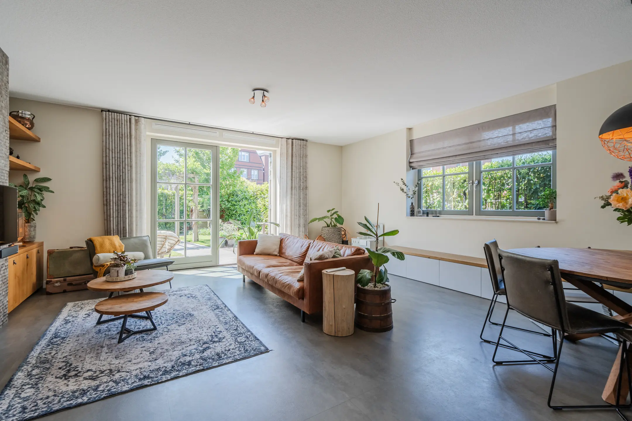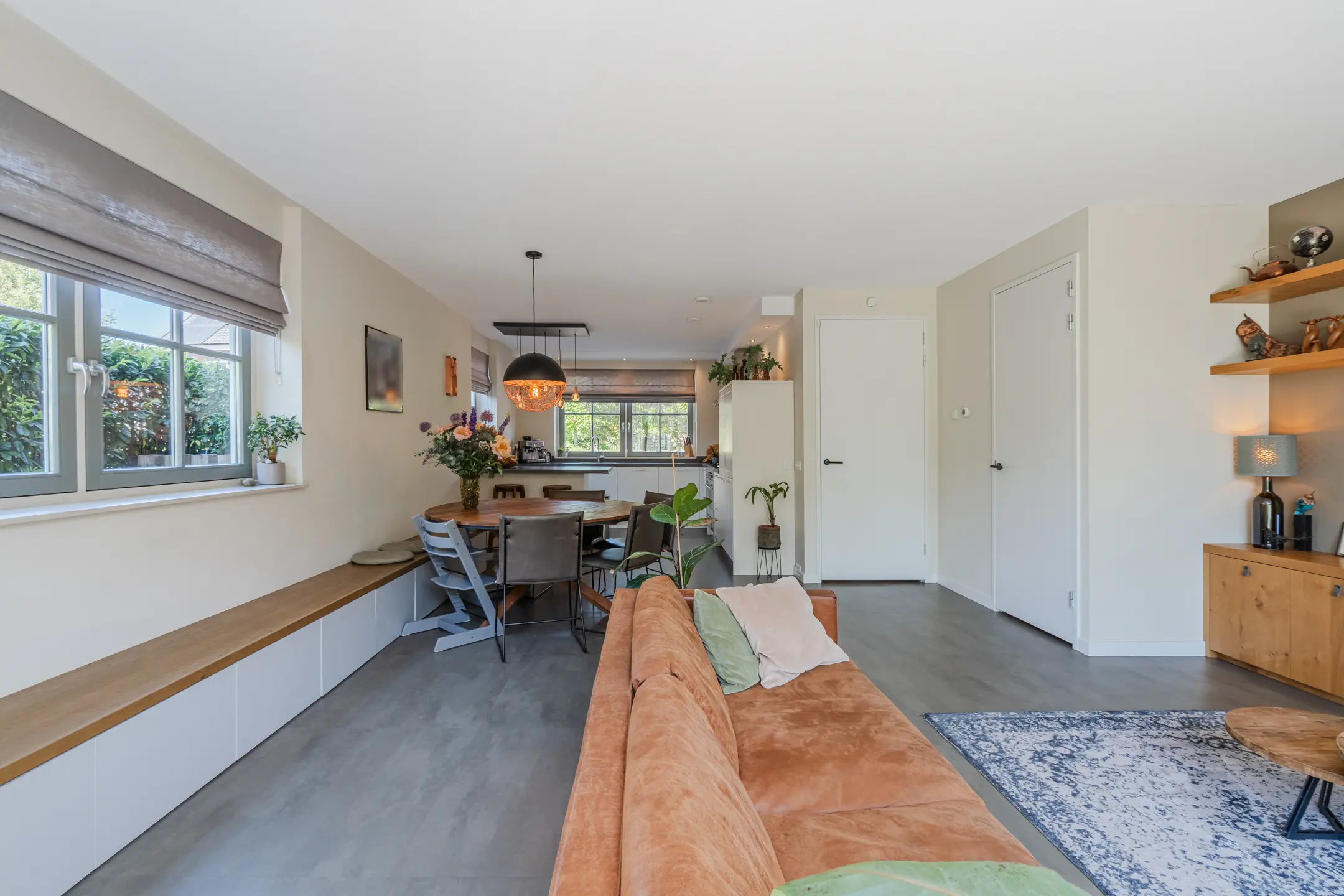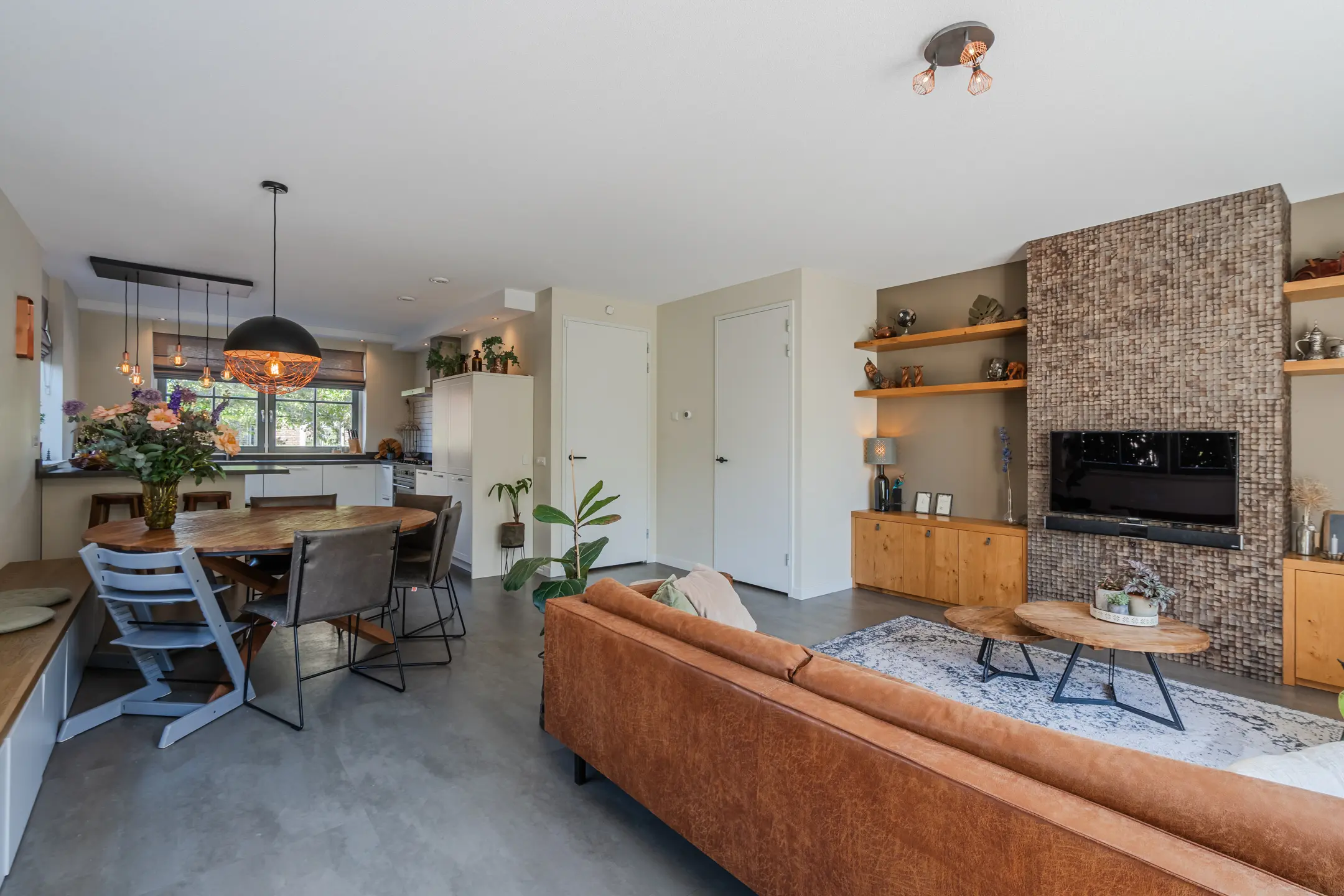 De woonkamer is royaal en bijzonder licht door de grote raampartijen aan voor-, zij- en achterzijde. De strak afgewerkte wanden, het geïntegreerde tv-meubel en de grijze pvc-tegelvloer met comfortabele vloerverwarming zorgen voor een stijlvolle en warme uitstraling.
