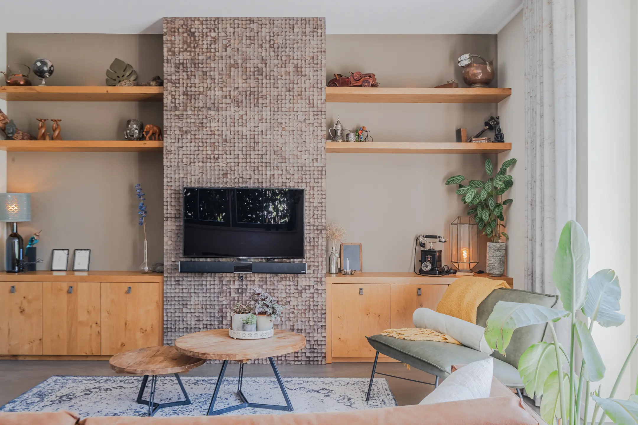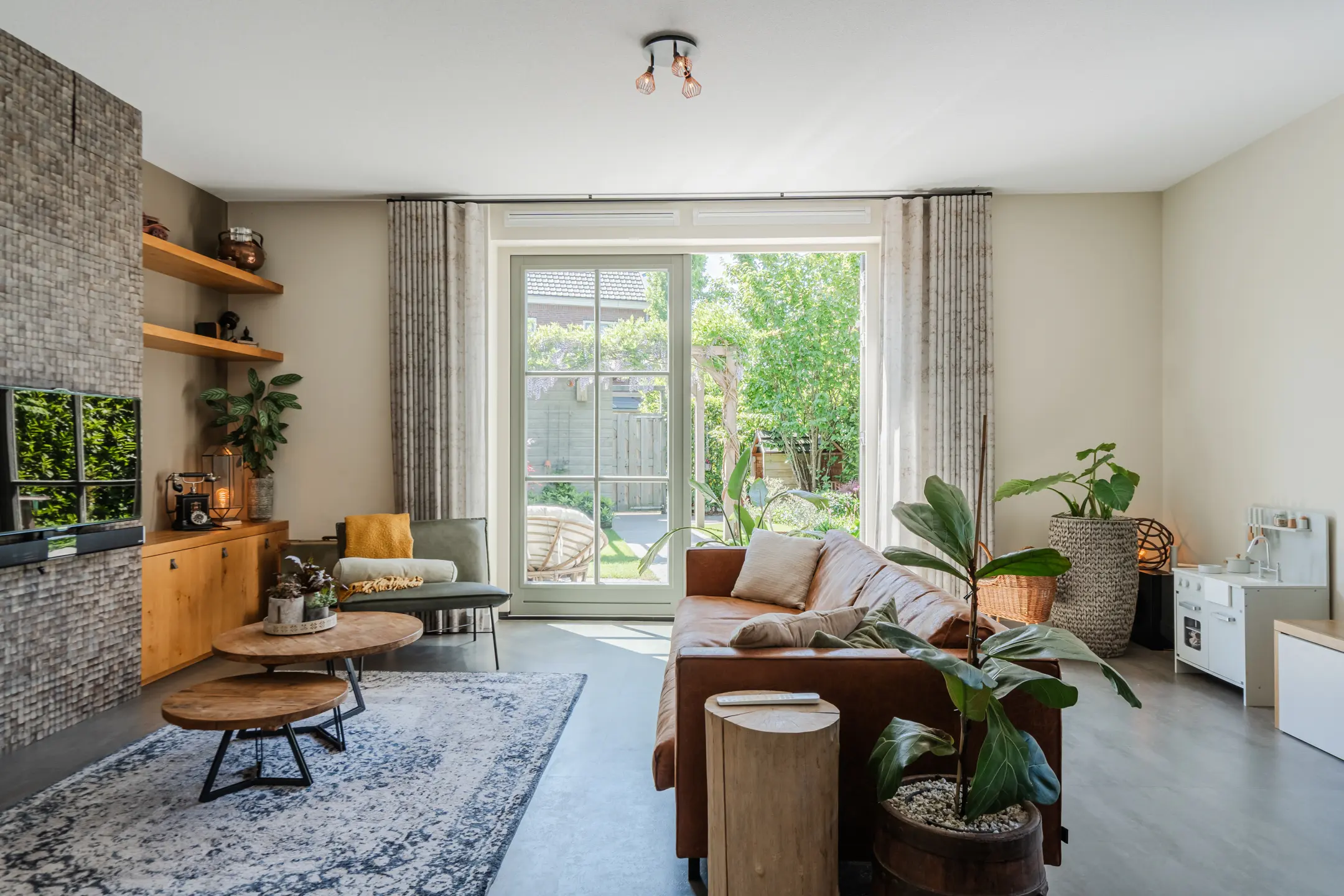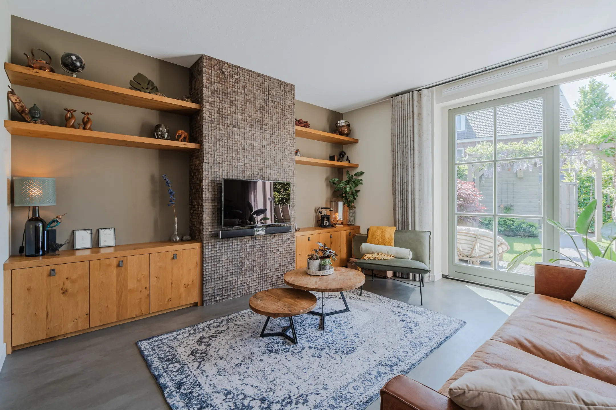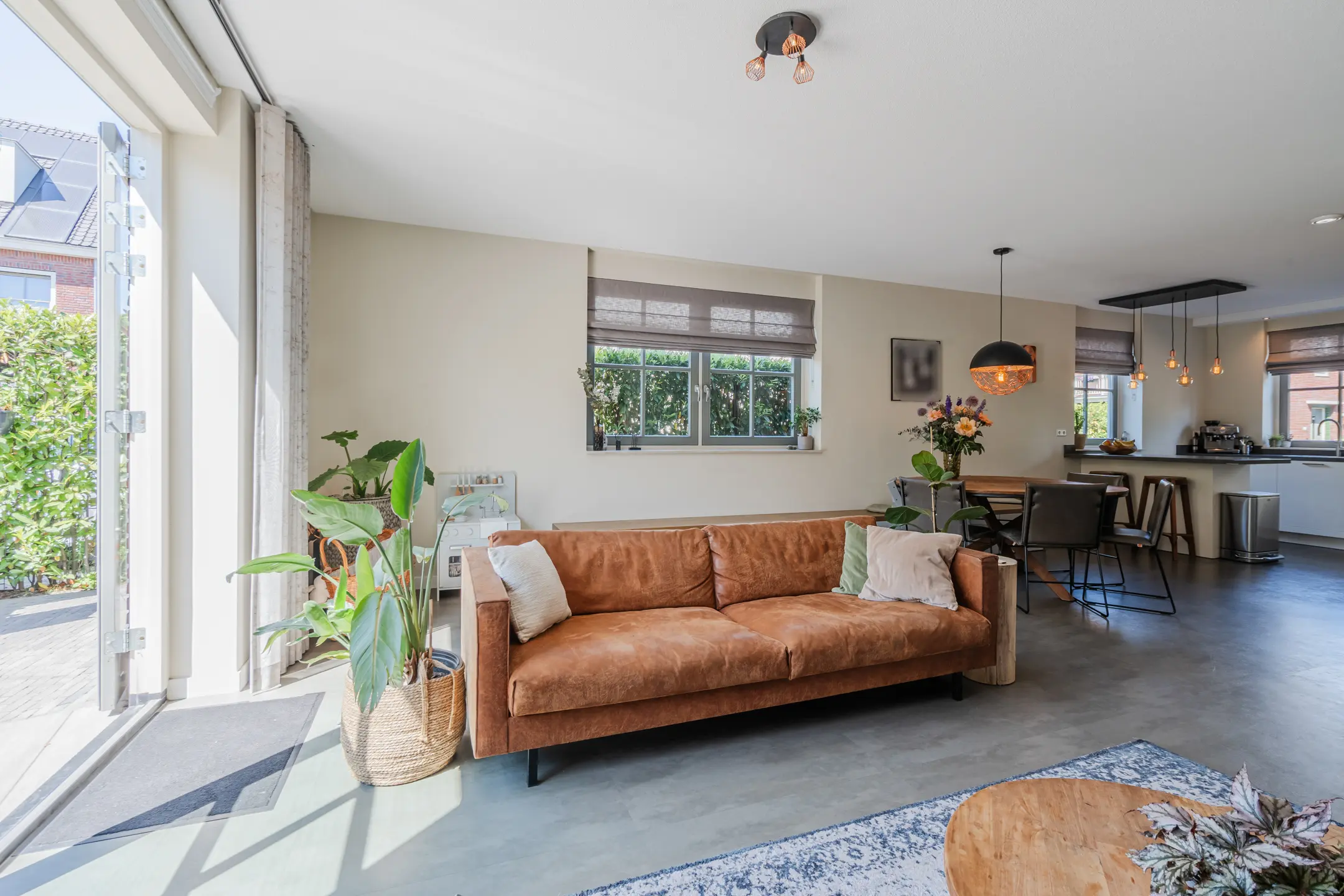 De woonkamer is royaal en bijzonder licht door de grote raampartijen aan voor-, zij- en achterzijde. De strak afgewerkte wanden, het geïntegreerde tv-meubel en de grijze pvc-tegelvloer met comfortabele vloerverwarming zorgen voor een stijlvolle en warme uitstraling.