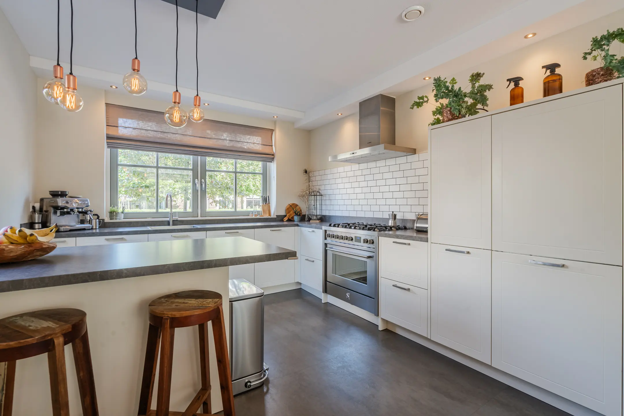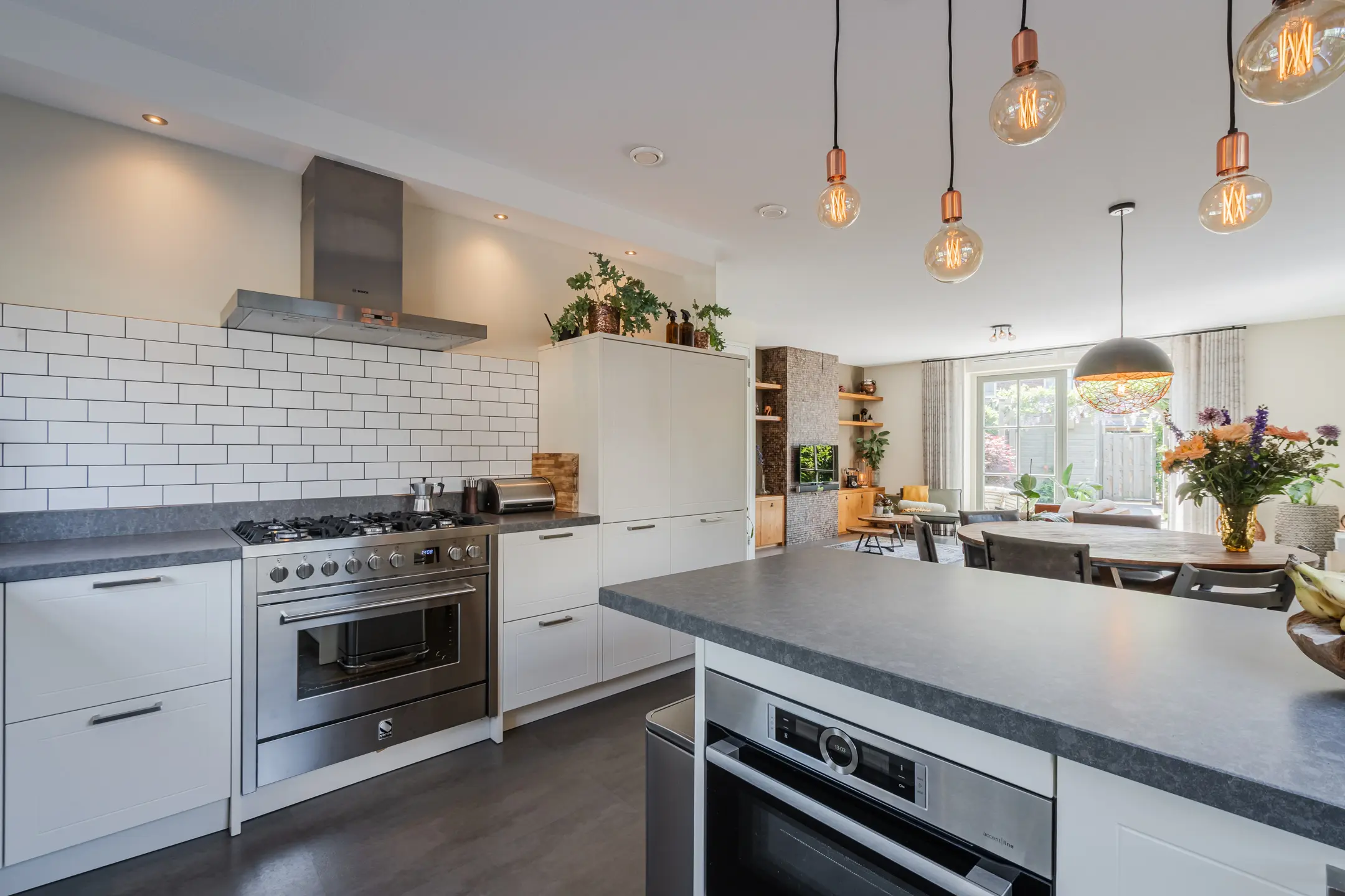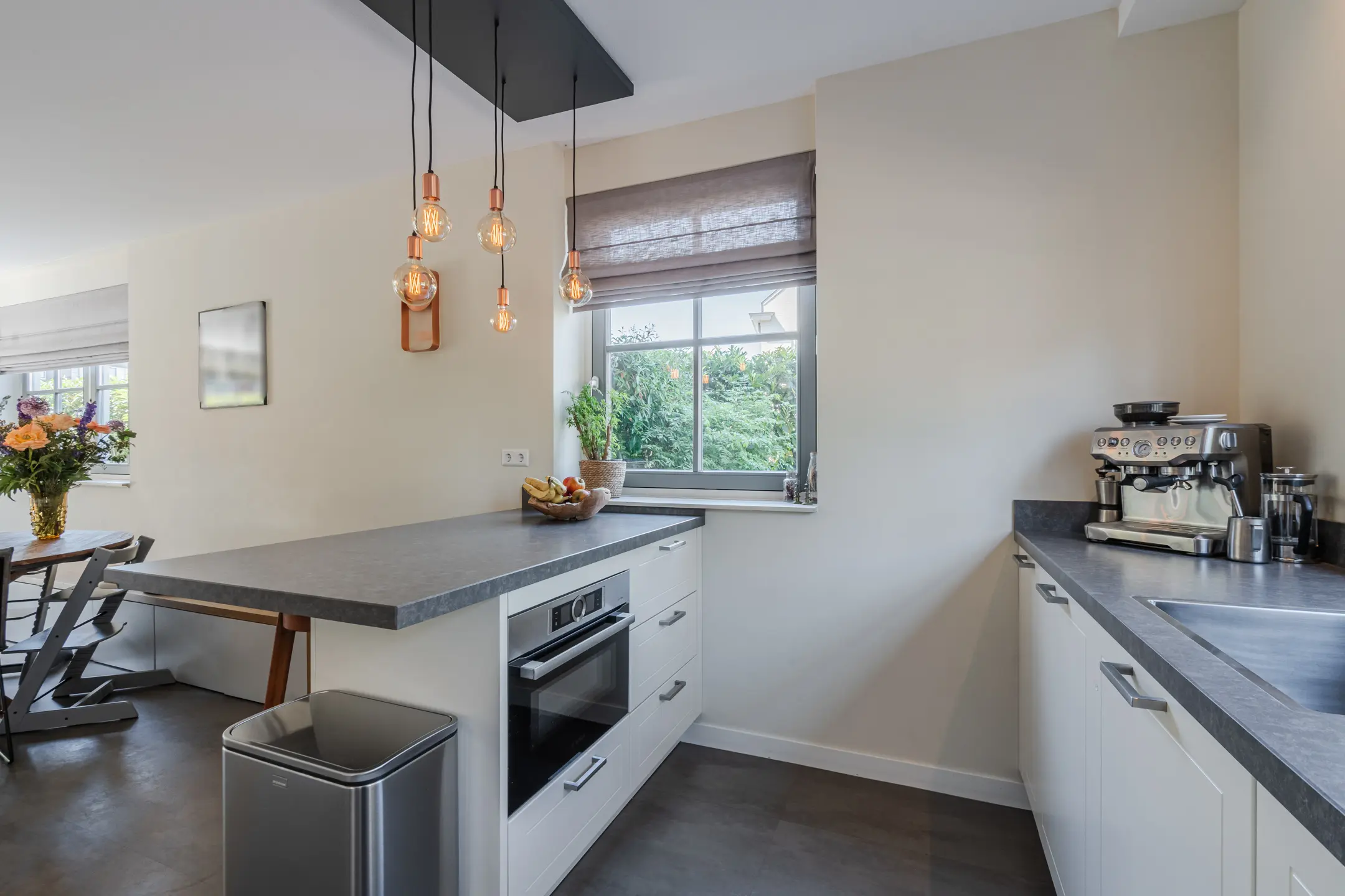 Aan de voorzijde bevindt zich de moderne keuken in L-opstelling met schiereiland. Deze is uitgevoerd met een composiet werkblad en voorzien van hoogwaardige apparatuur, waaronder een 6-pits gasfornuis met oven, combi-oven/magnetron, vaatwasser, koel-vriescombinatie, afzuigkap en Quooker.