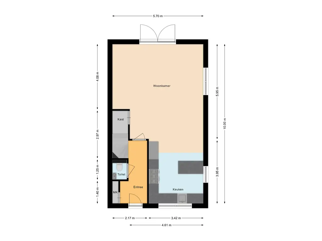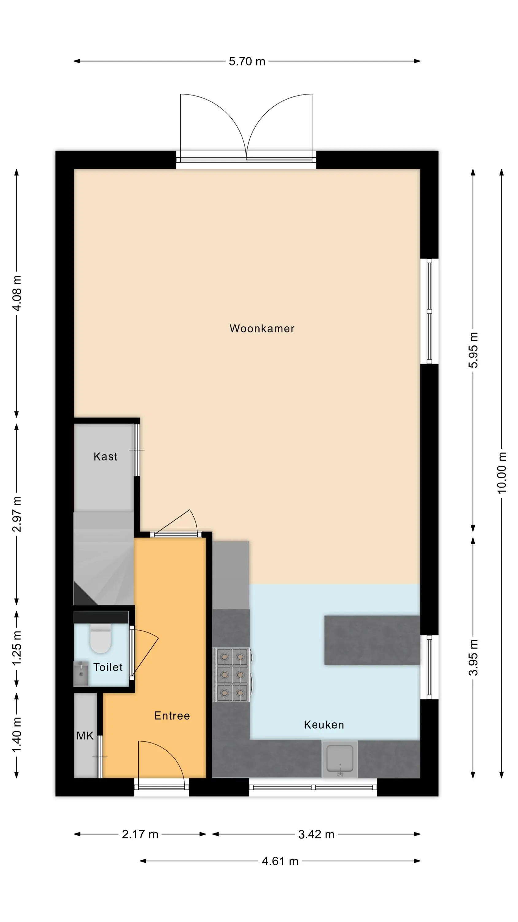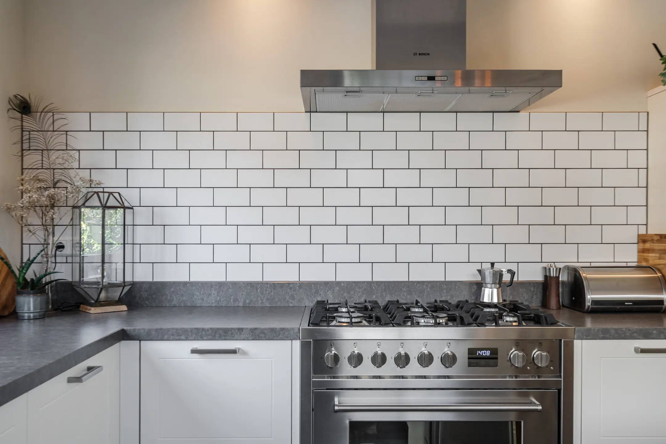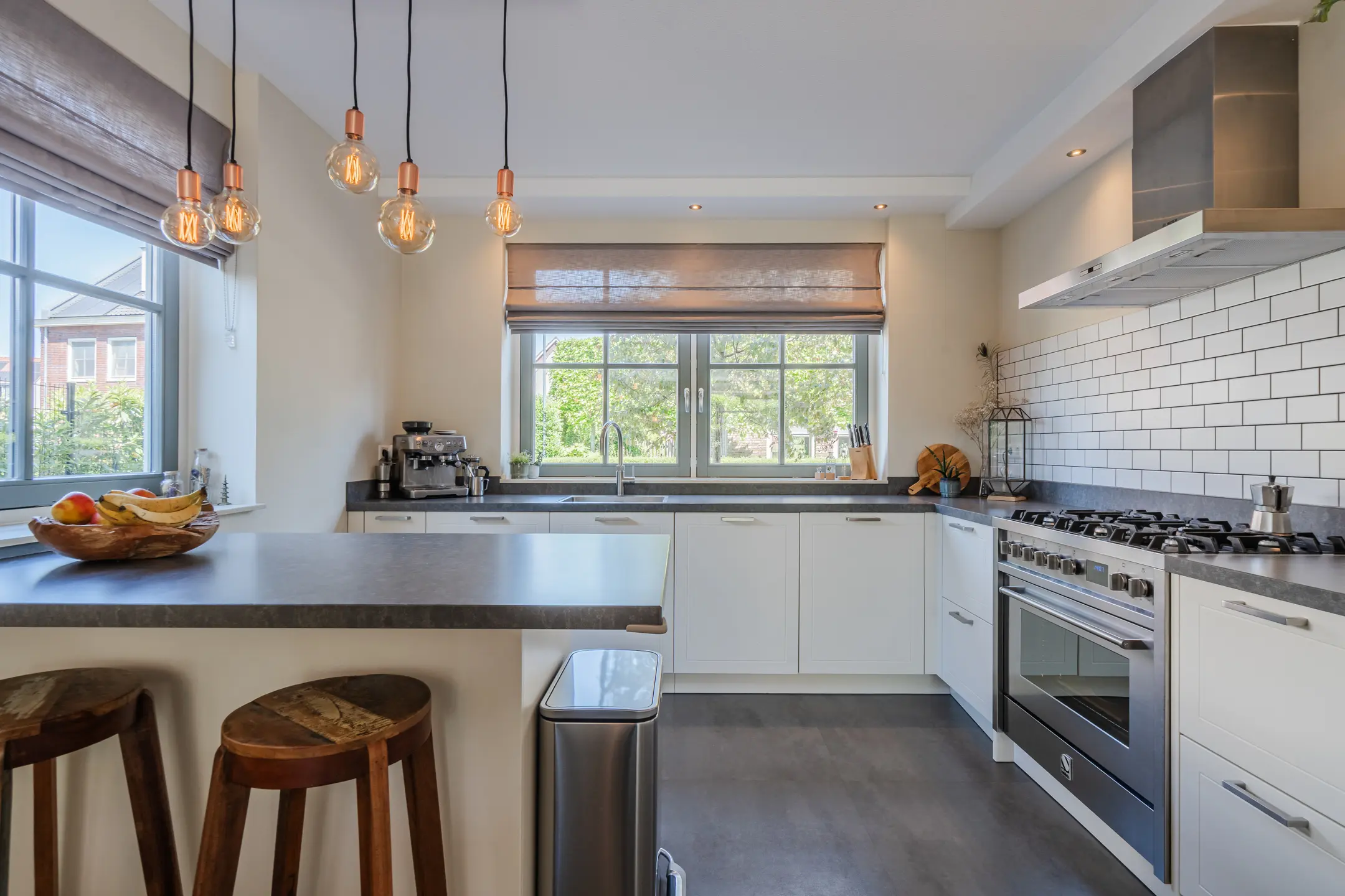 Aan de voorzijde bevindt zich de moderne keuken in L-opstelling met schiereiland. Deze is uitgevoerd met een composiet werkblad en voorzien van hoogwaardige apparatuur, waaronder een 6-pits gasfornuis met oven, combi-oven/magnetron, vaatwasser, koel-vriescombinatie, afzuigkap en Quooker.