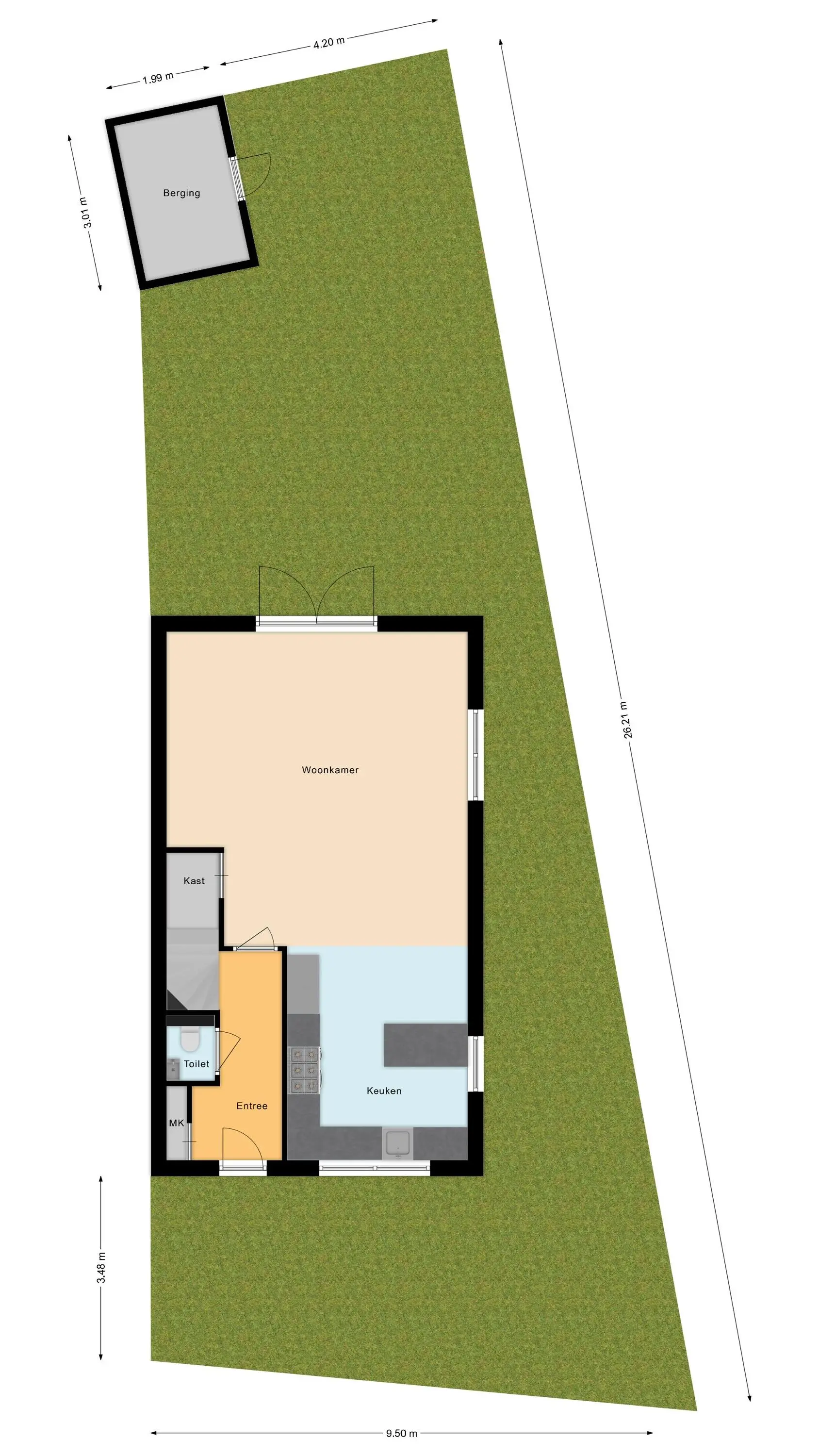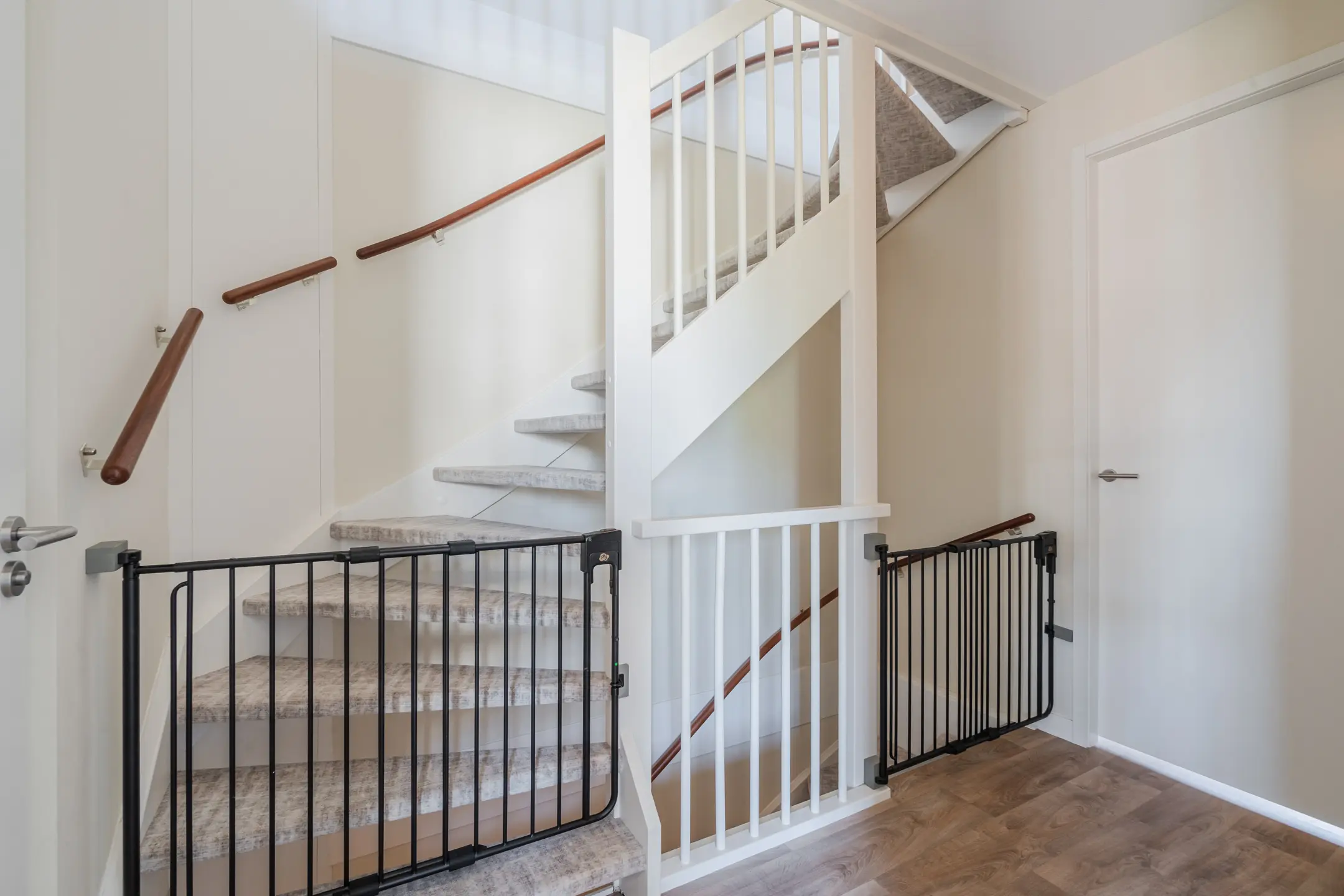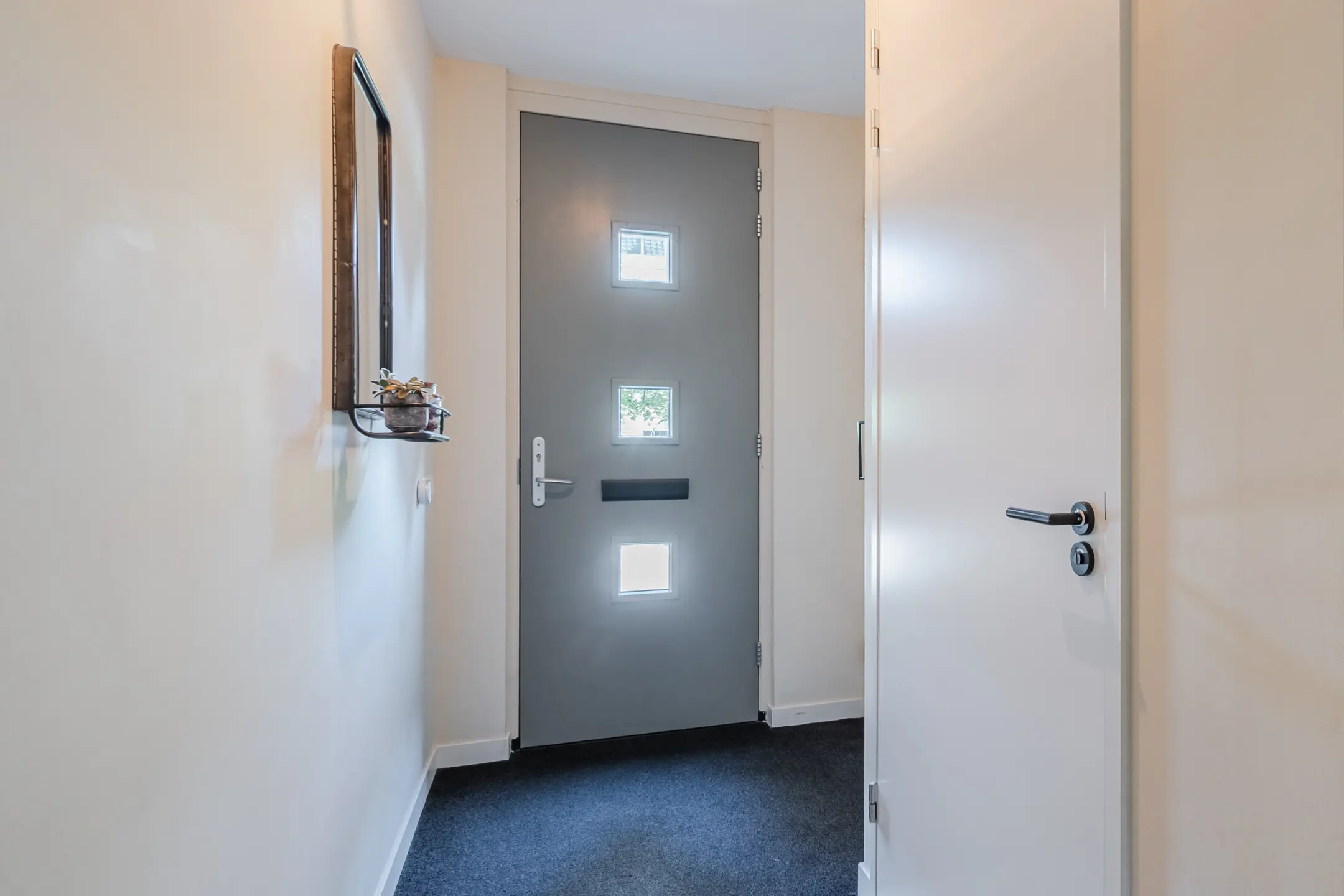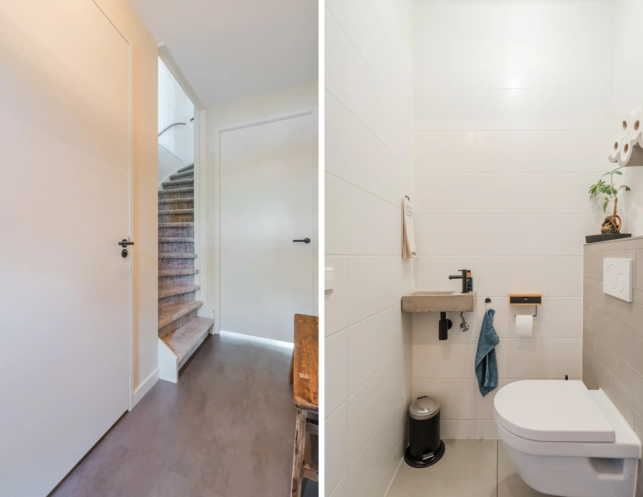 Bij aankomst valt direct de ruime opzet van het perceel op, met een eigen oprit naast de woning en een verzorgde voortuin. De entreehal verwelkomt je met een modern toilet, meterkast en trapopgang naar de verdieping.