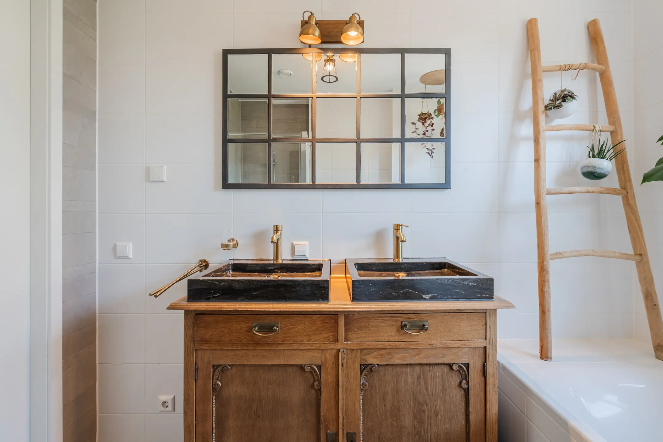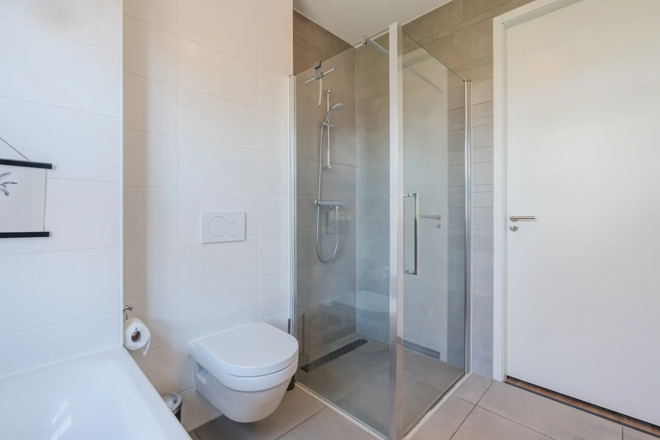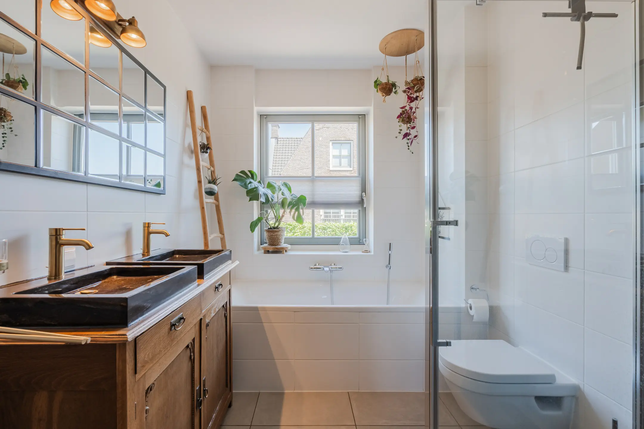 De badkamer is compleet en verzorgd uitgevoerd met een ligbad, cabinedouche, dubbele wastafel, toilet en mechanische ventilatie.