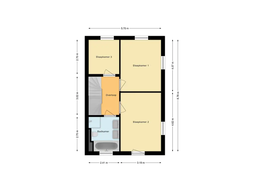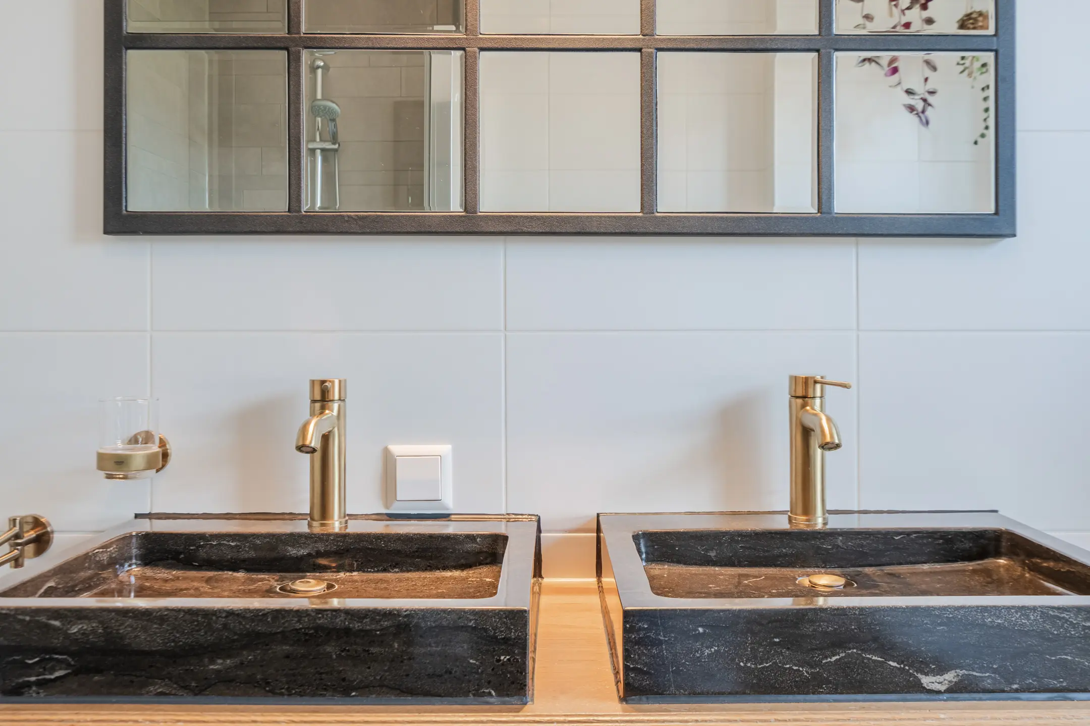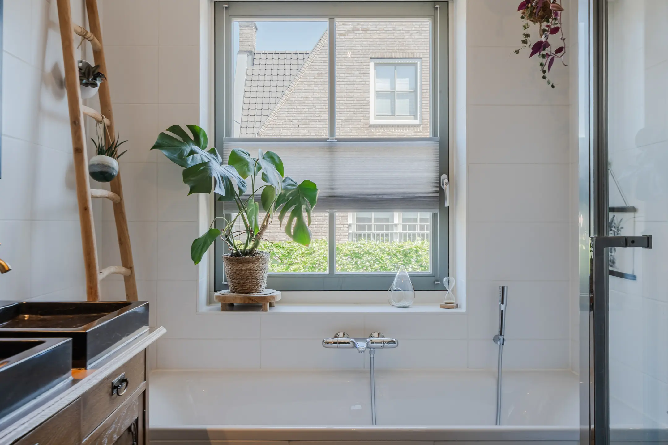 De badkamer is compleet en verzorgd uitgevoerd met een ligbad, cabinedouche, dubbele wastafel, toilet en mechanische ventilatie.