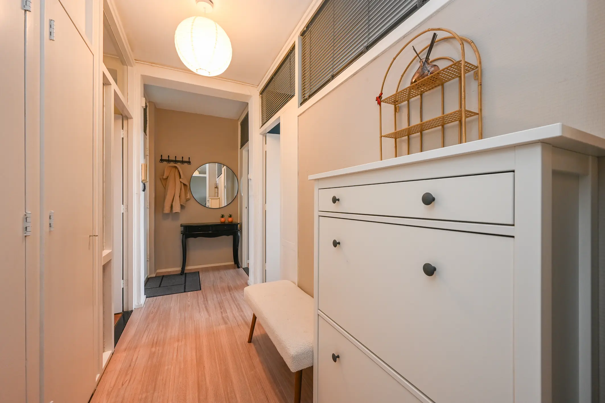 Bij binnenkomst kom je in de hal met meterkast en praktische kastruimte. Vanuit de hal zijn vrijwel alle vertrekken bereikbaar. Het toilet is netjes betegeld en verzorgd afgewerkt.
