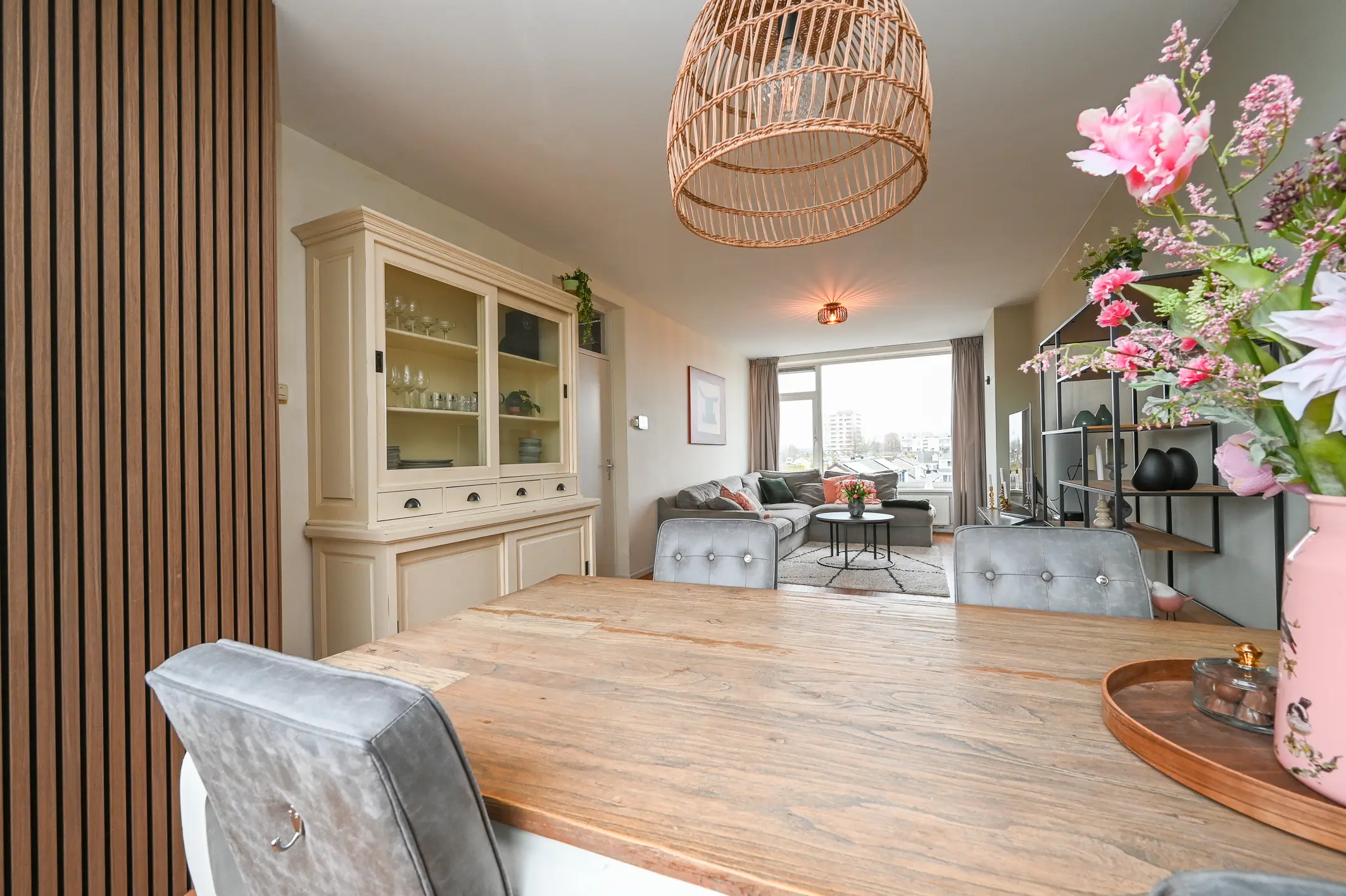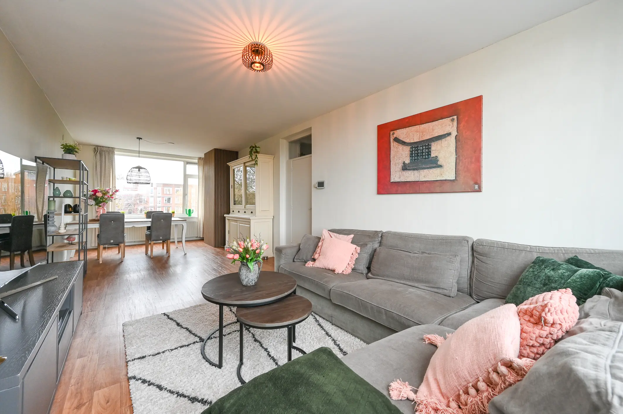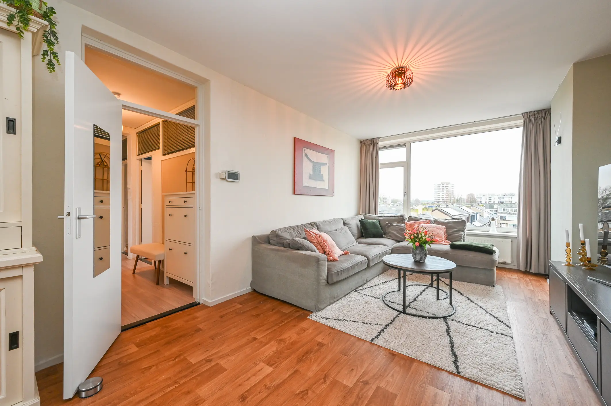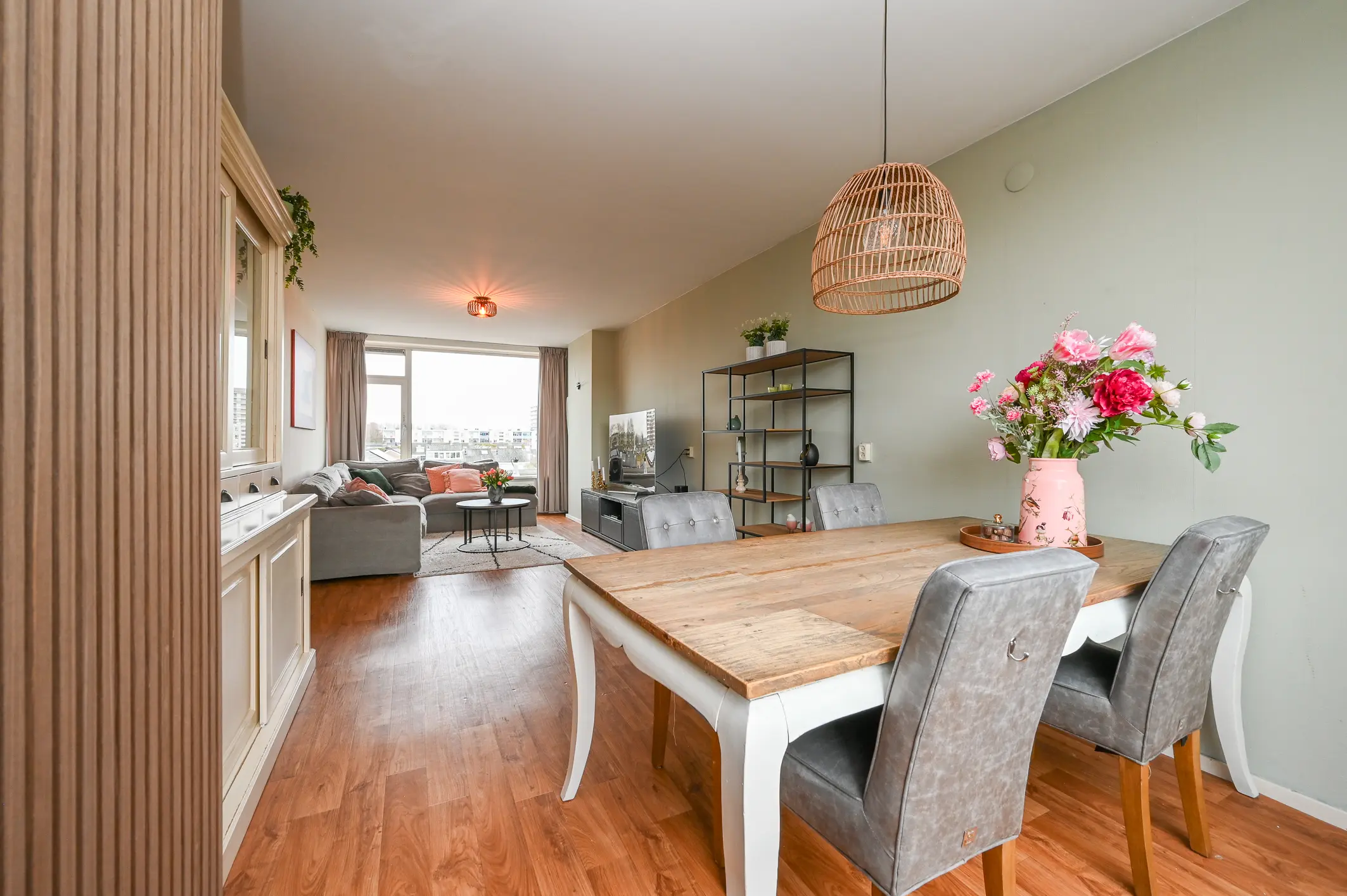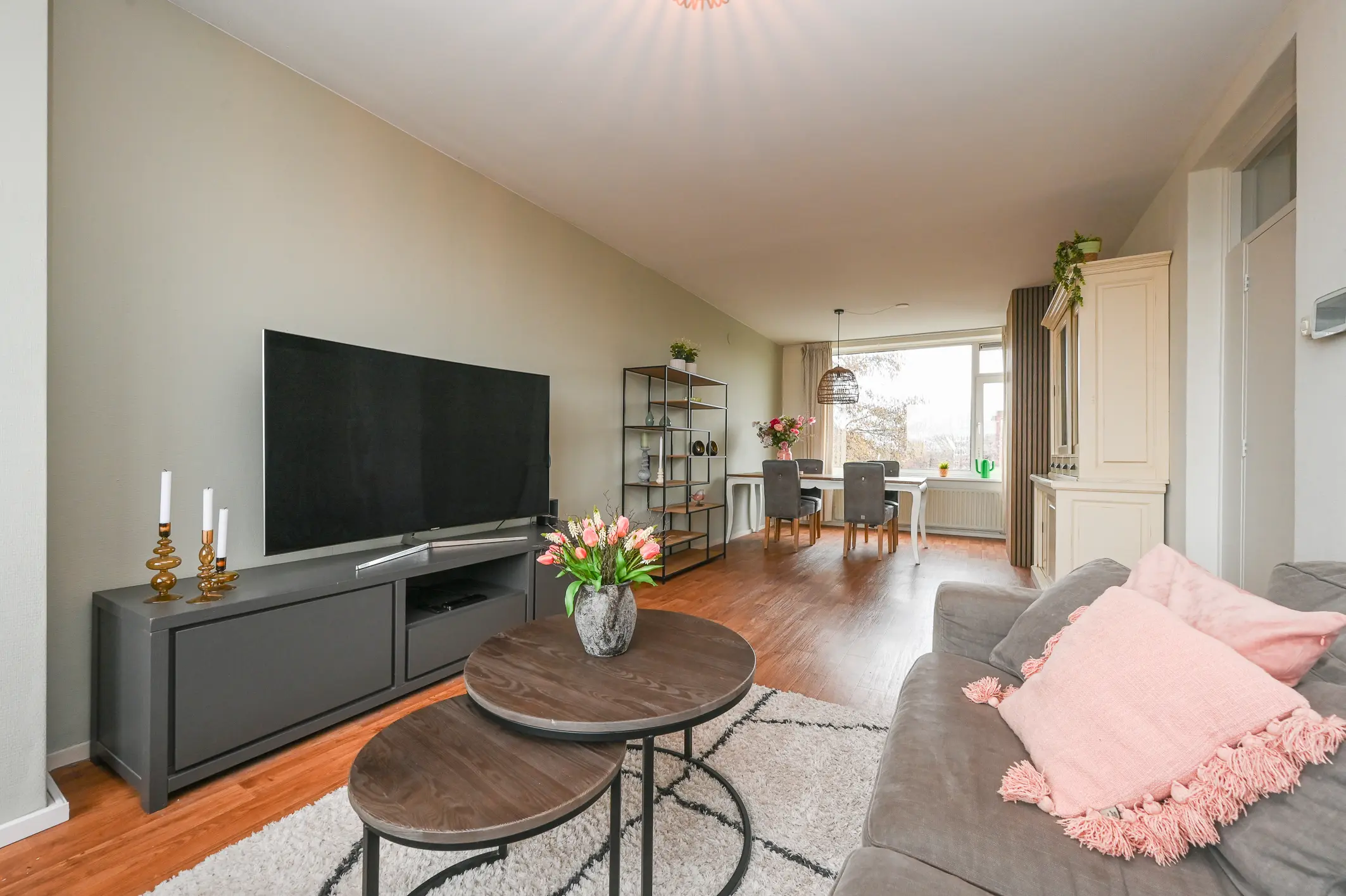 De woonkamer is opvallend ruim en bijzonder licht, mede dankzij de grote raampartijen aan beide zijden van het appartement. Hierdoor voelt de ruimte open en luchtig aan en is deze gemakkelijk in te delen met zowel een comfortabele zithoek als een eethoek.