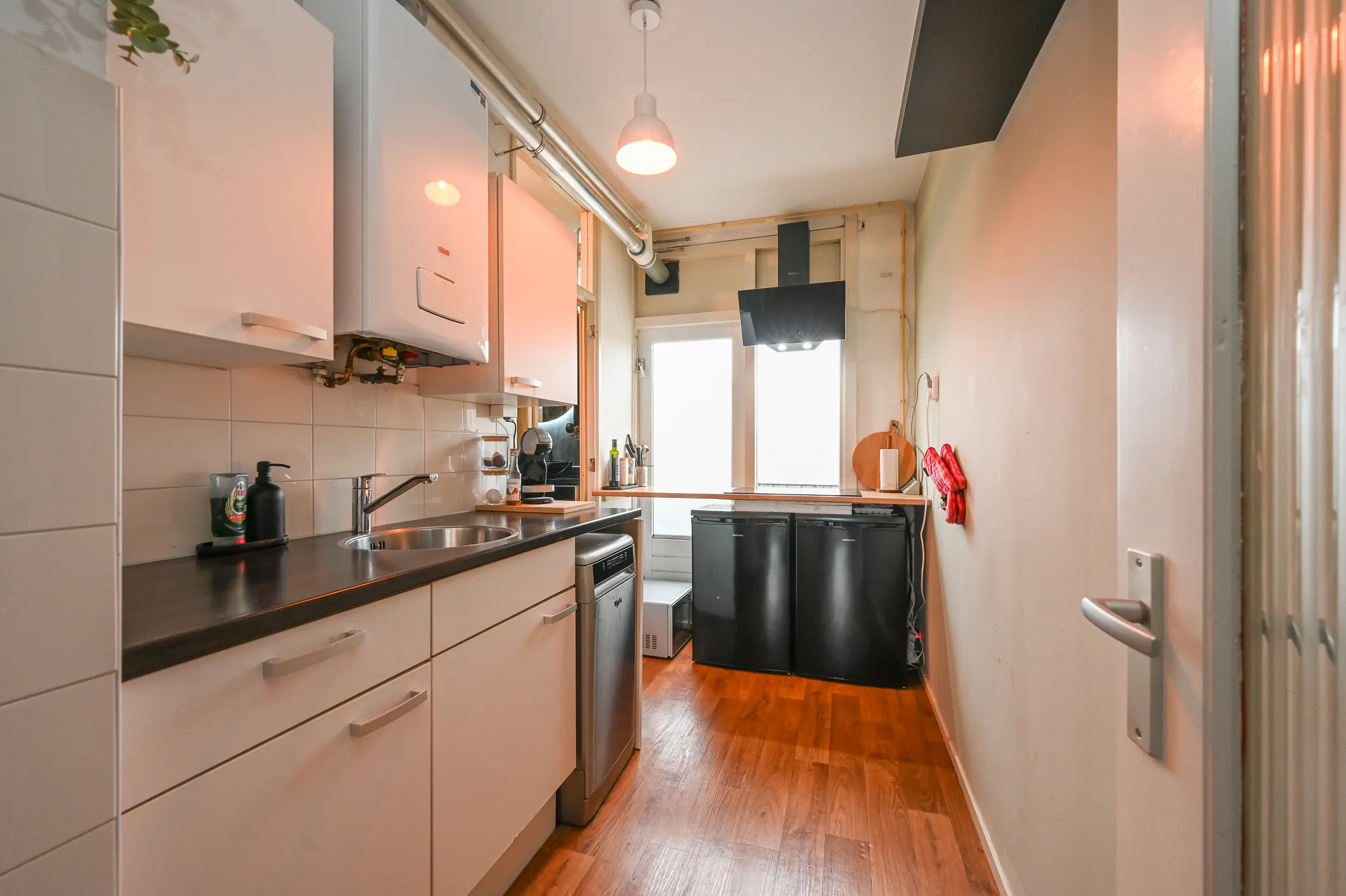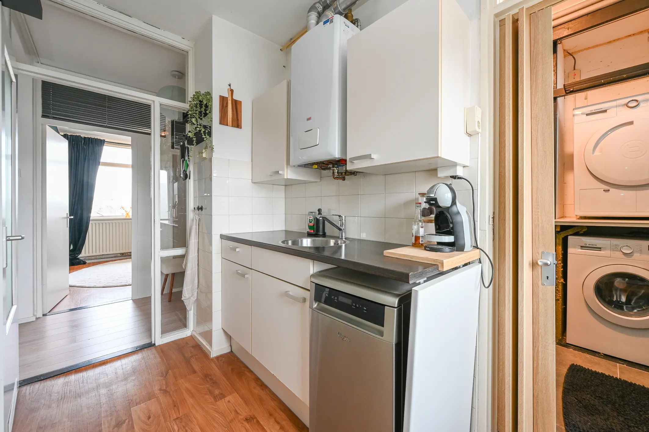 De keuken is praktisch ingericht en voorzien van een inductiekookplaat, circulatiekap en koelkast. Tevens bevindt zich hier de opstelling van de cv-combiketel. Vanuit de keuken heb je toegang tot het tweede balkon, gelegen op het noordwesten – ideaal voor de middag- en avondzon.