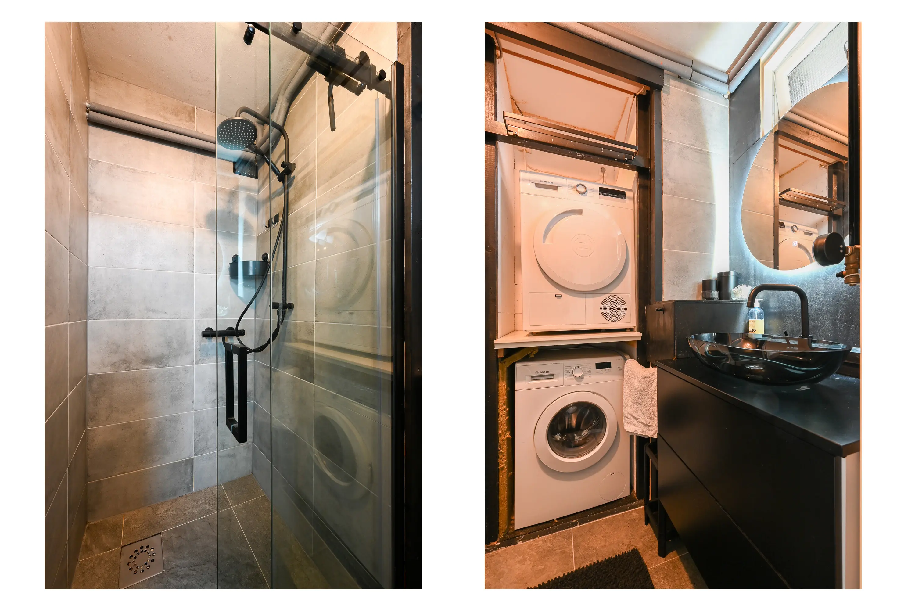 De badkamer is functioneel en compleet uitgevoerd met een douchecabine, wastafel, verlichte spiegel en aansluitingen voor de wasmachine.