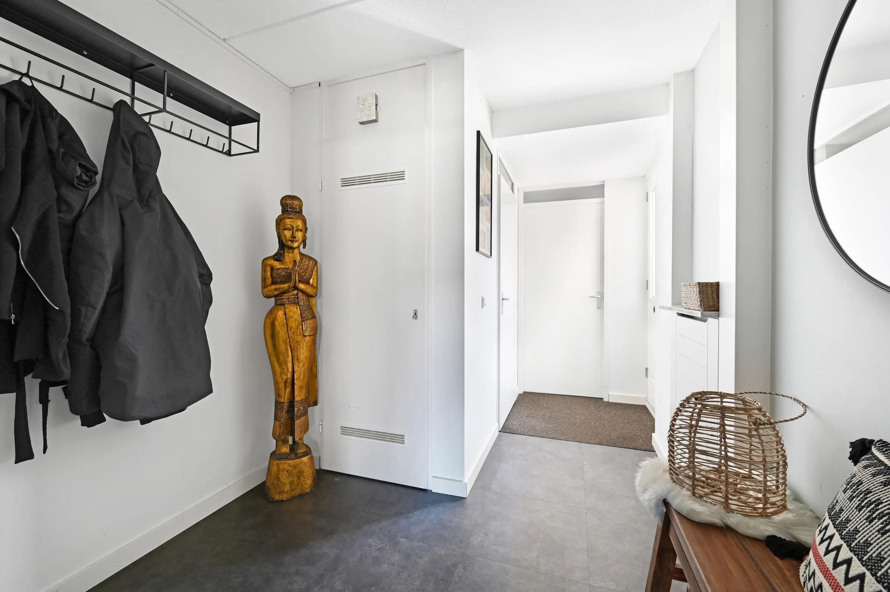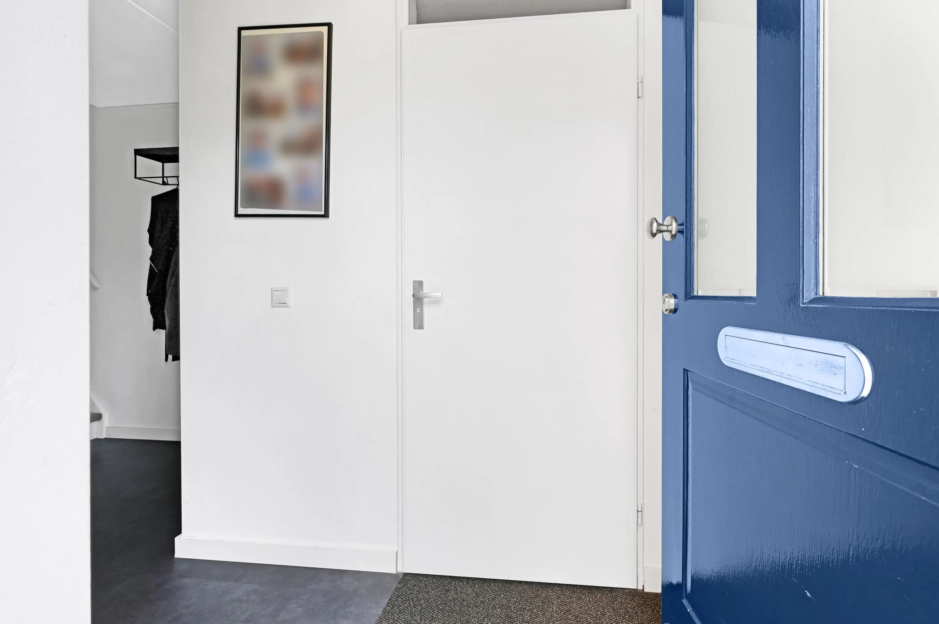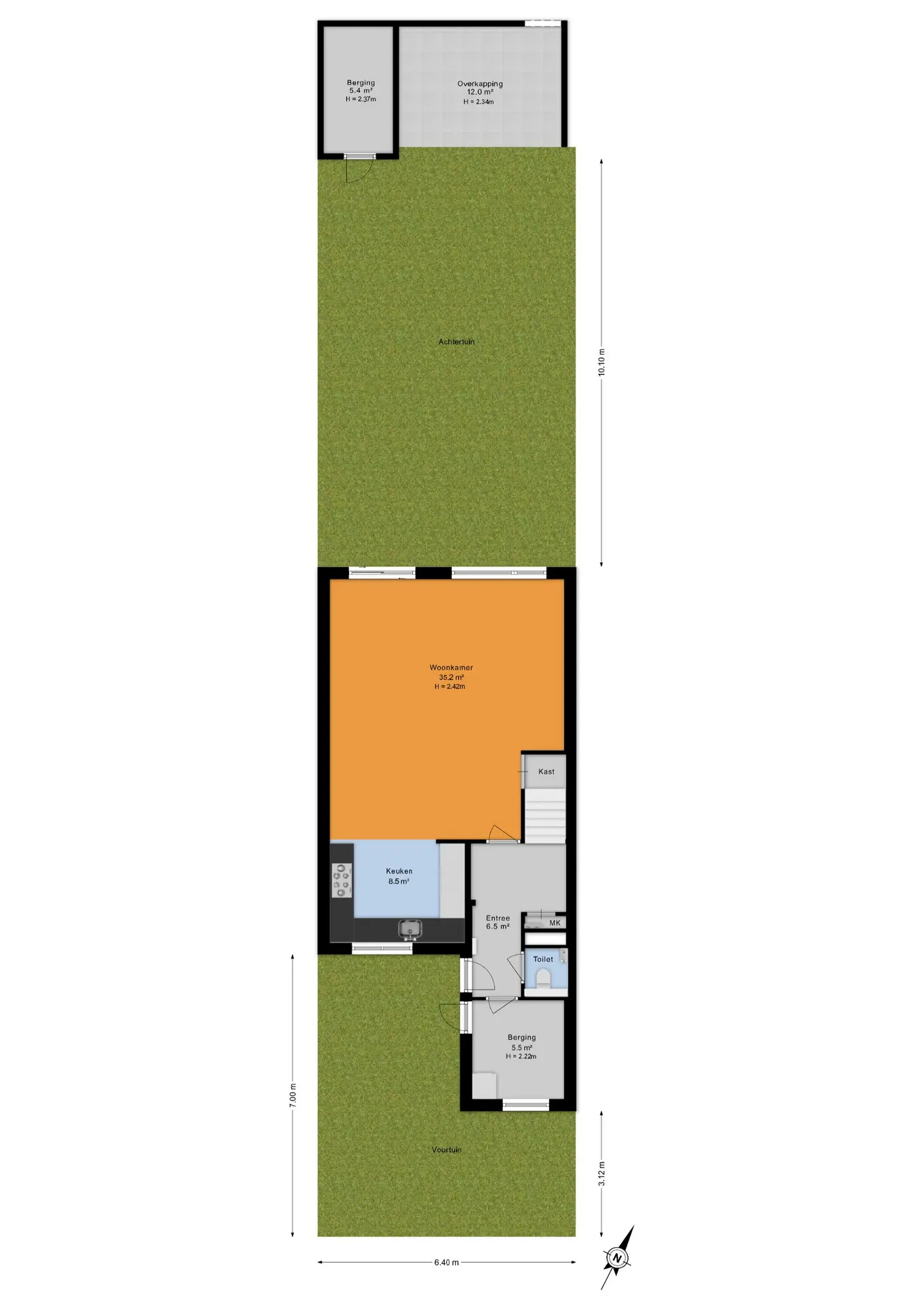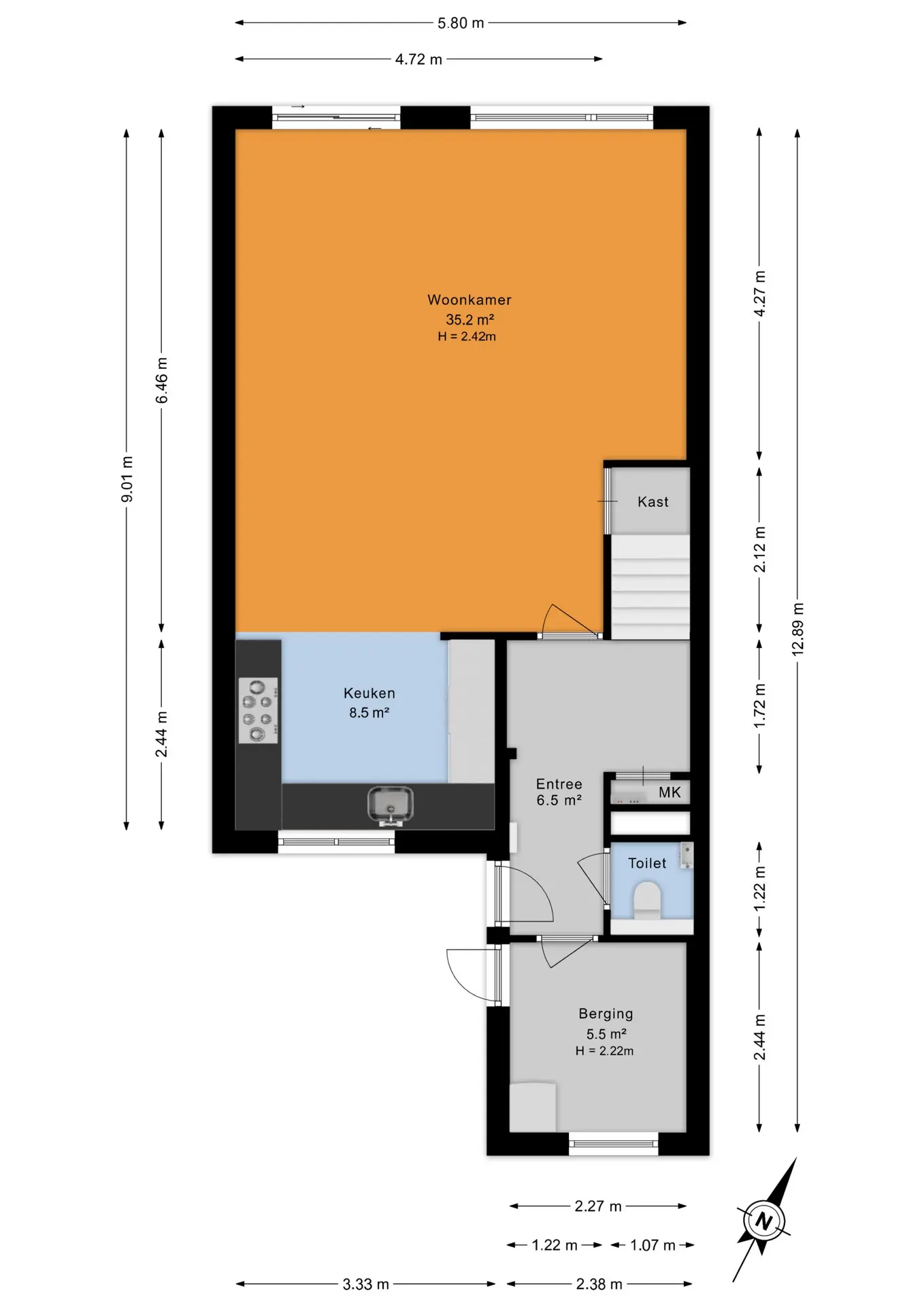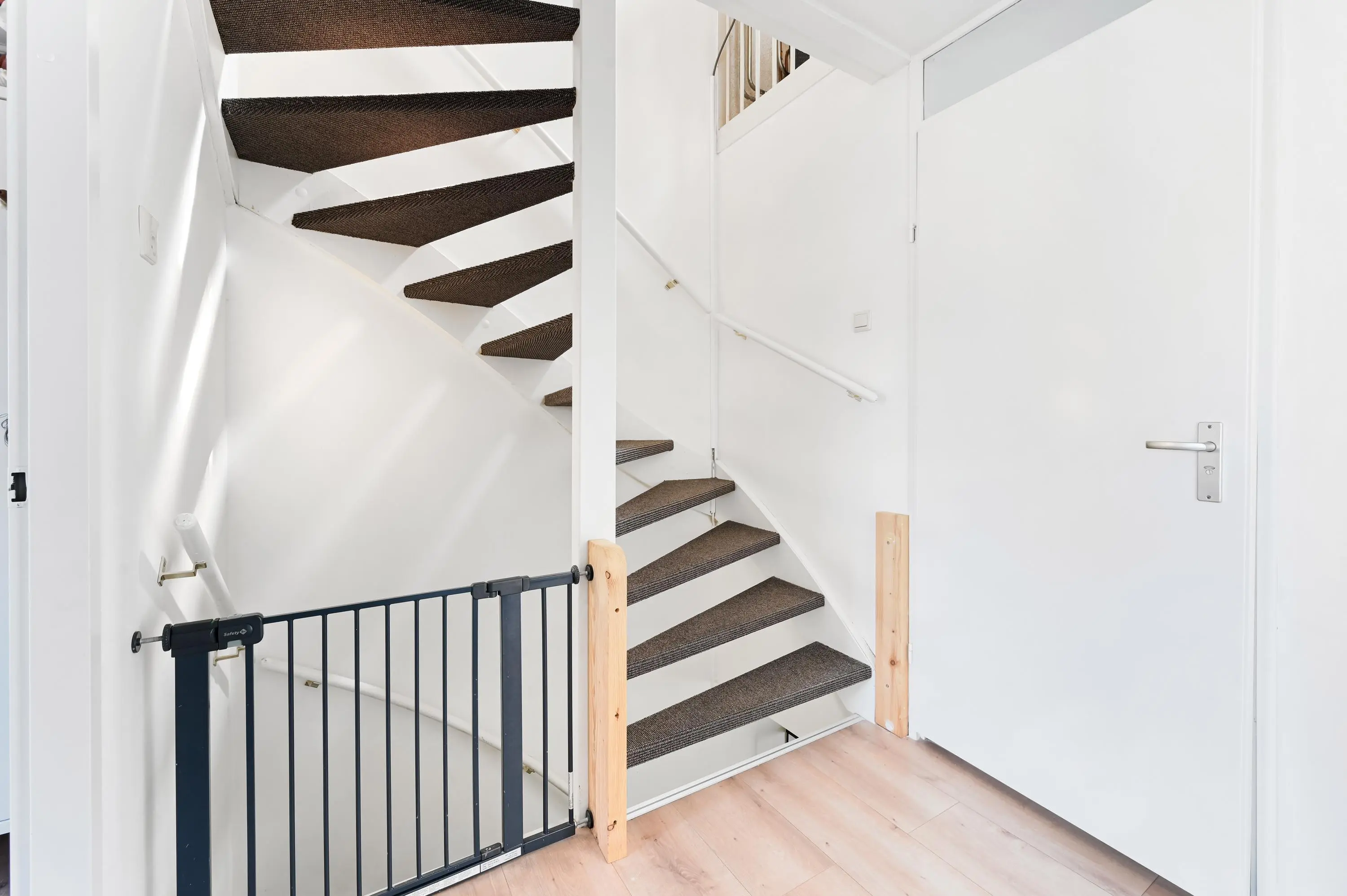 Aan de voorzijde bevindt zich de praktische berging, direct naast de eigen parkeerplaats. Je komt binnen in een ruime hal met garderobe, meterkast en modern toilet. Vanuit hier heb je toegang tot zowel de berging als de woonkamer en een vaste trap naar de eerste verdieping.