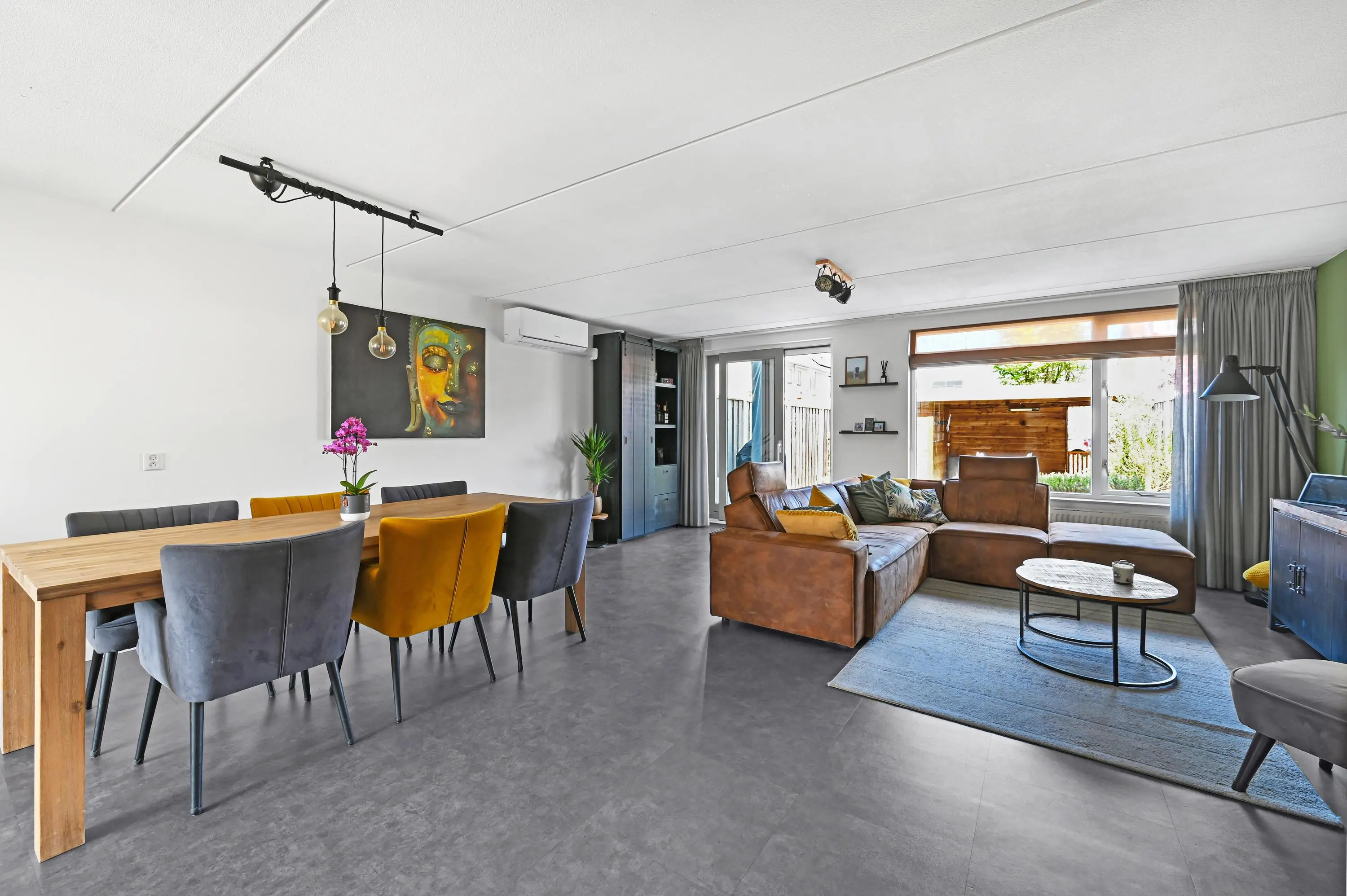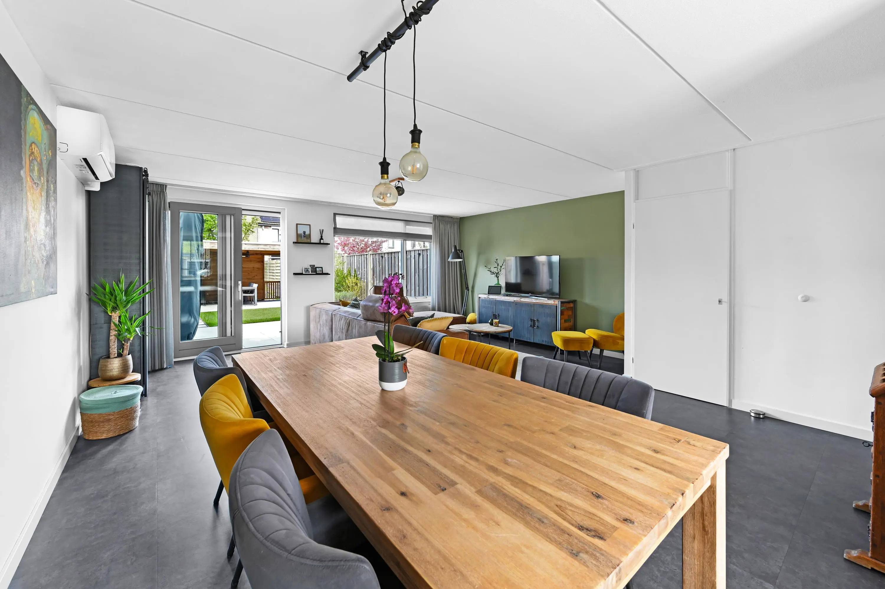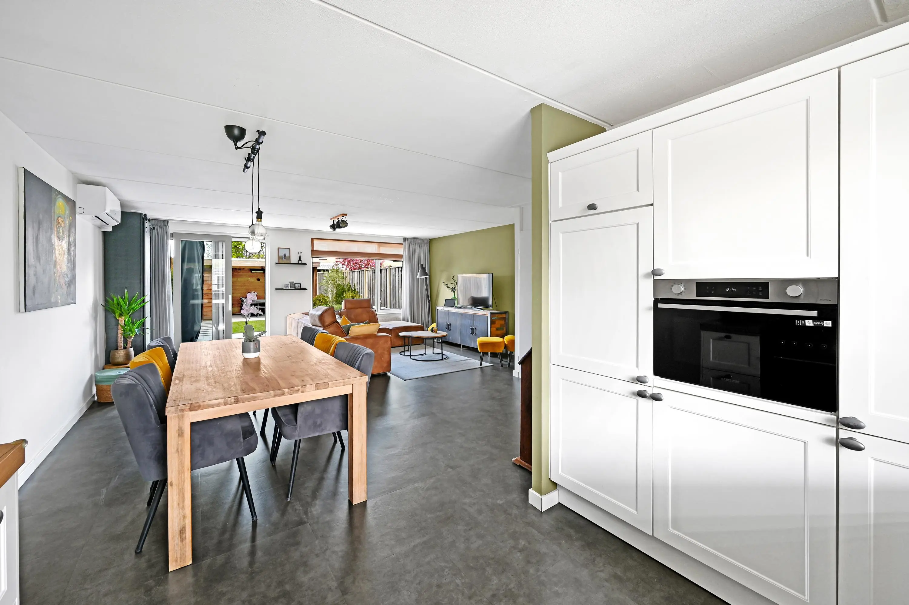 De woonkamer aan de achterzijde valt direct op door de royale breedte en prettige lichtinval. Grote raampartijen en een schuifpui zorgen voor een mooie verbinding met de tuin en het water. De aanwezigheid van airconditioning draagt bij aan extra comfort, het hele jaar door.