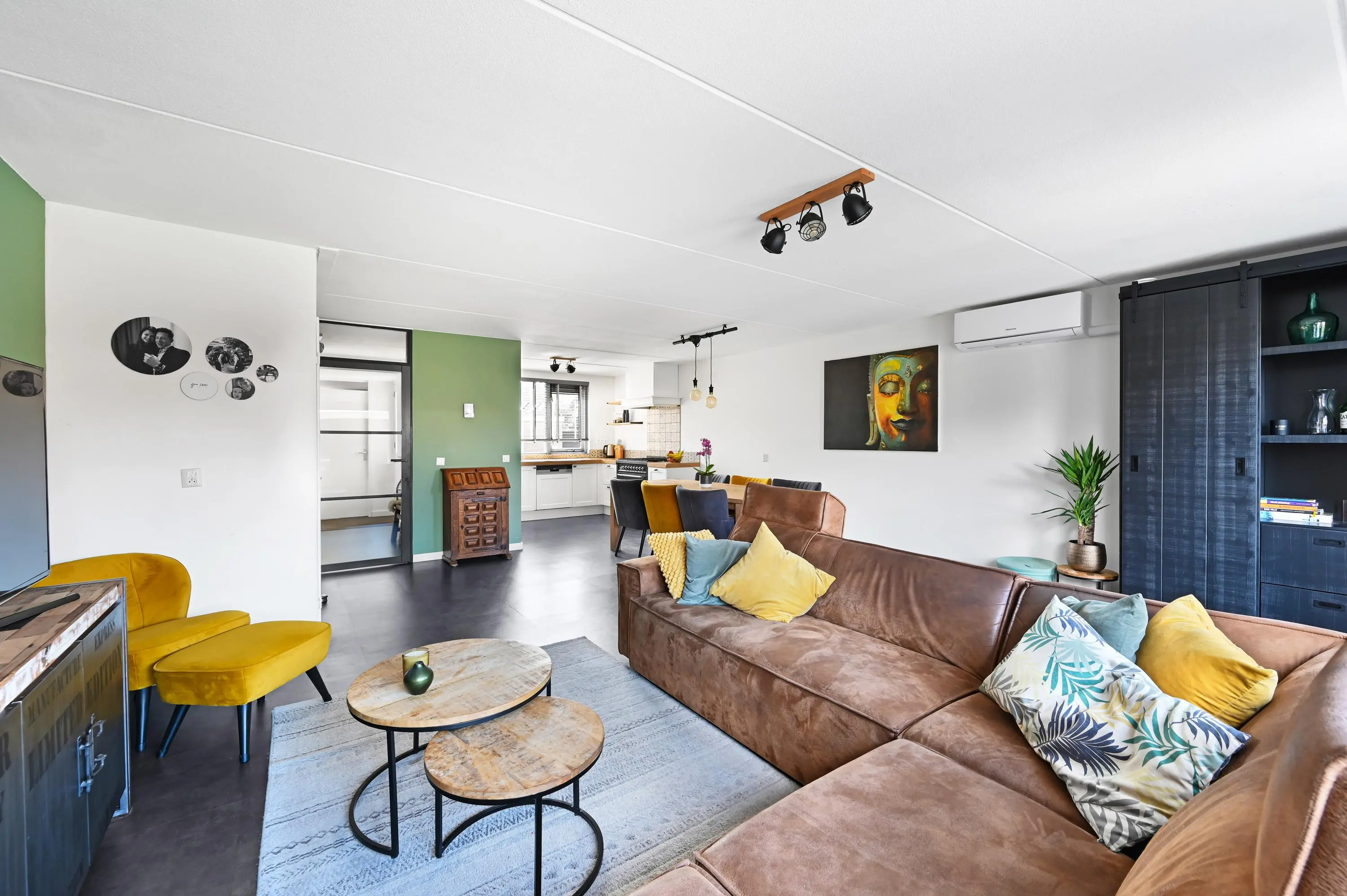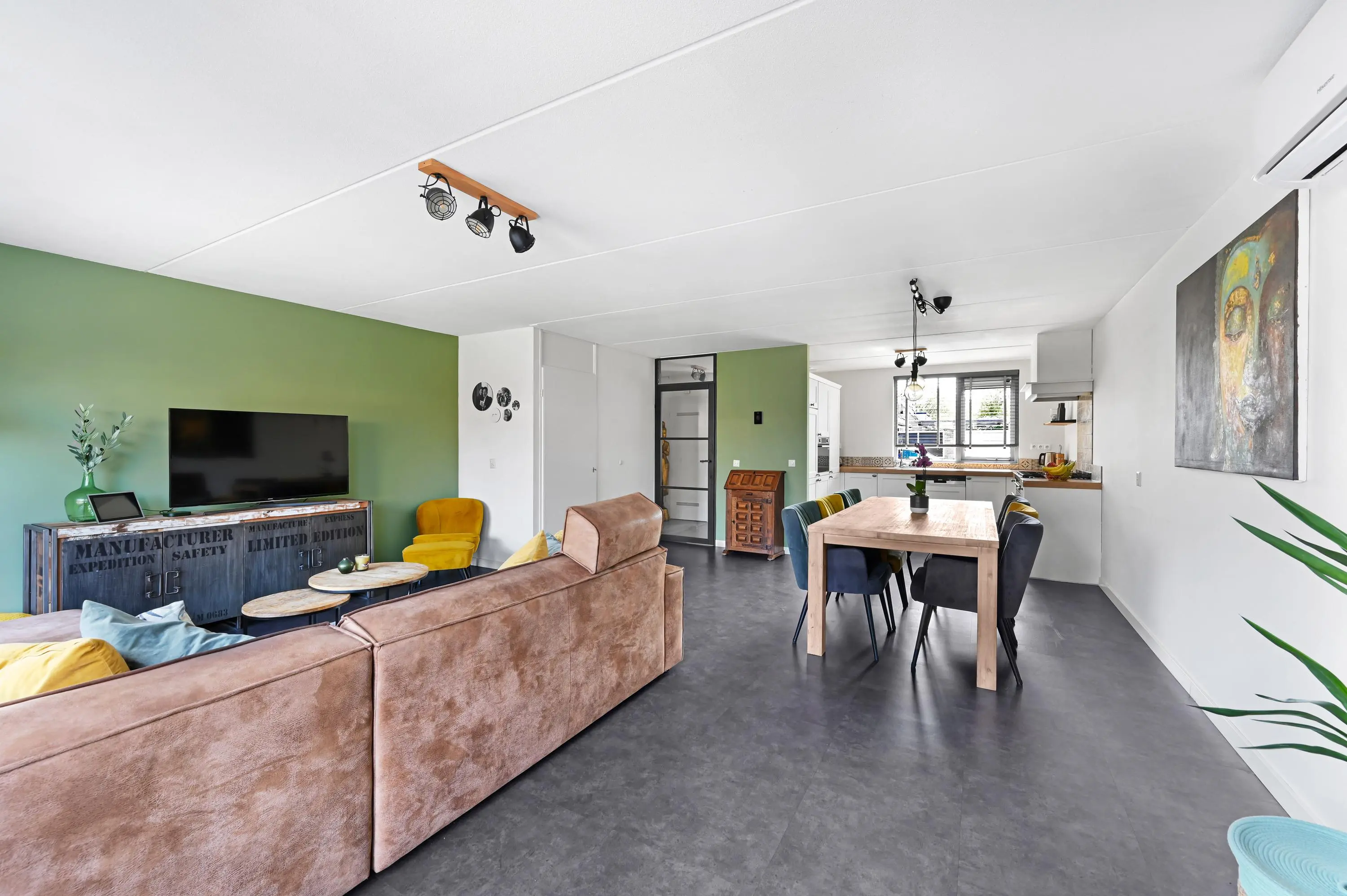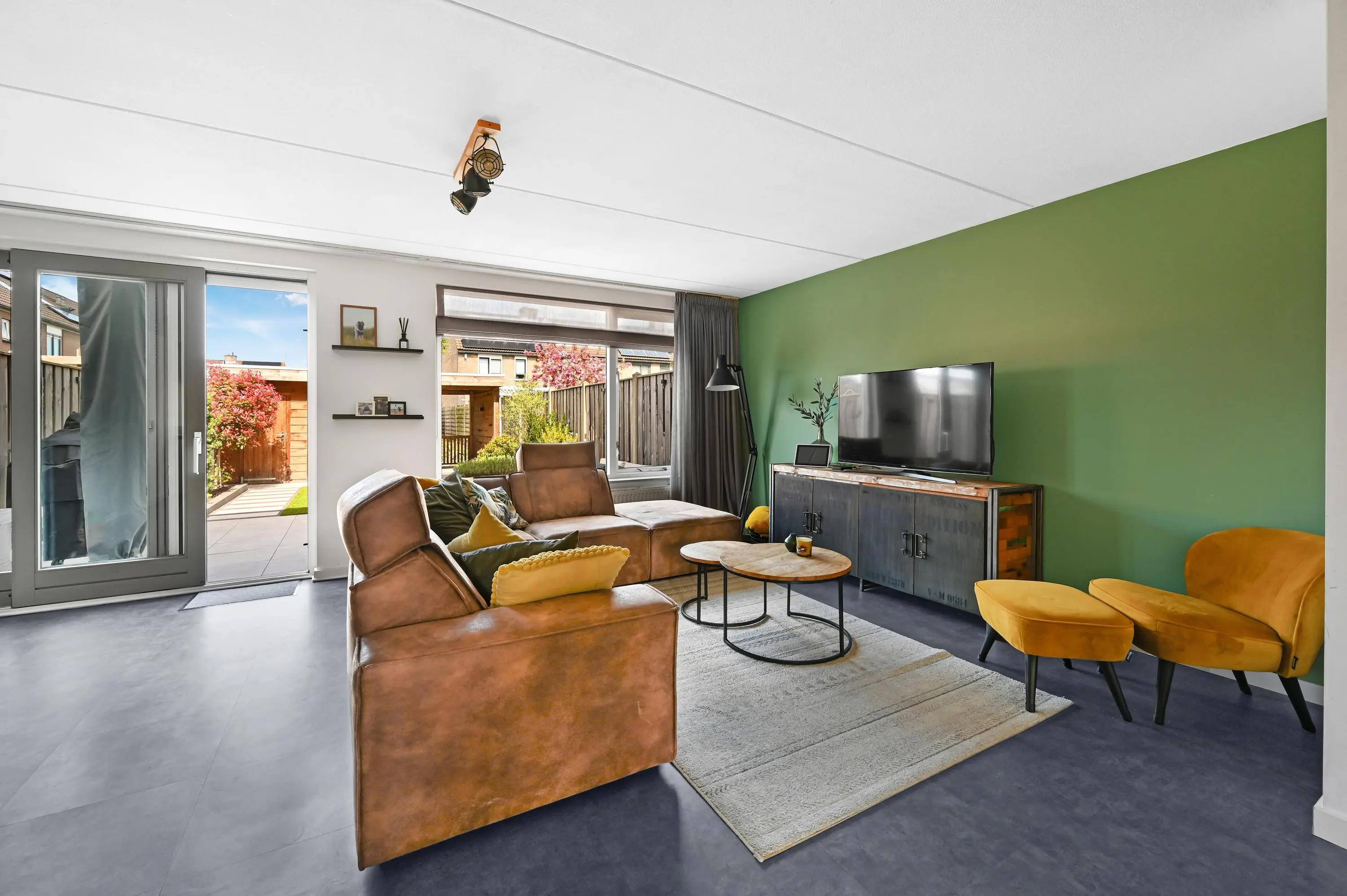 De woonkamer aan de achterzijde valt direct op door de royale breedte en prettige lichtinval. Grote raampartijen en een schuifpui zorgen voor een mooie verbinding met de tuin en het water. De aanwezigheid van airconditioning draagt bij aan extra comfort, het hele jaar door.