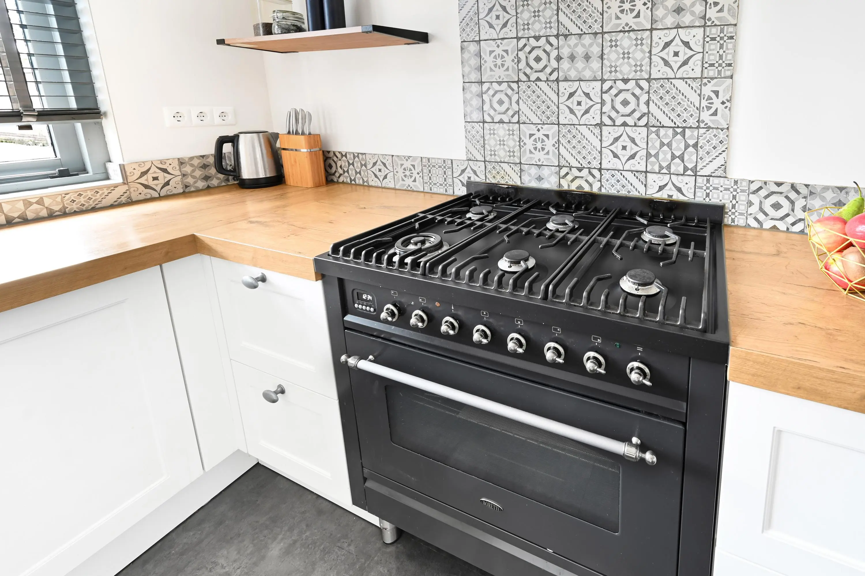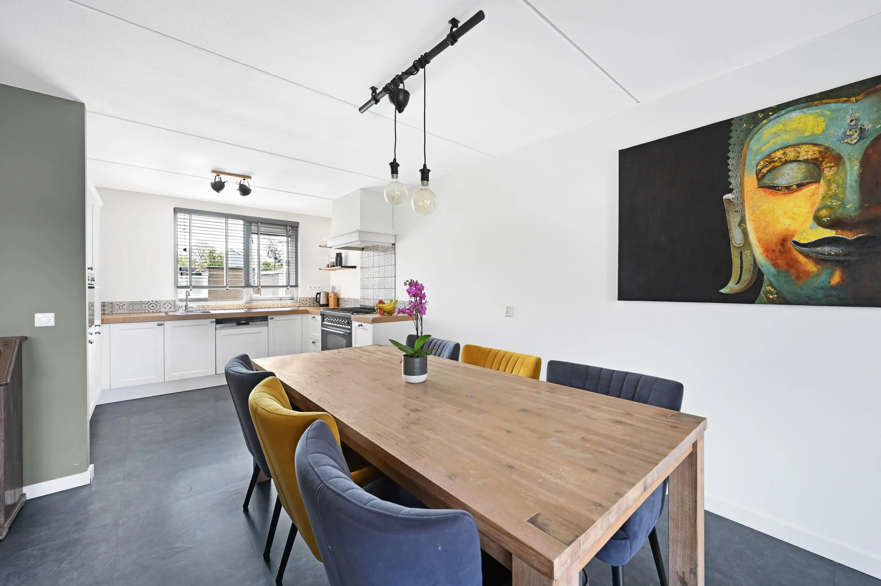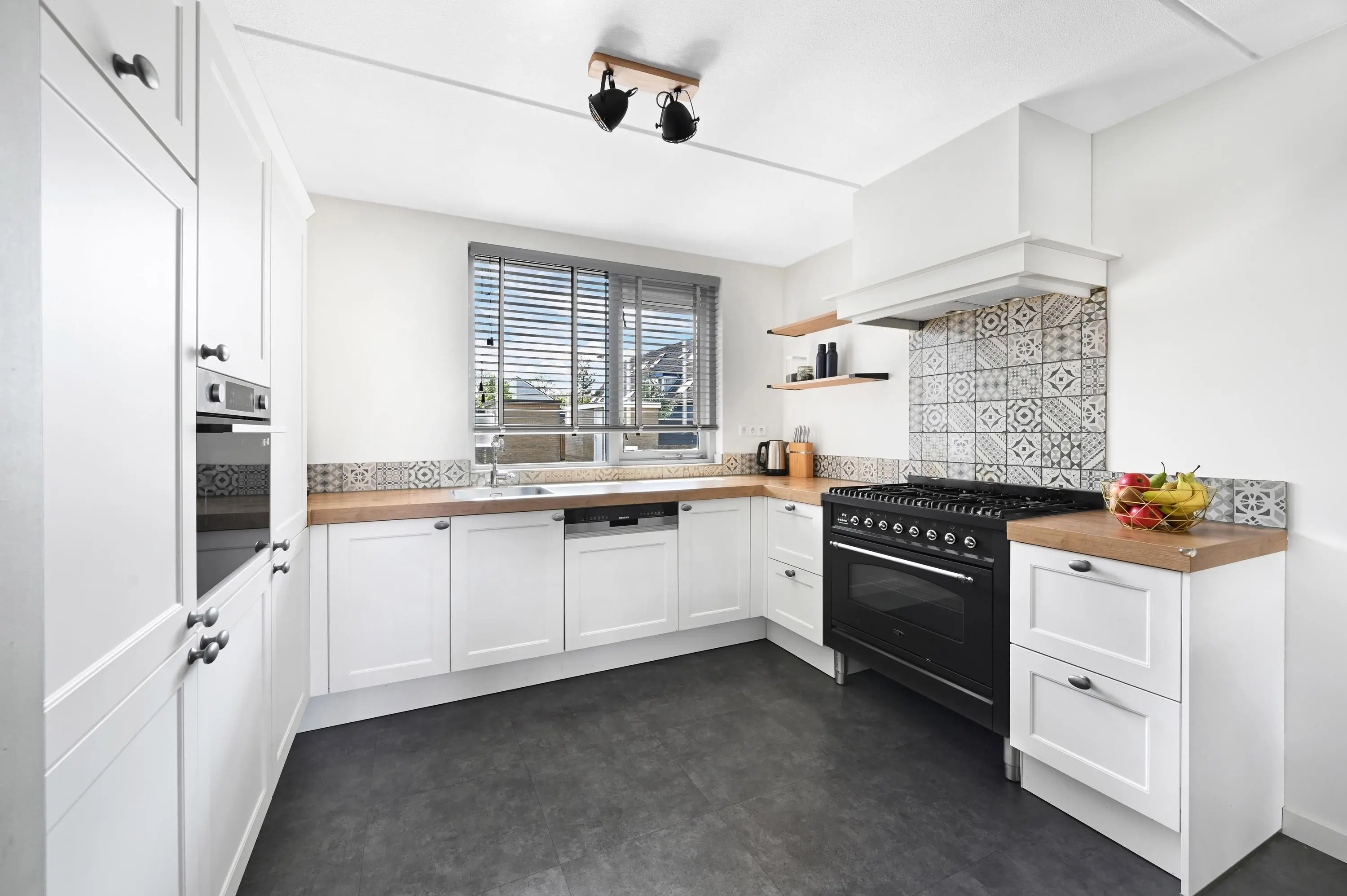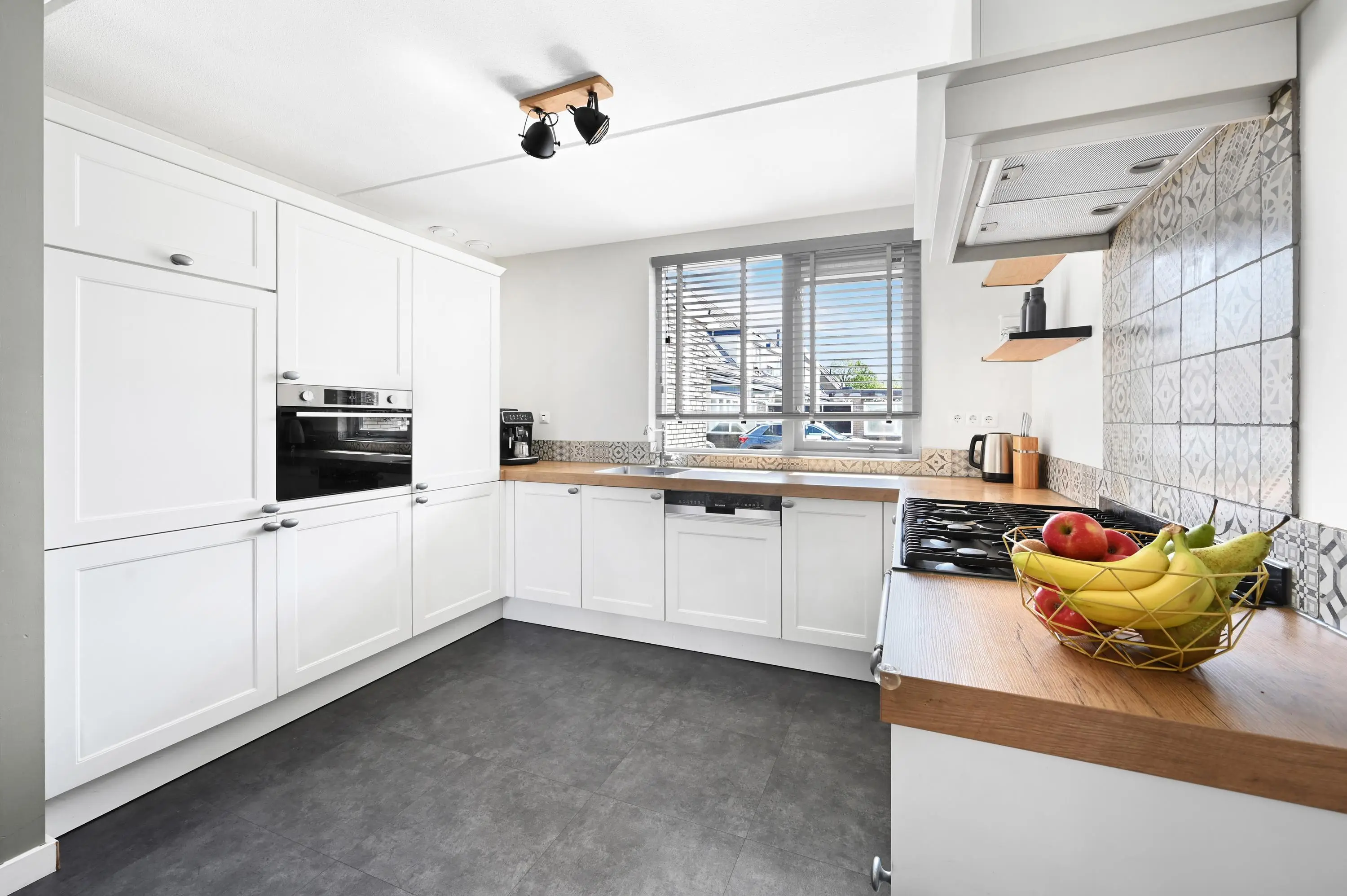 Aan de voorzijde van de woning ligt de open keuken uit 2017. Door de breedte van de woning is hier een ruime en praktische keukenopstelling gerealiseerd, met veel werk- en bergruimte en diverse inbouwapparatuur. De moderne uitstraling maakt het geheel compleet.