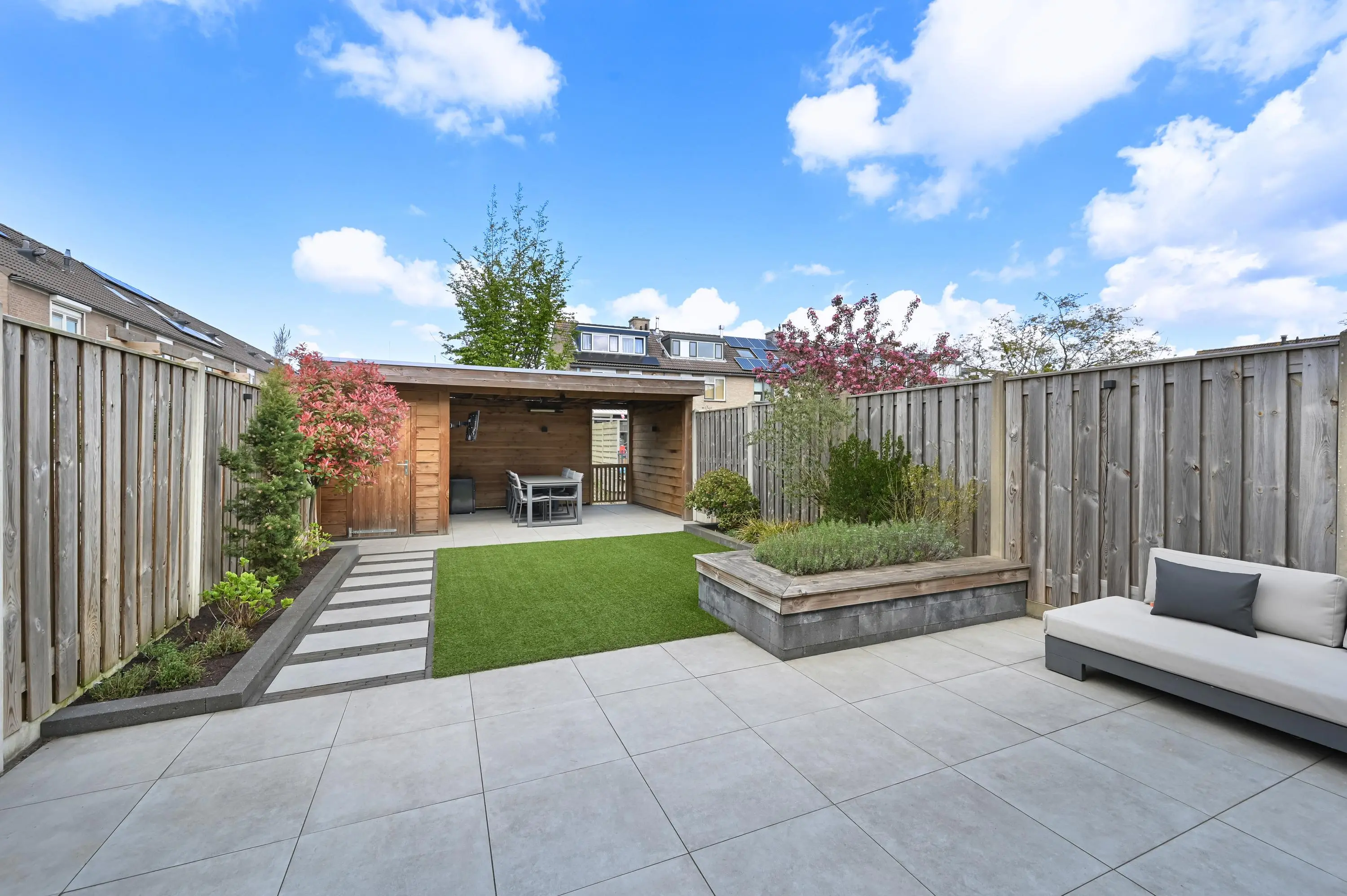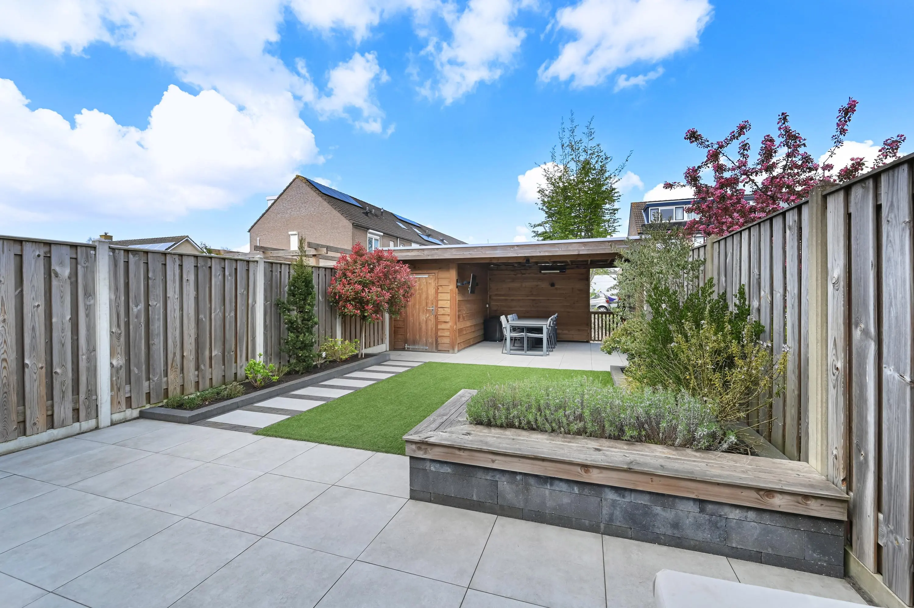 De achtertuin is ruim en fraai aangelegd en gelegen aan het water.