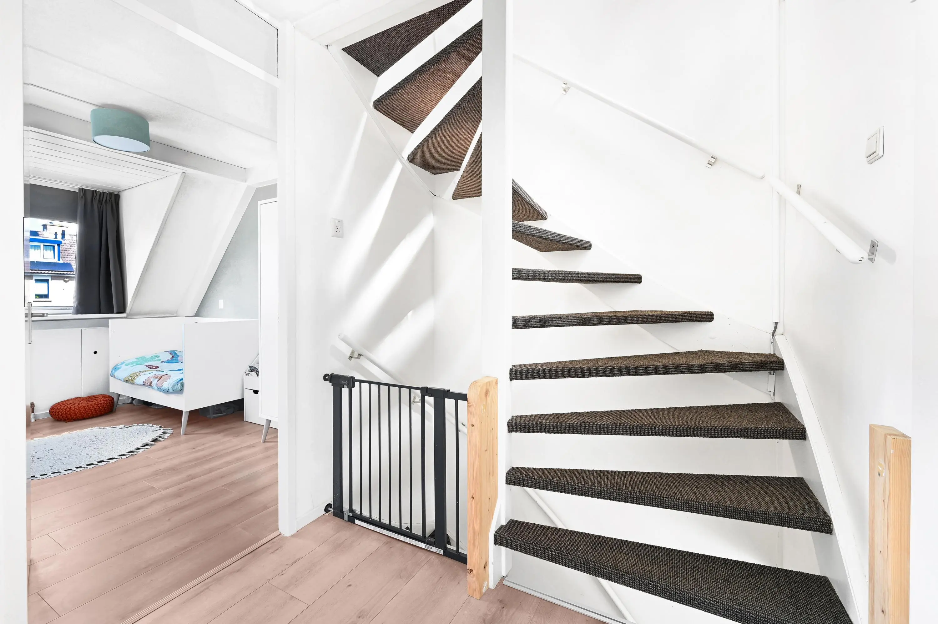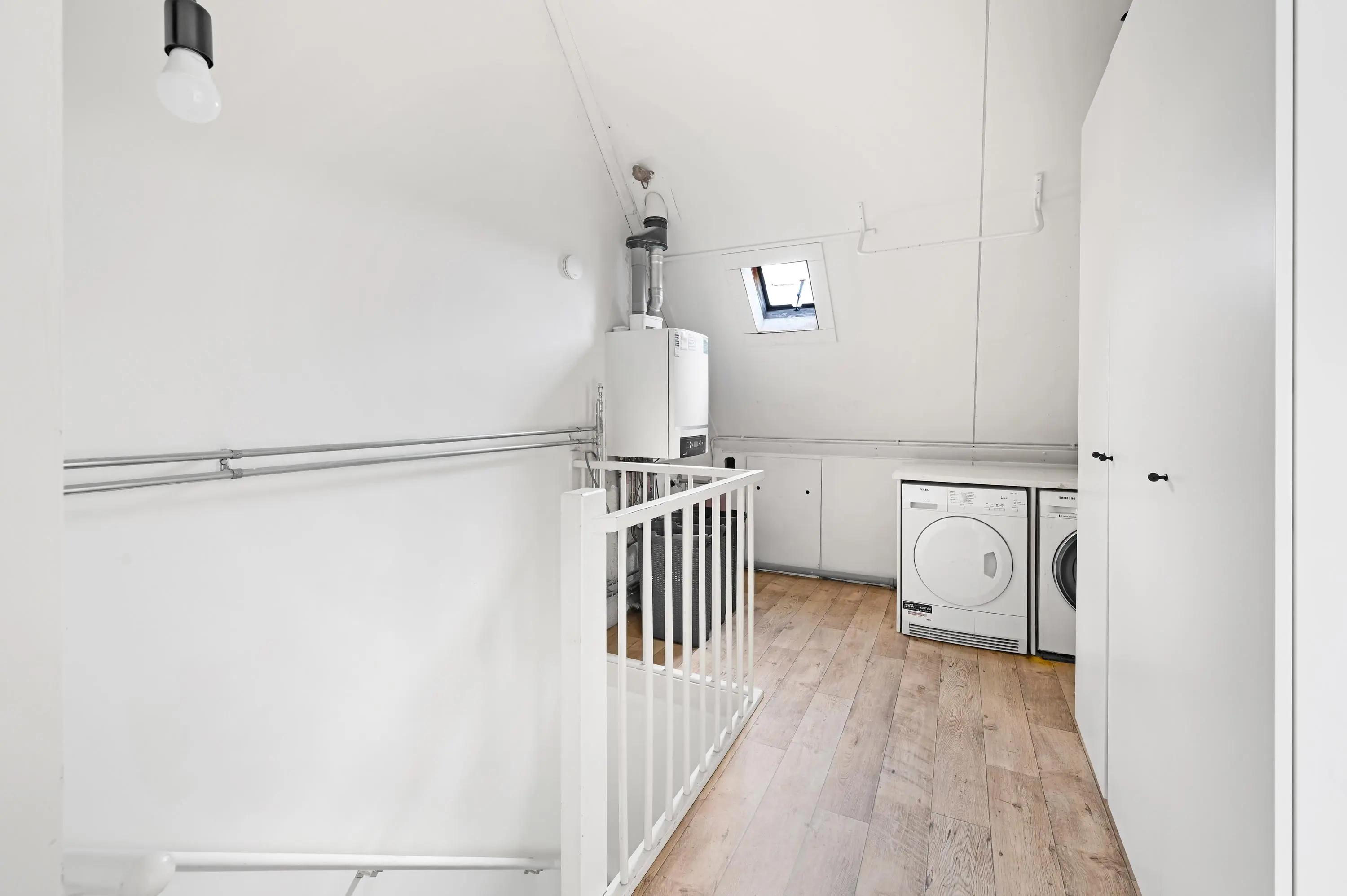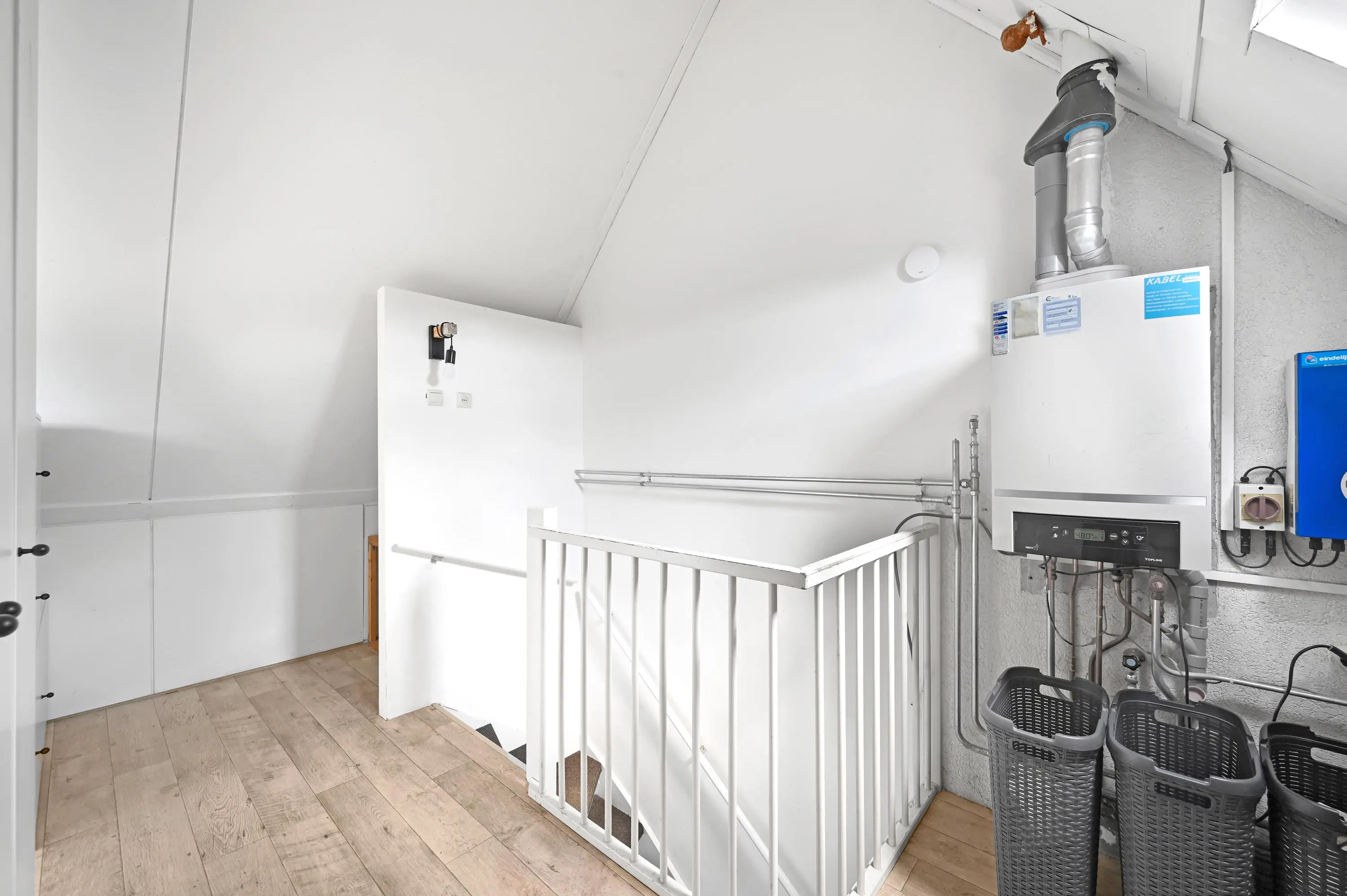 De zolderverdieping biedt verrassend veel ruimte en is praktisch ingedeeld. Op de overloop vind je de aansluitingen voor wasmachine en droger, een wastafel, de opstelplaats van de cv-combiketel en volop bergruimte.