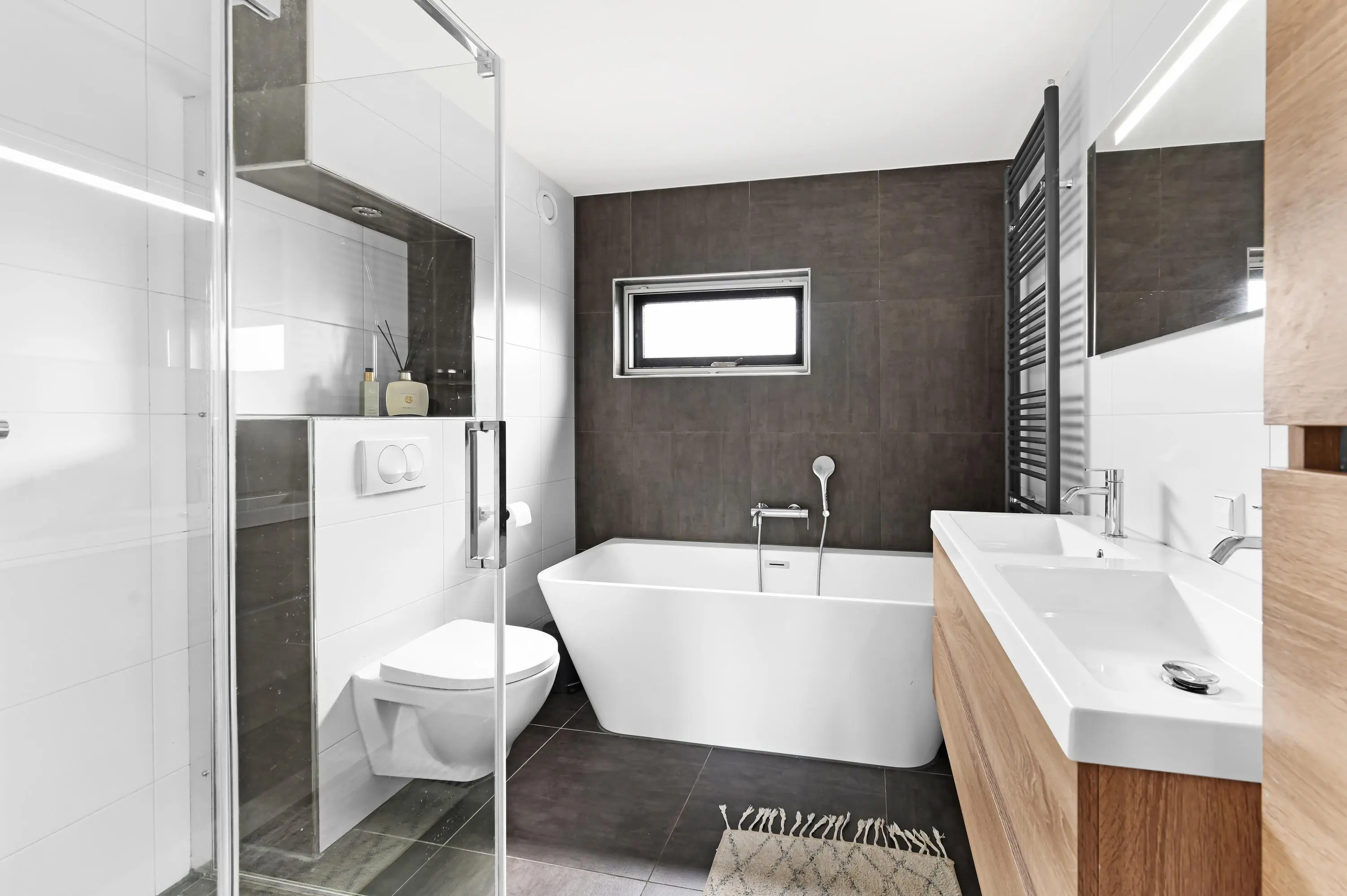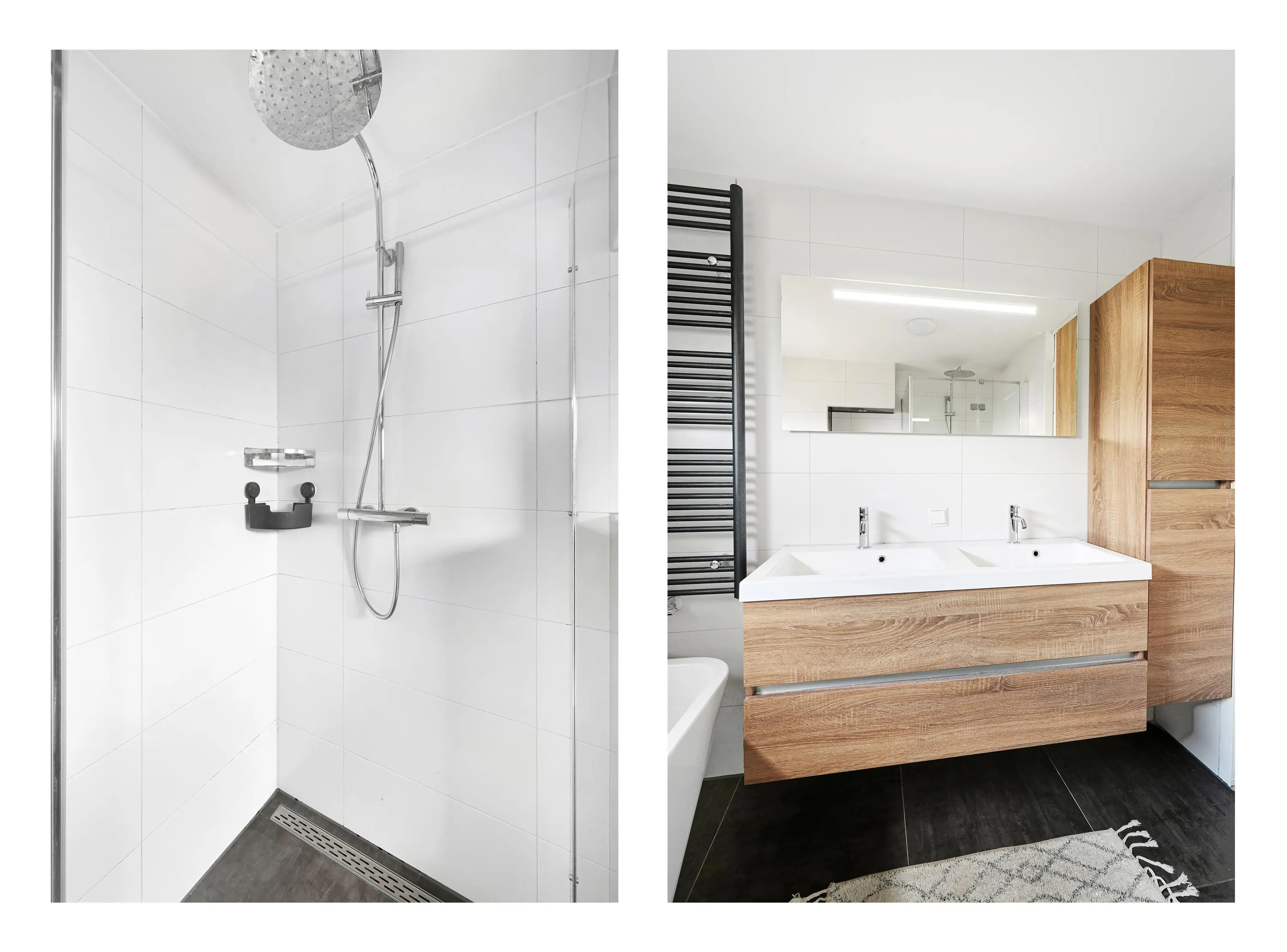 De badkamer is modern en comfortabel ingericht en voorzien van een tweede toilet, een dubbele wastafel met meubel en een royale inloopdouche met geïntegreerde stoomcabine en zitgedeelte; een plek om echt tot rust te komen.