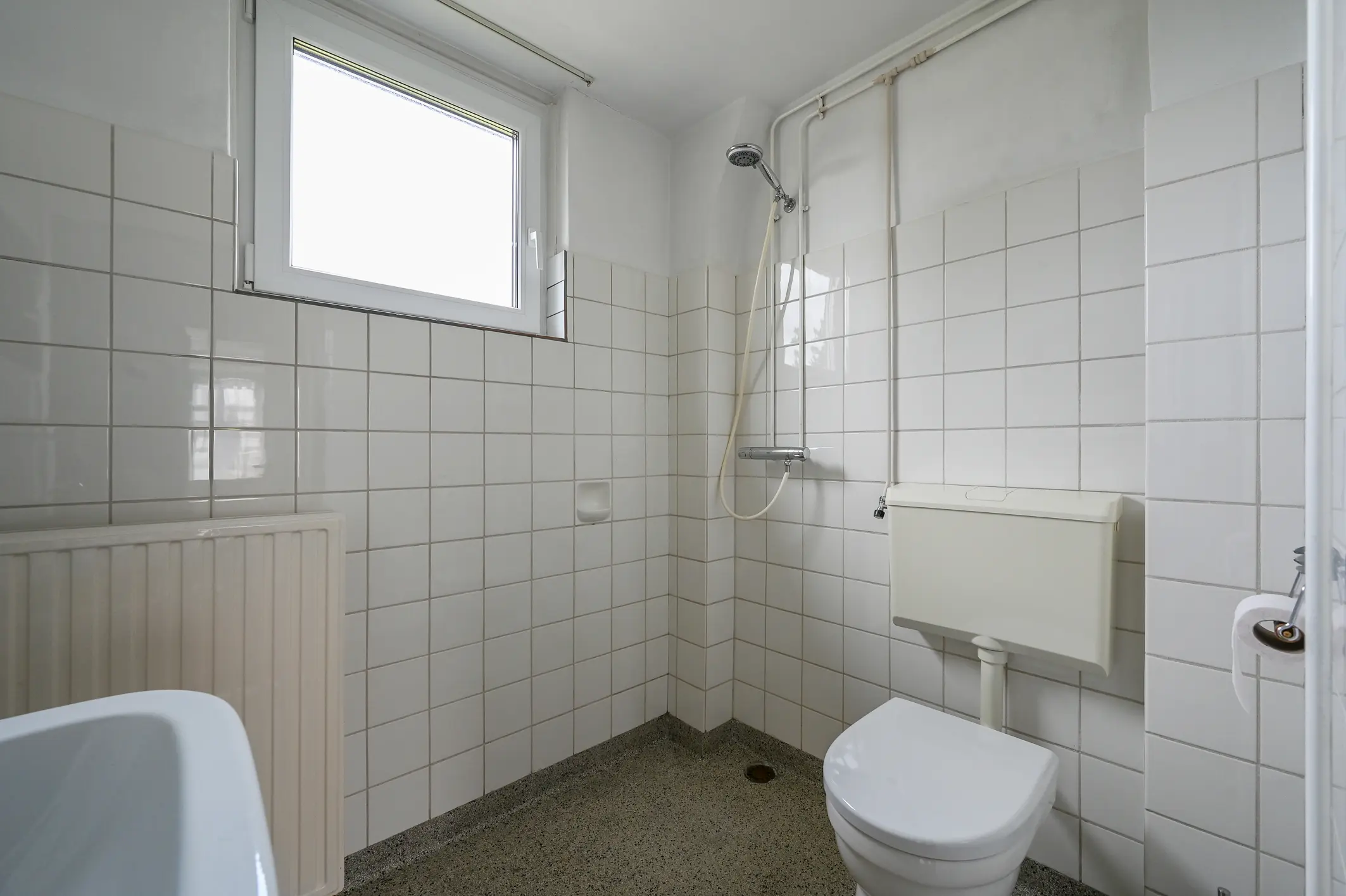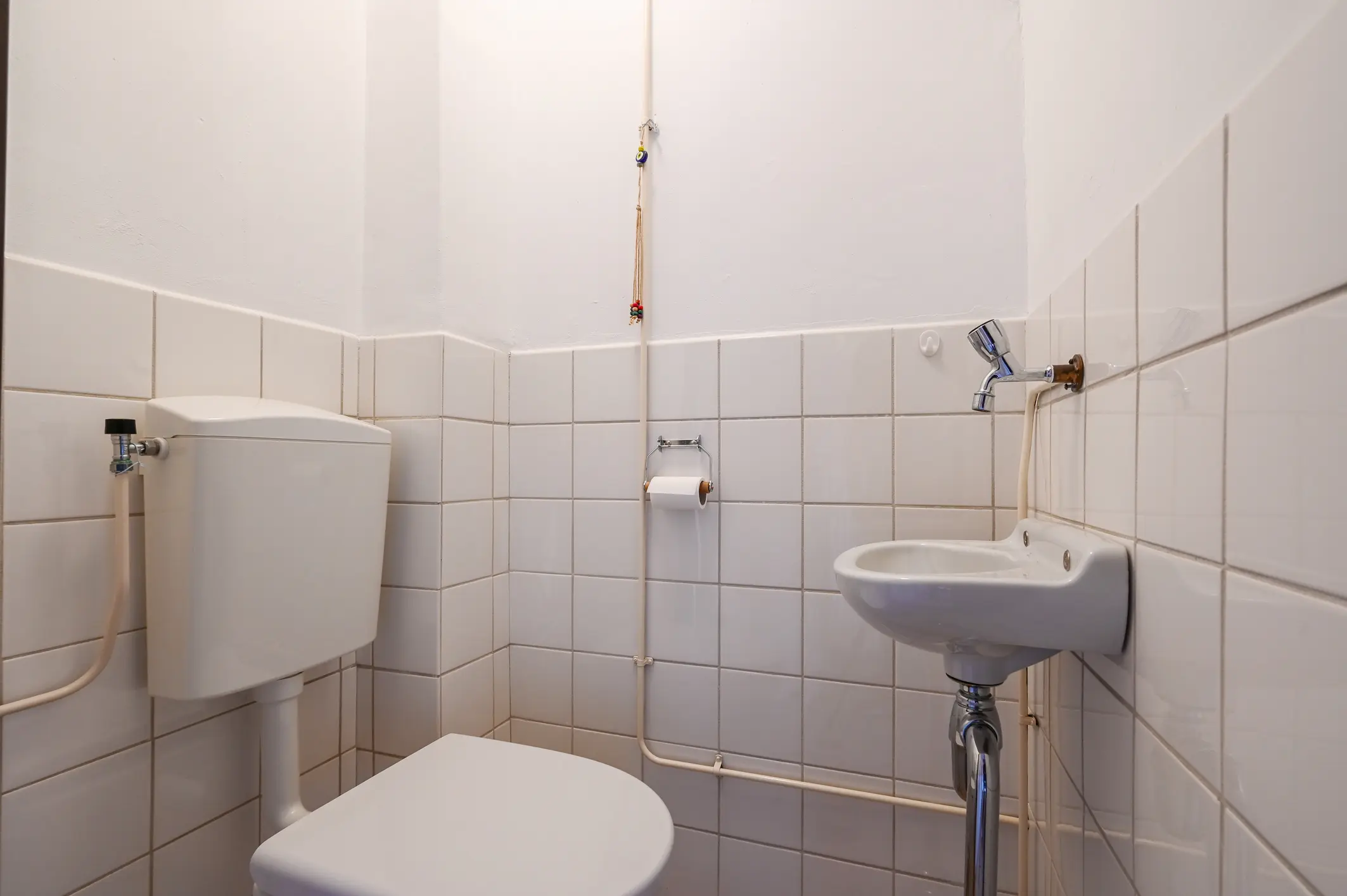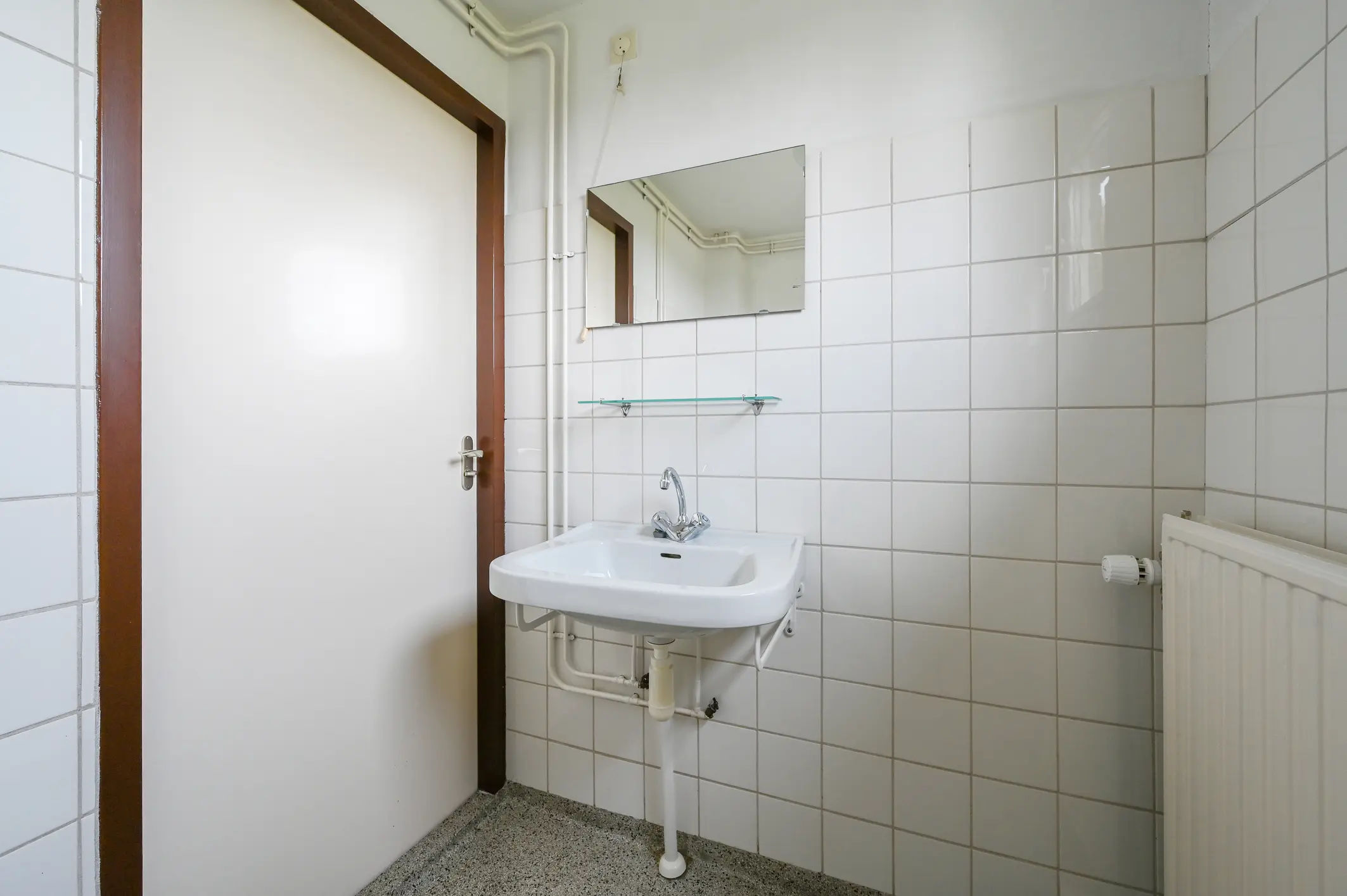 Aan de voorzijde is tevens de badkamer gesitueerd, voorzien van een toilet, douche en wastafel.