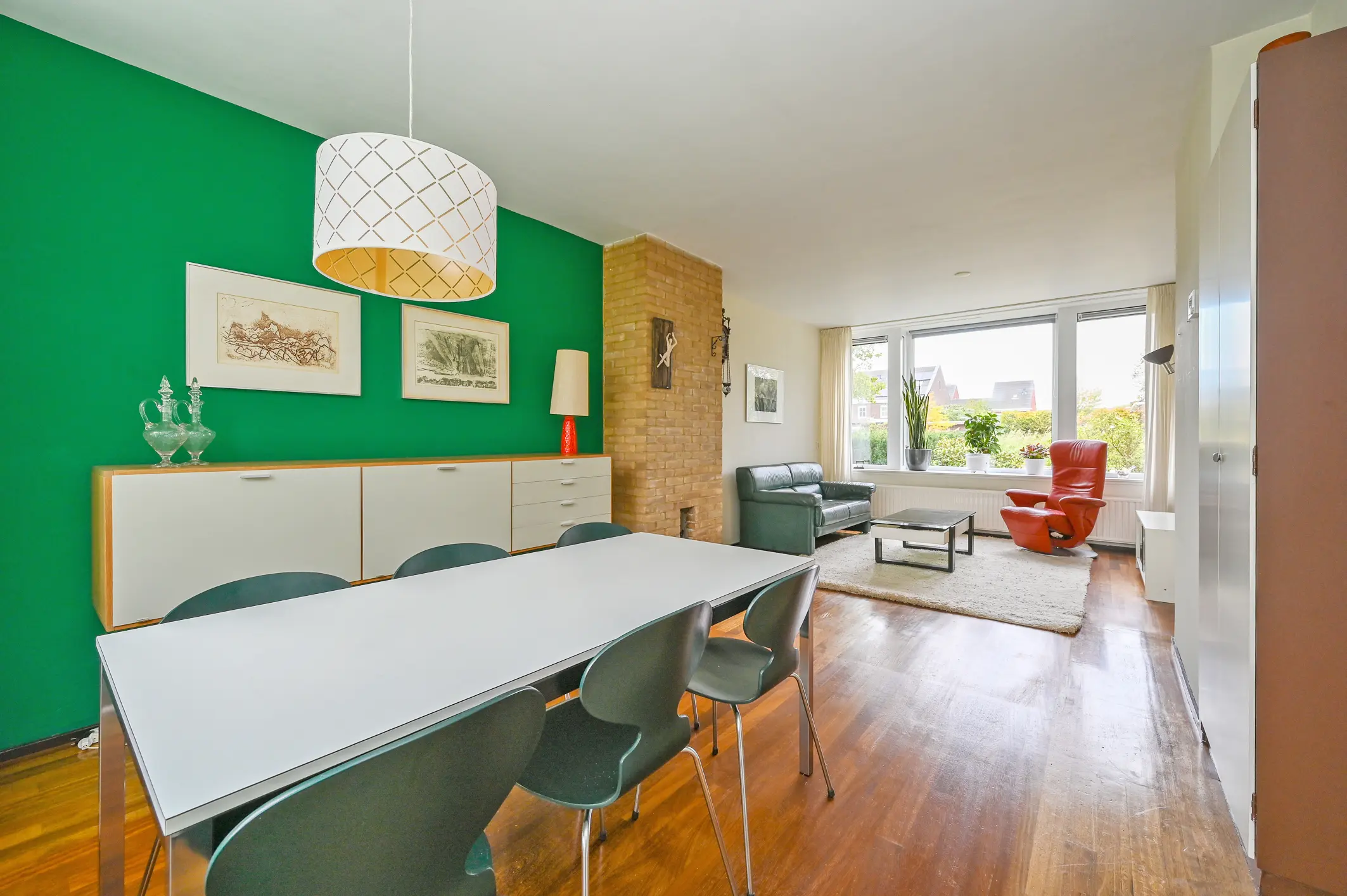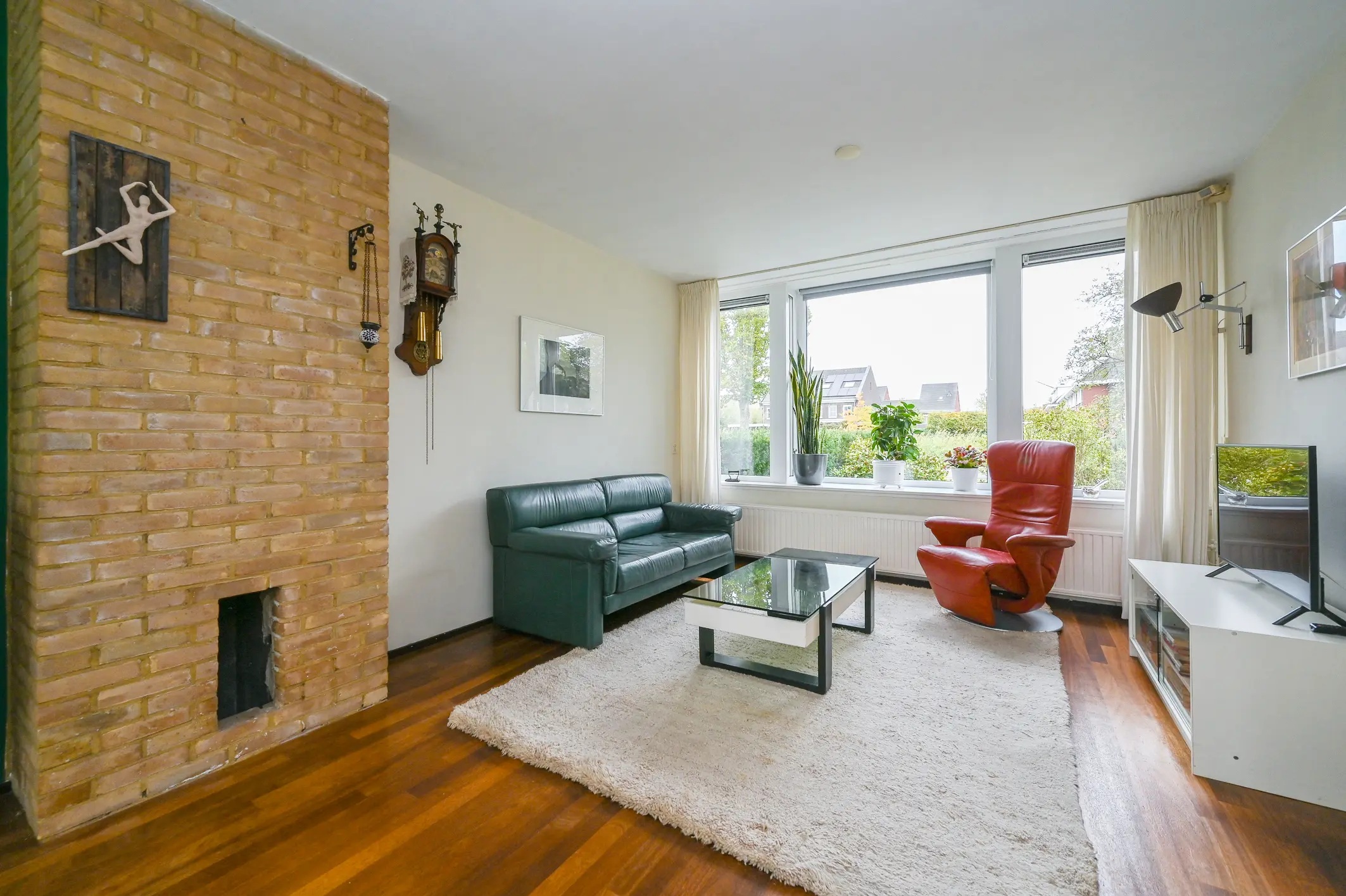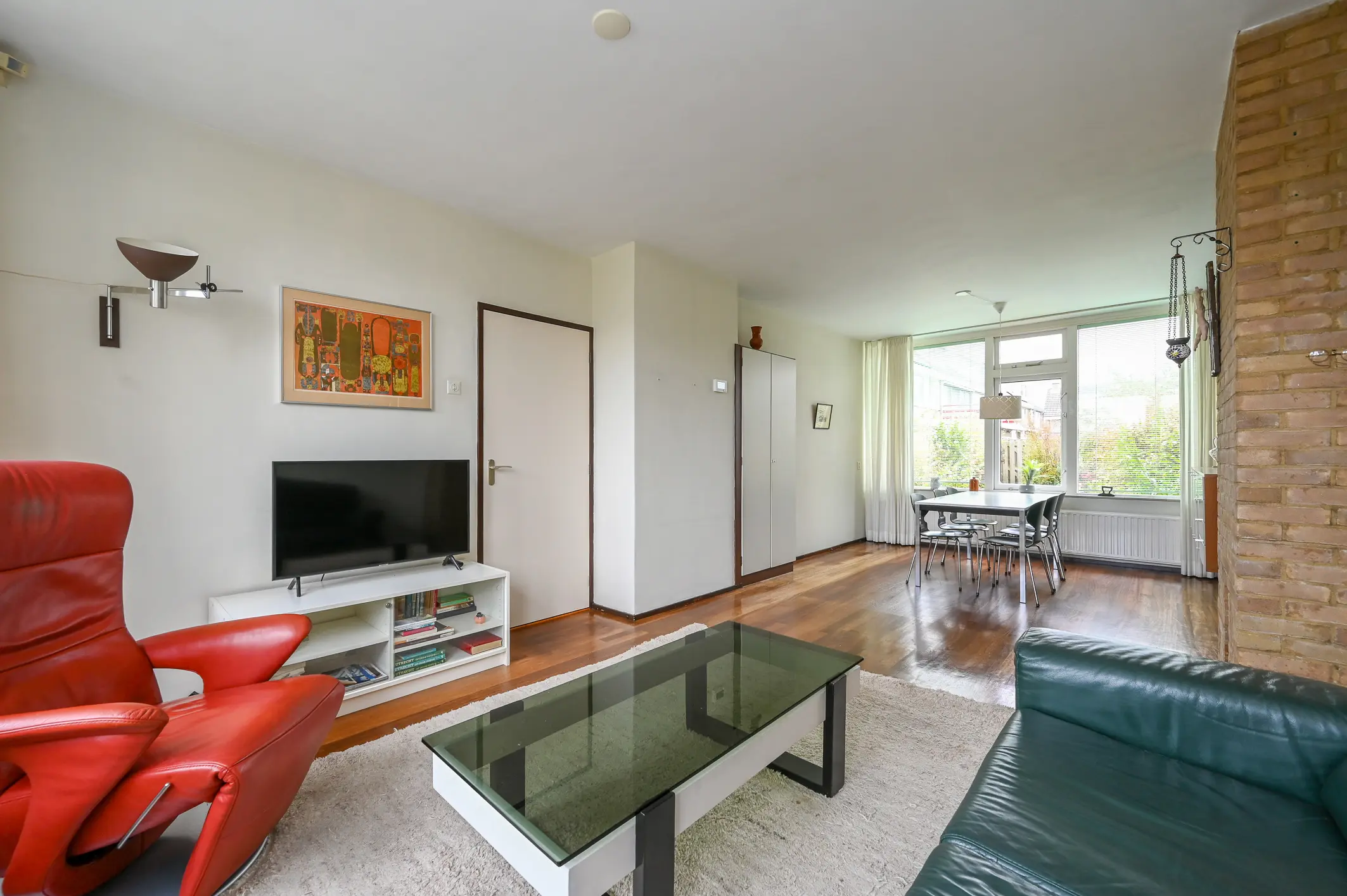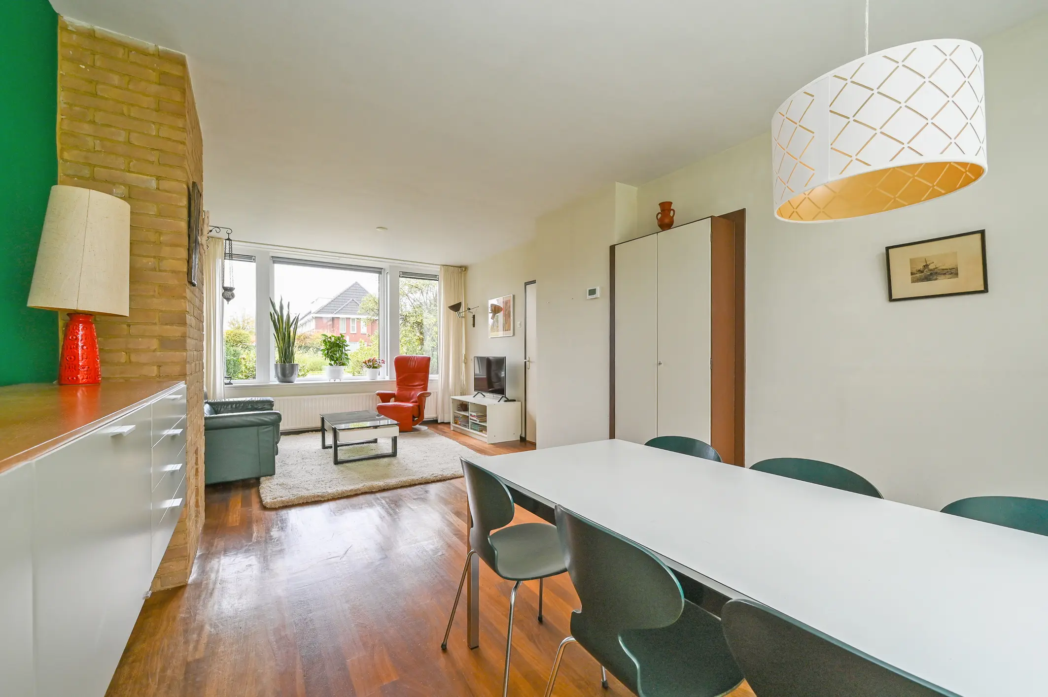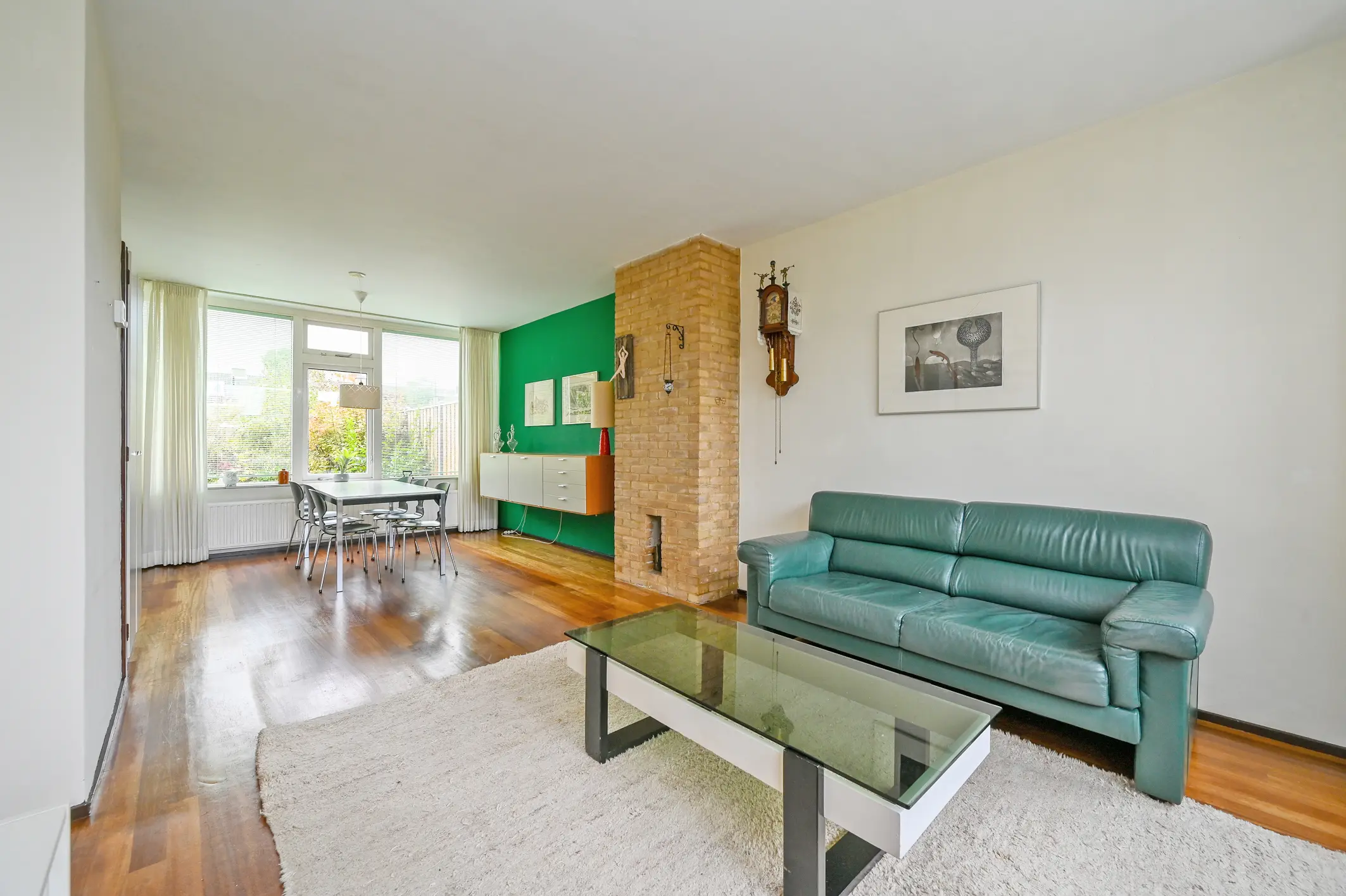 De doorzonkamer is opvallend licht dankzij de grote raampartijen aan zowel de voor- als achterzijde. Aan de voorzijde zijn kunststof kozijnen met trippelbeglazing geplaatst, terwijl aan de achterzijde houten kozijnen aanwezig zijn. De woonkamer biedt volop ruimte voor een gezellige zithoek en een eethoek met uitzicht op de tuin.