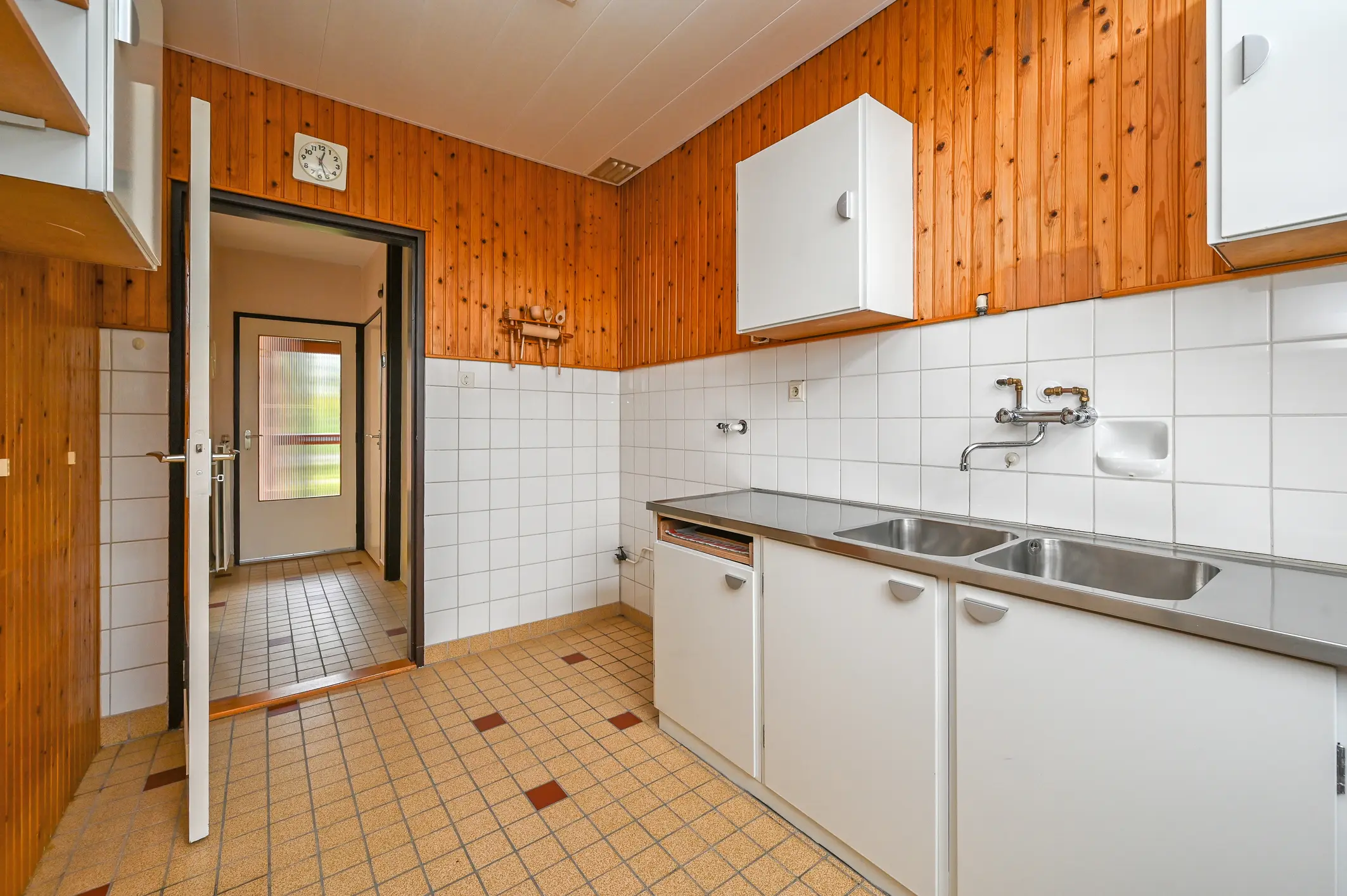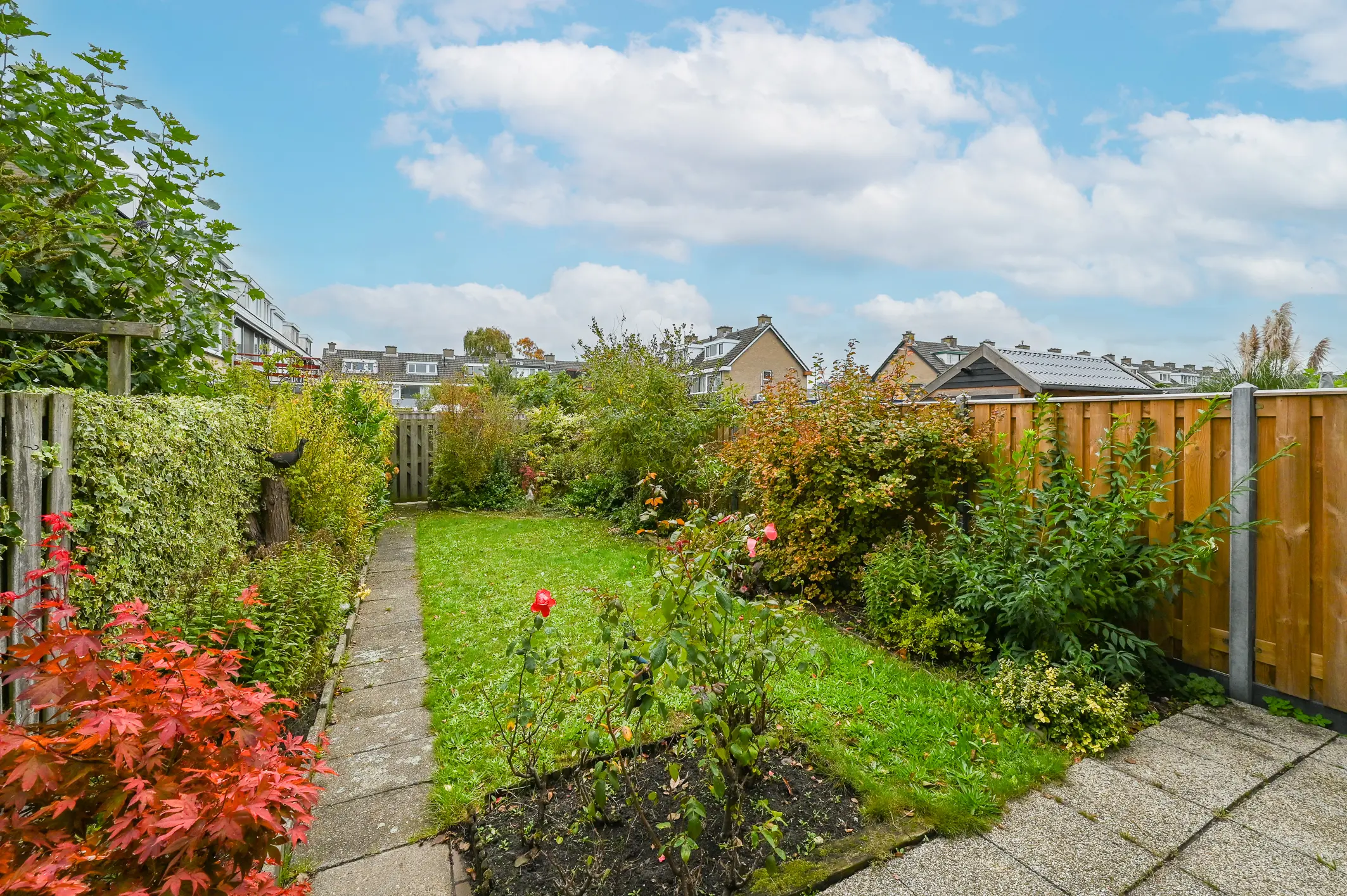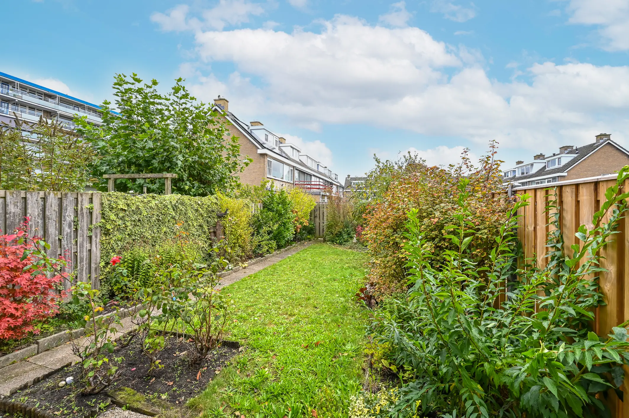 Via de hal bereik je de keuken, die toegang geeft tot de ruime achtertuin op het zuidoosten. Hier kun je de hele dag genieten van de zon. Achter in de tuin bevindt zich een aparte stenen berging, bereikbaar via de steeg aan de achterzijde – ideaal voor fietsen of tuingereedschap.