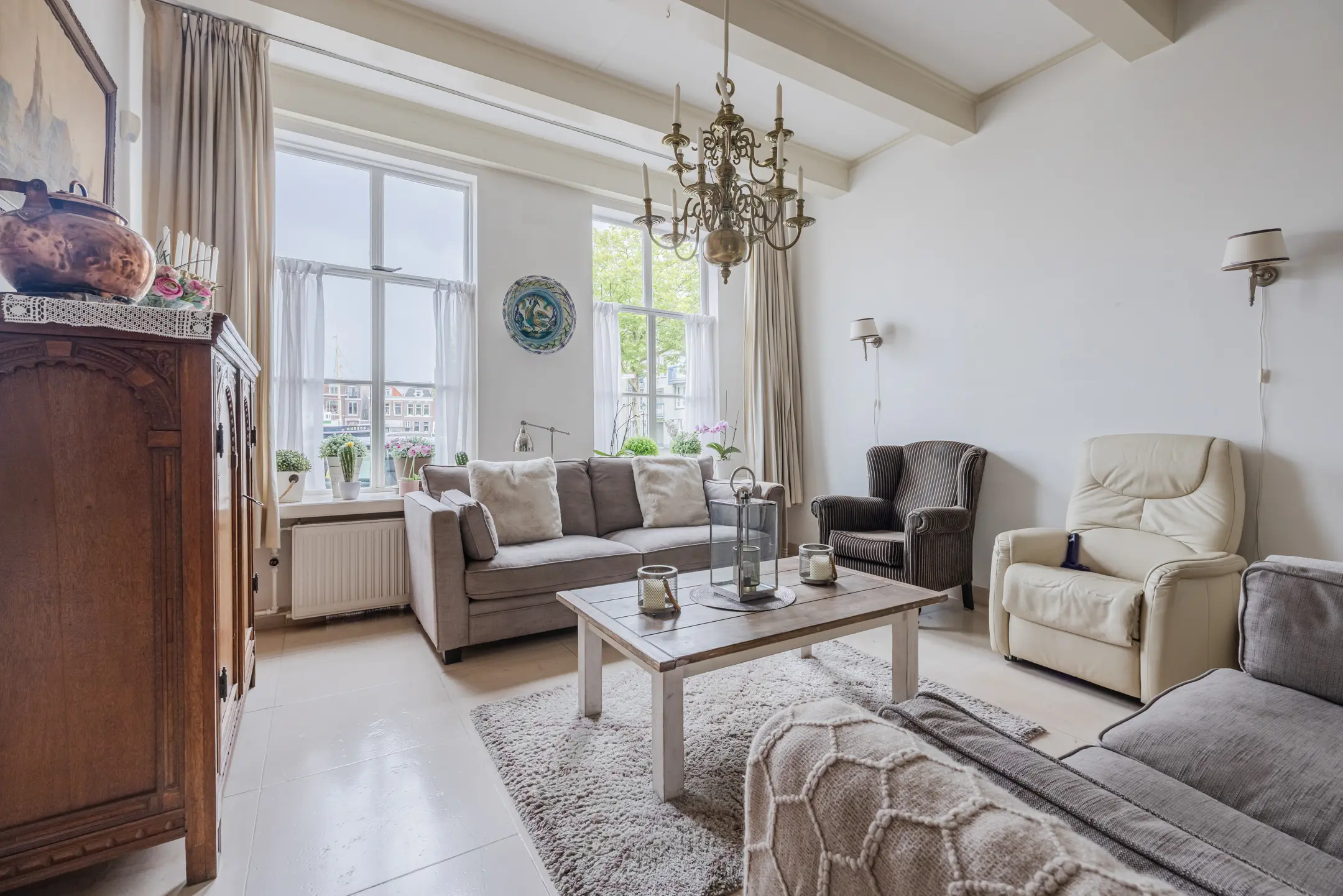 Aan de voorzijde ligt de royale woonkamer, zonder twijfel één van de blikvangers van het huis. Dankzij de hoge raampartijen valt het daglicht hier rijkelijk naar binnen en is het uitzicht over de havenkom werkelijk uniek. De tegelvloer met comfortabele vloerverwarming en de sfeervolle houtkachel zorgen voor warmte en behaaglijkheid in elk seizoen. Dit is een plek om tot rust te komen en te genieten van het water, de boten en het levendige straatbeeld.