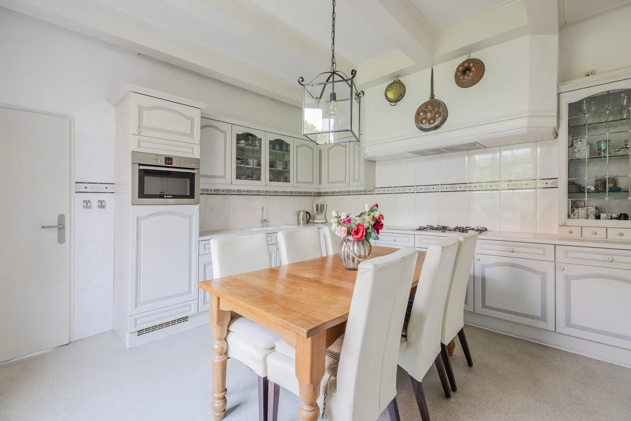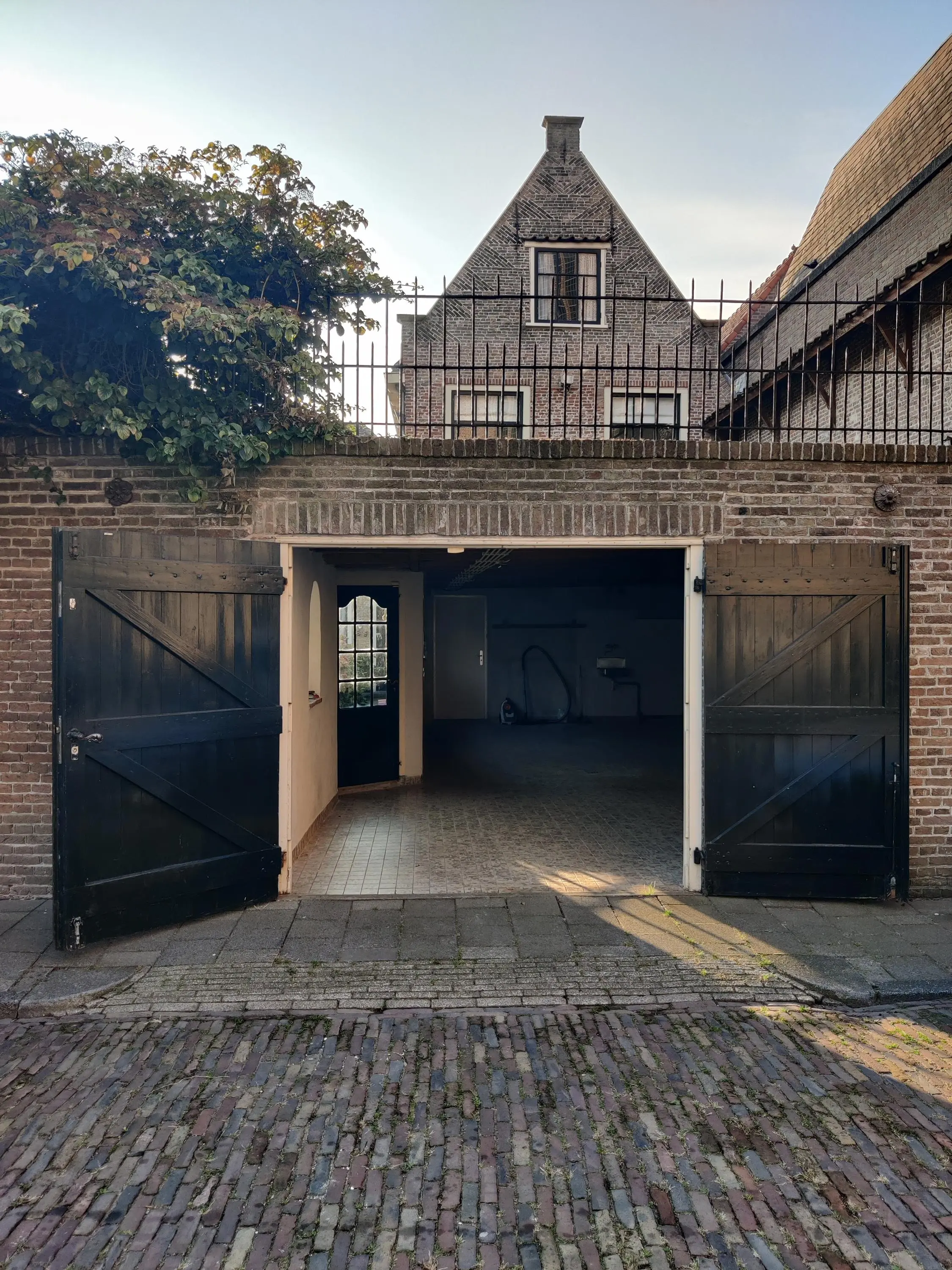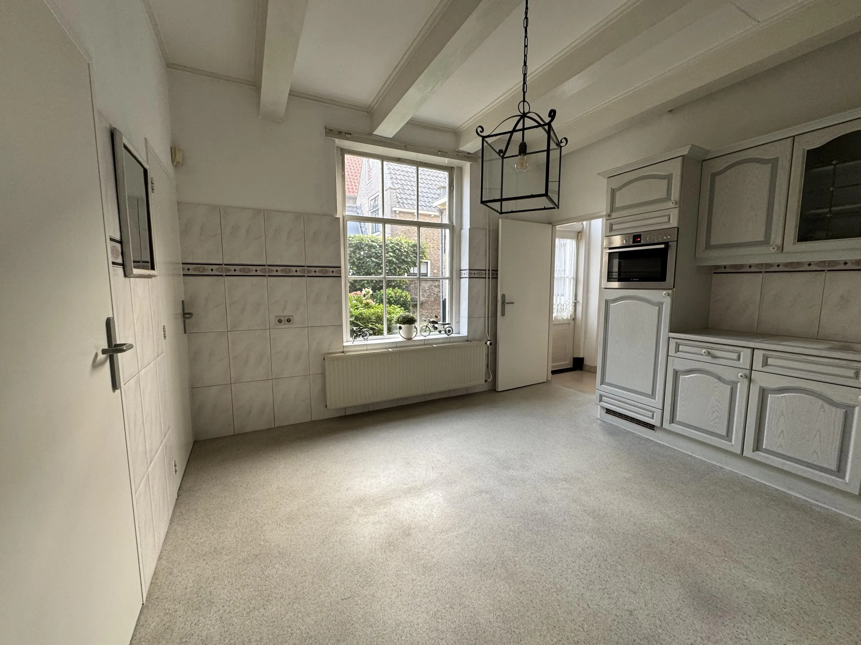 Via de woonkamer bereik je een centrale hal met toegang tot de achtertuin en de trapopgang naar de eerste verdieping. Aan de achterzijde bevindt zich de ruime woonkeuken, groot genoeg voor een royale eettafel en het sociale hart van het huis. Hier wordt gekookt, geleefd en samengekomen. De keuken staat in directe verbinding met de inpandige dubbele garage, een absolute luxe op deze historische locatie. In de garage bevinden zich tevens de aansluitingen voor wasmachine en droger en extra bergruimte.
