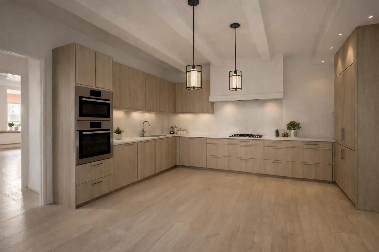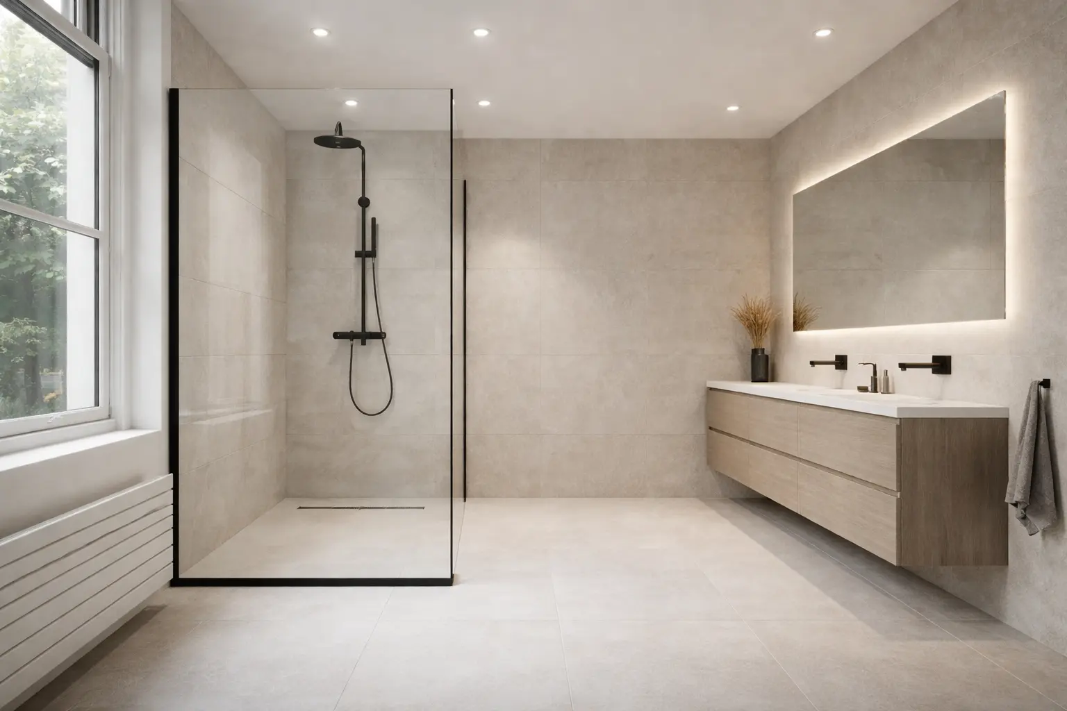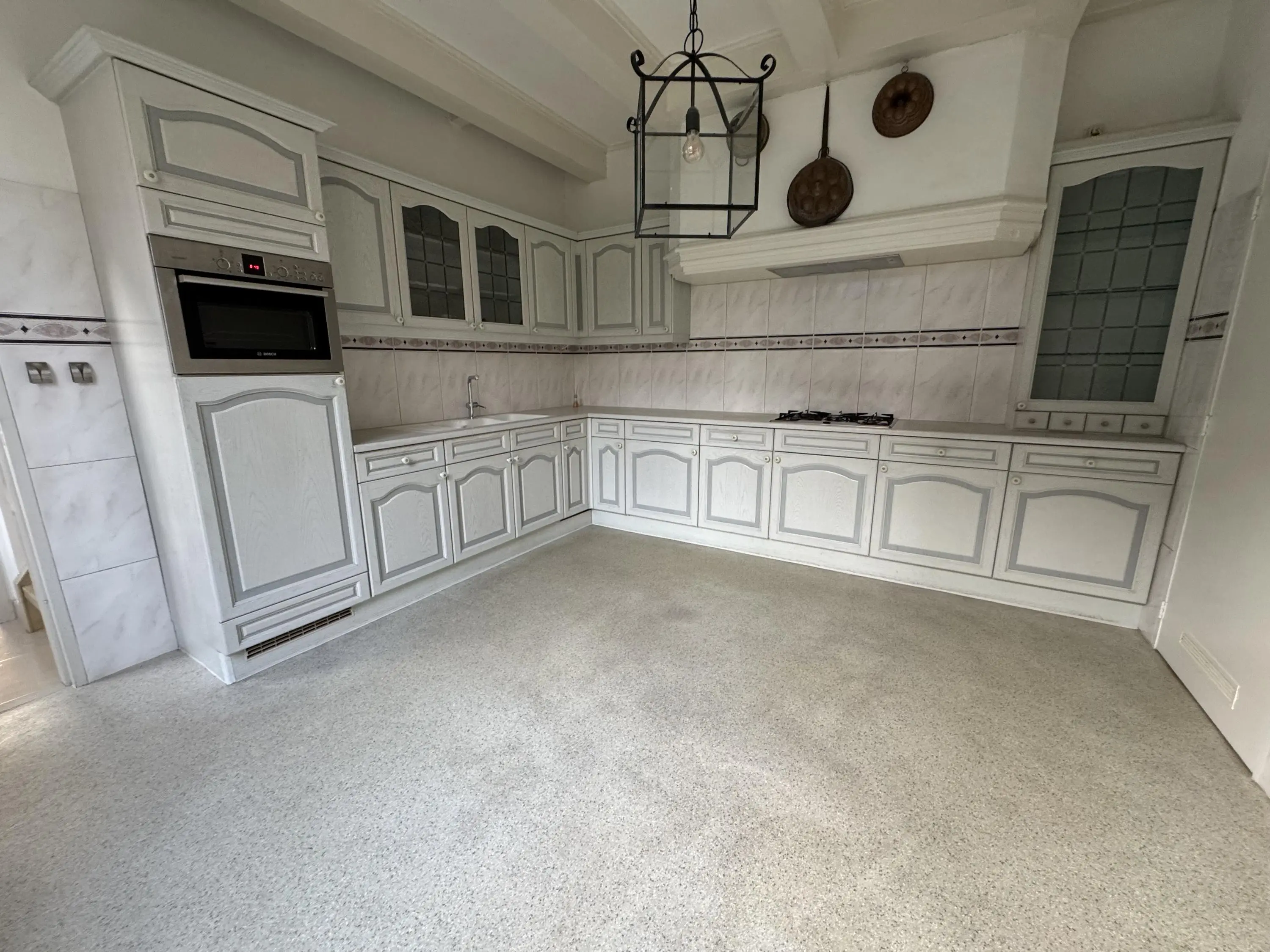 Via de woonkamer bereik je een centrale hal met toegang tot de achtertuin en de trapopgang naar de eerste verdieping. Aan de achterzijde bevindt zich de ruime woonkeuken, groot genoeg voor een royale eettafel en het sociale hart van het huis. Hier wordt gekookt, geleefd en samengekomen. De keuken staat in directe verbinding met de inpandige dubbele garage, een absolute luxe op deze historische locatie. In de garage bevinden zich tevens de aansluitingen voor wasmachine en droger en extra bergruimte.