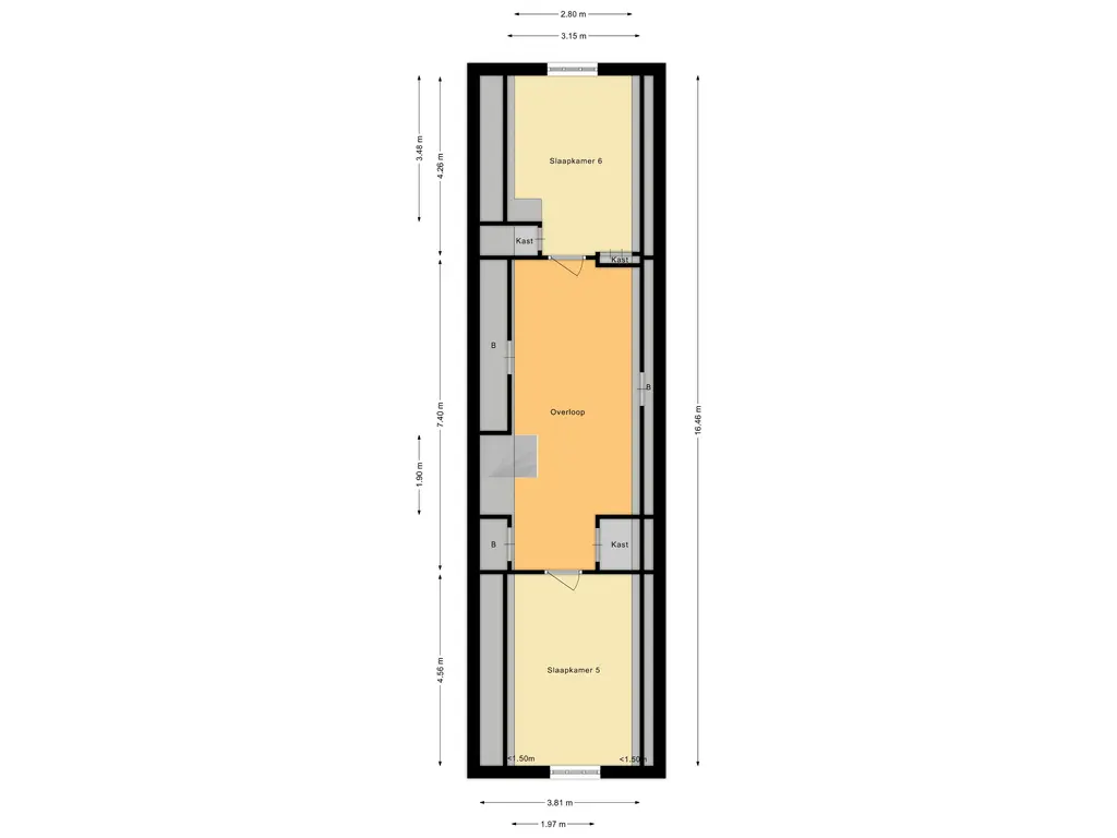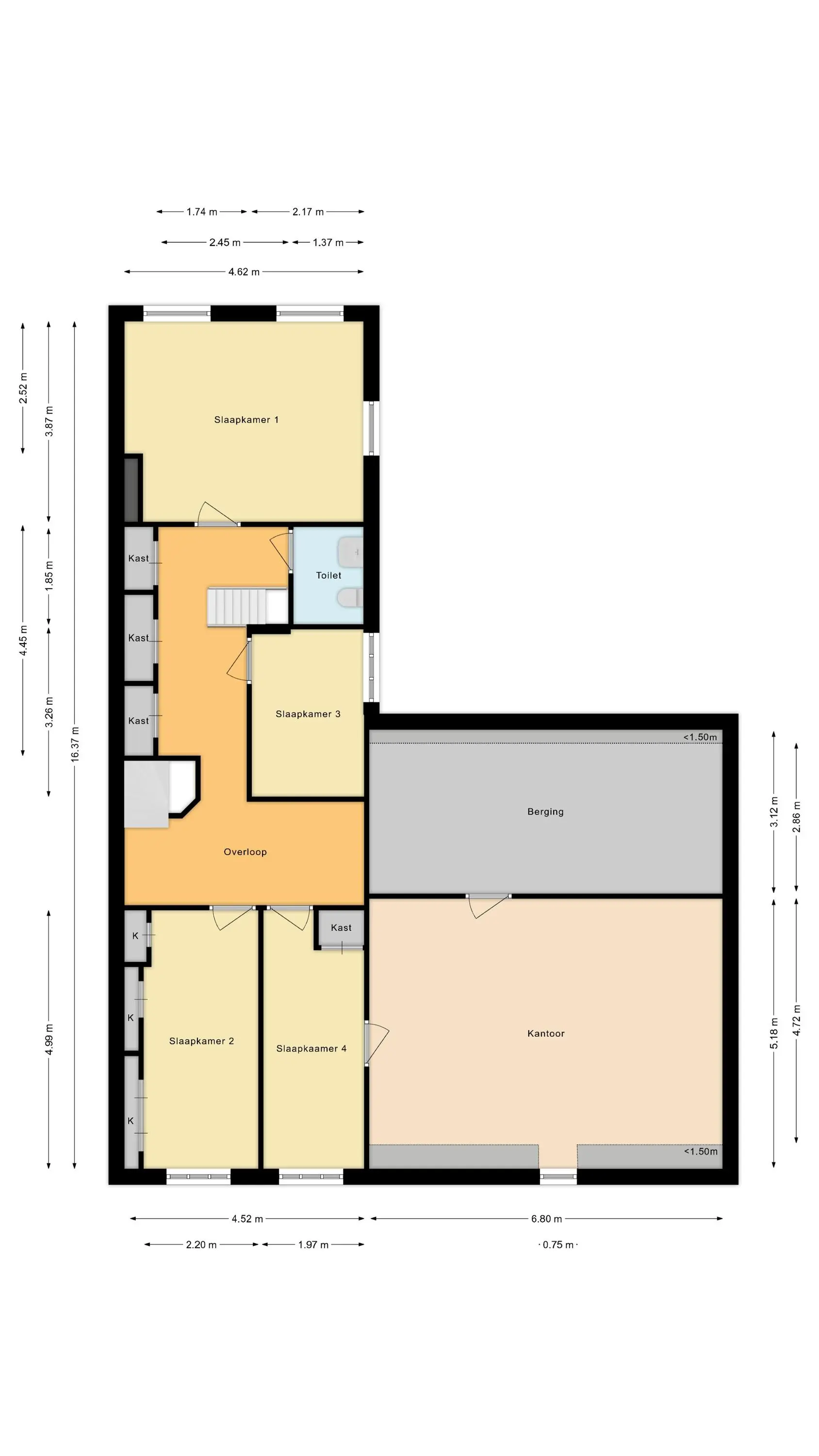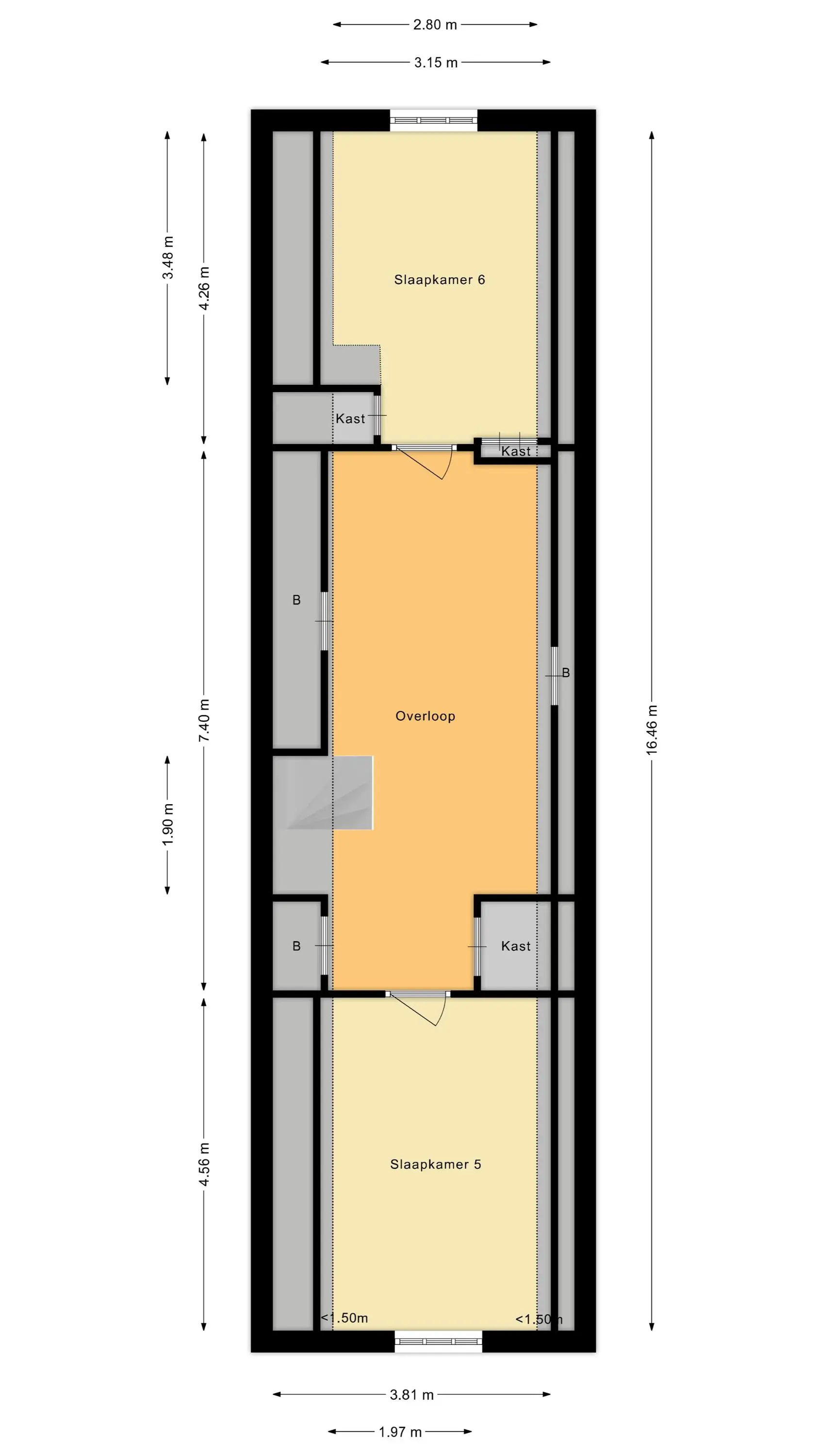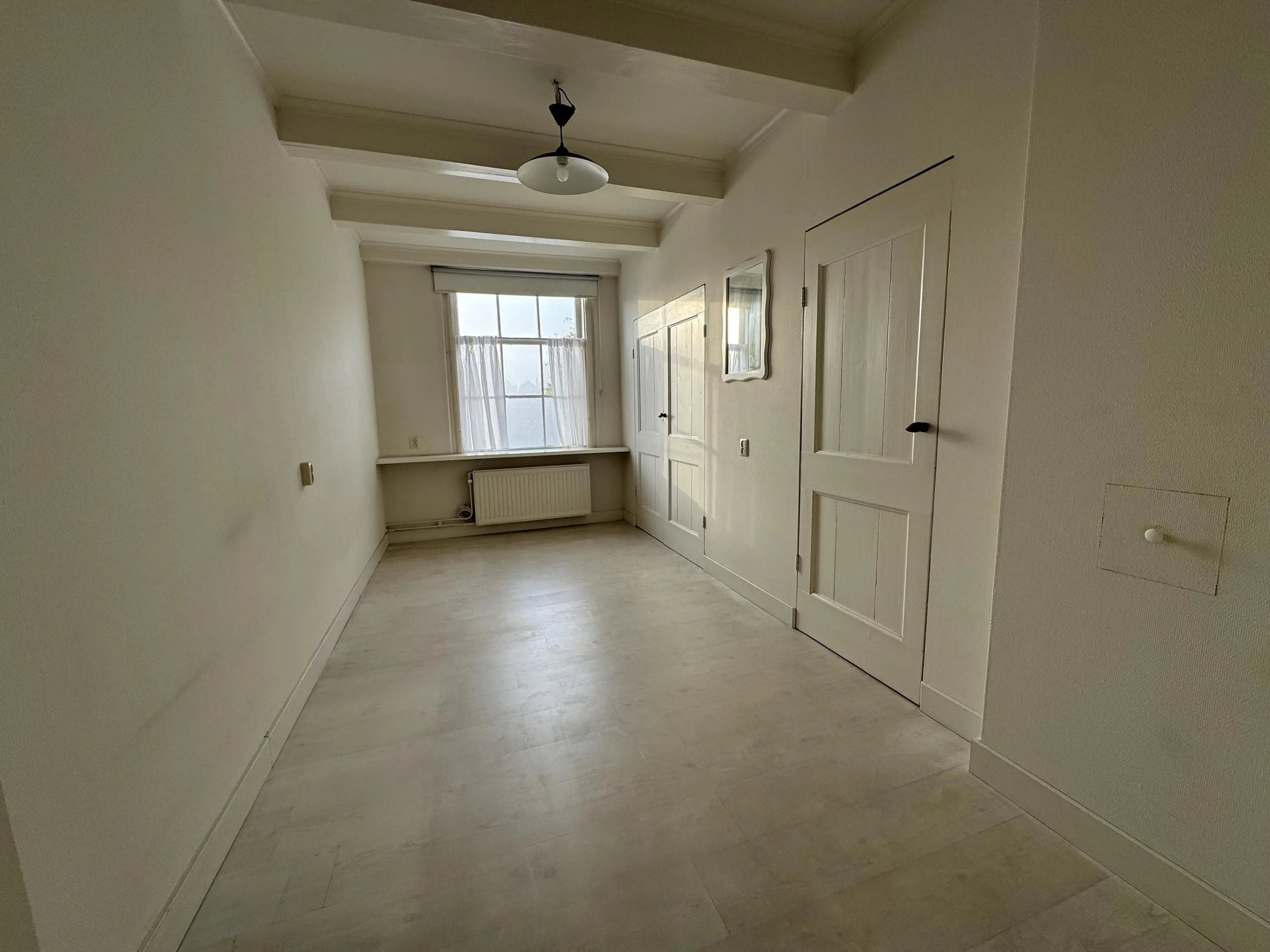 Via een vaste trap bereik je de tweede verdieping. Hier bevindt zich een ruime overloop met bergruimte aan weerszijden en nog twee volwaardige slaapkamers aan de voor- en achterzijde. Deze ruimtes zijn ideaal als logeerkamer, tienerkamer of hobby- en atelieruimte. Ook op deze verdieping zijn de authentieke details, zoals balken en karakteristieke raampartijen, prachtig behouden gebleven.
