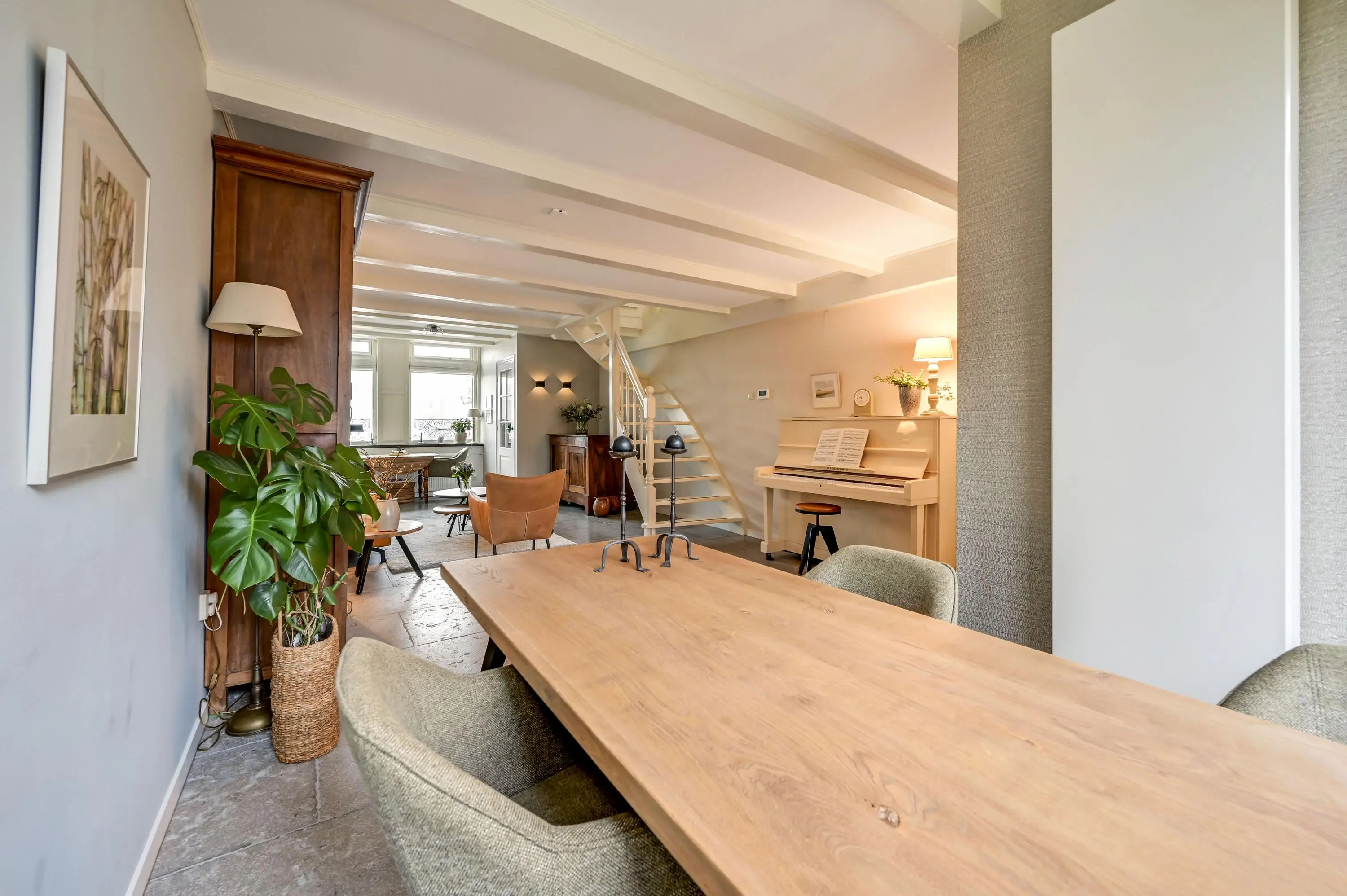 Bij binnenkomst valt direct de hoogwaardige afwerking op. De begane grond is voorzien van een nieuwe natuurstenen vloer (2023) met een reeds betonnen ondervloer, wat zorgt voor een solide en luxe basis. In de sfeervolle woonkamer geniet je van een open haard, een uitbouw met openslaande deuren aan de achterzijde en een fraai uitzicht op de vliet.