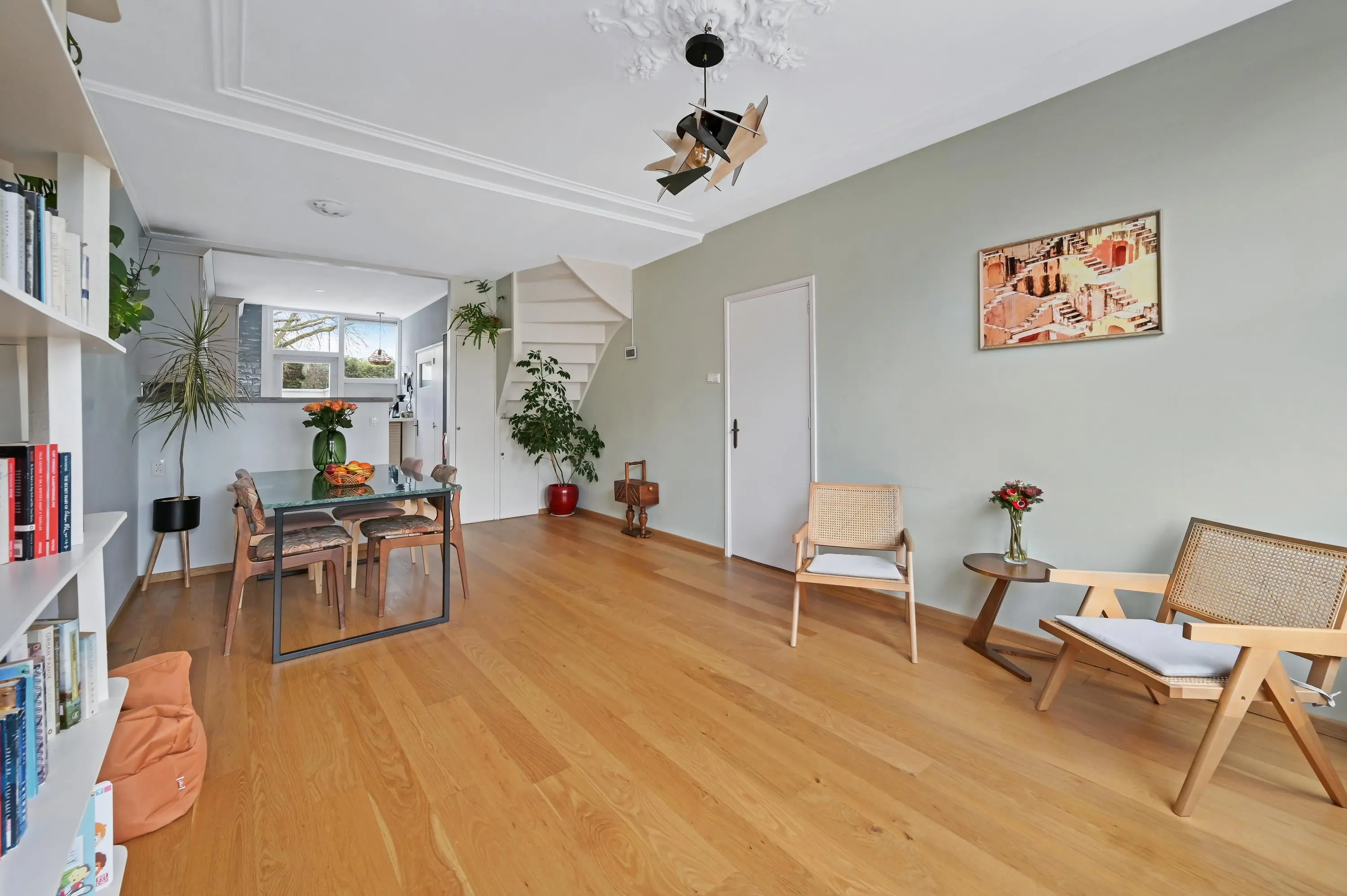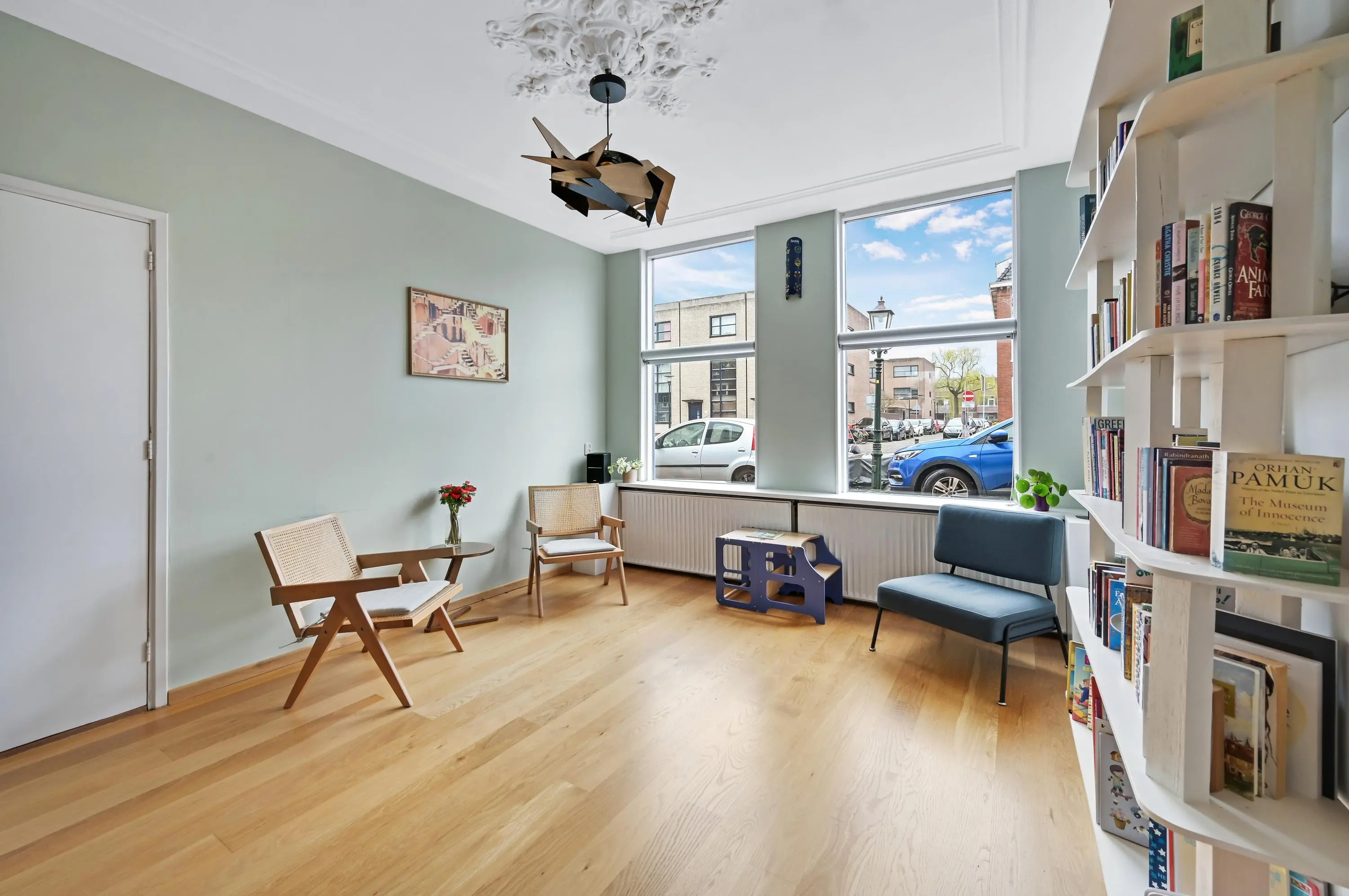 De woonkamer is afgewerkt in een stijlvolle combinatie van brocante en moderne elementen. De houten vloer en het karakteristieke ornamentenplafond geven de ruimte een warme en authentieke uitstraling.