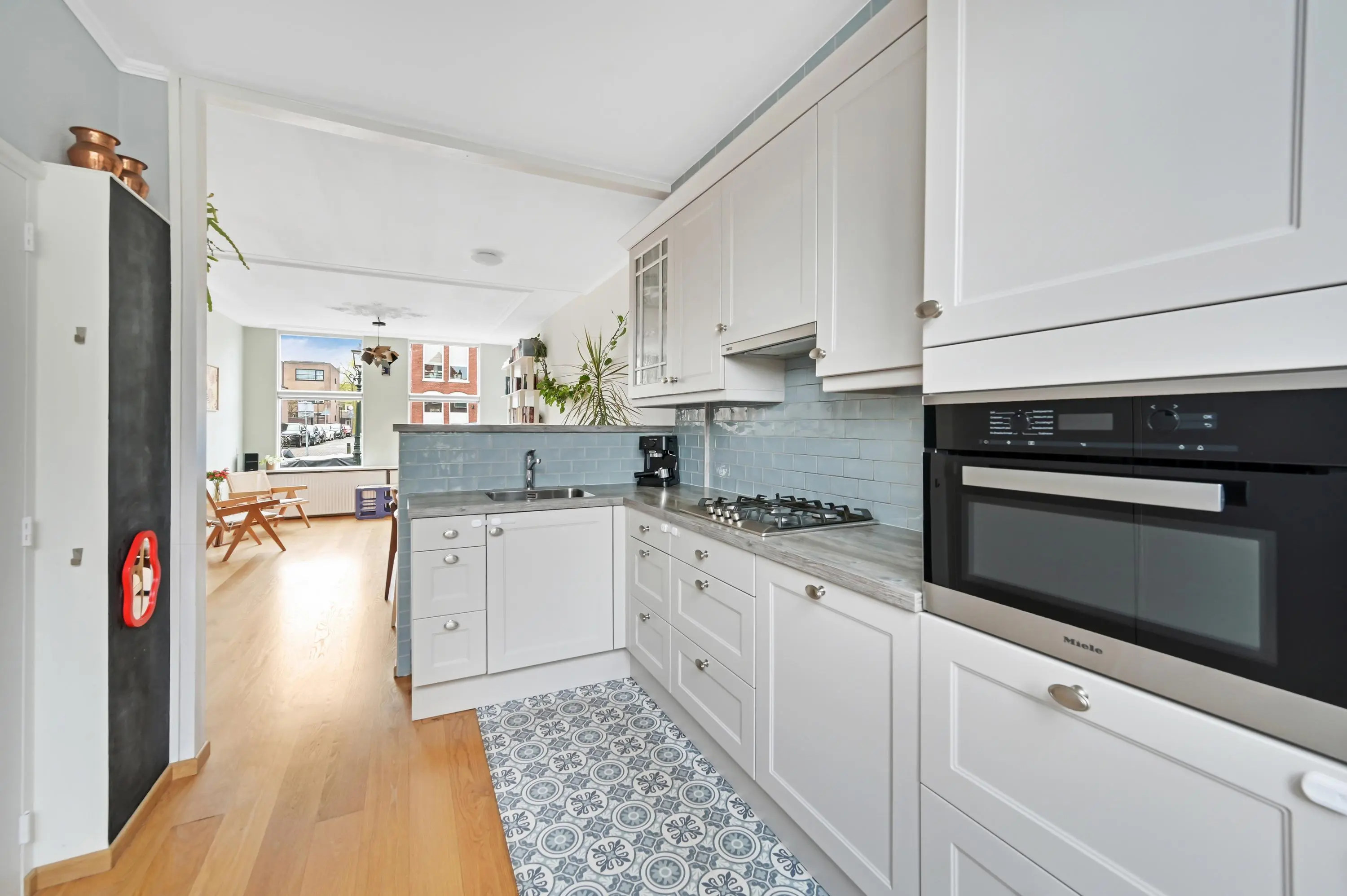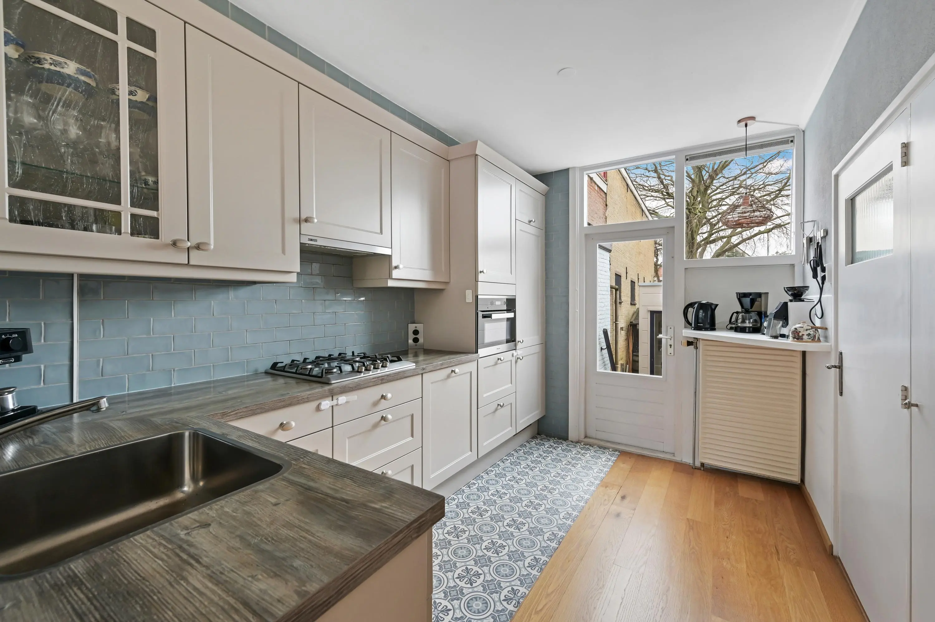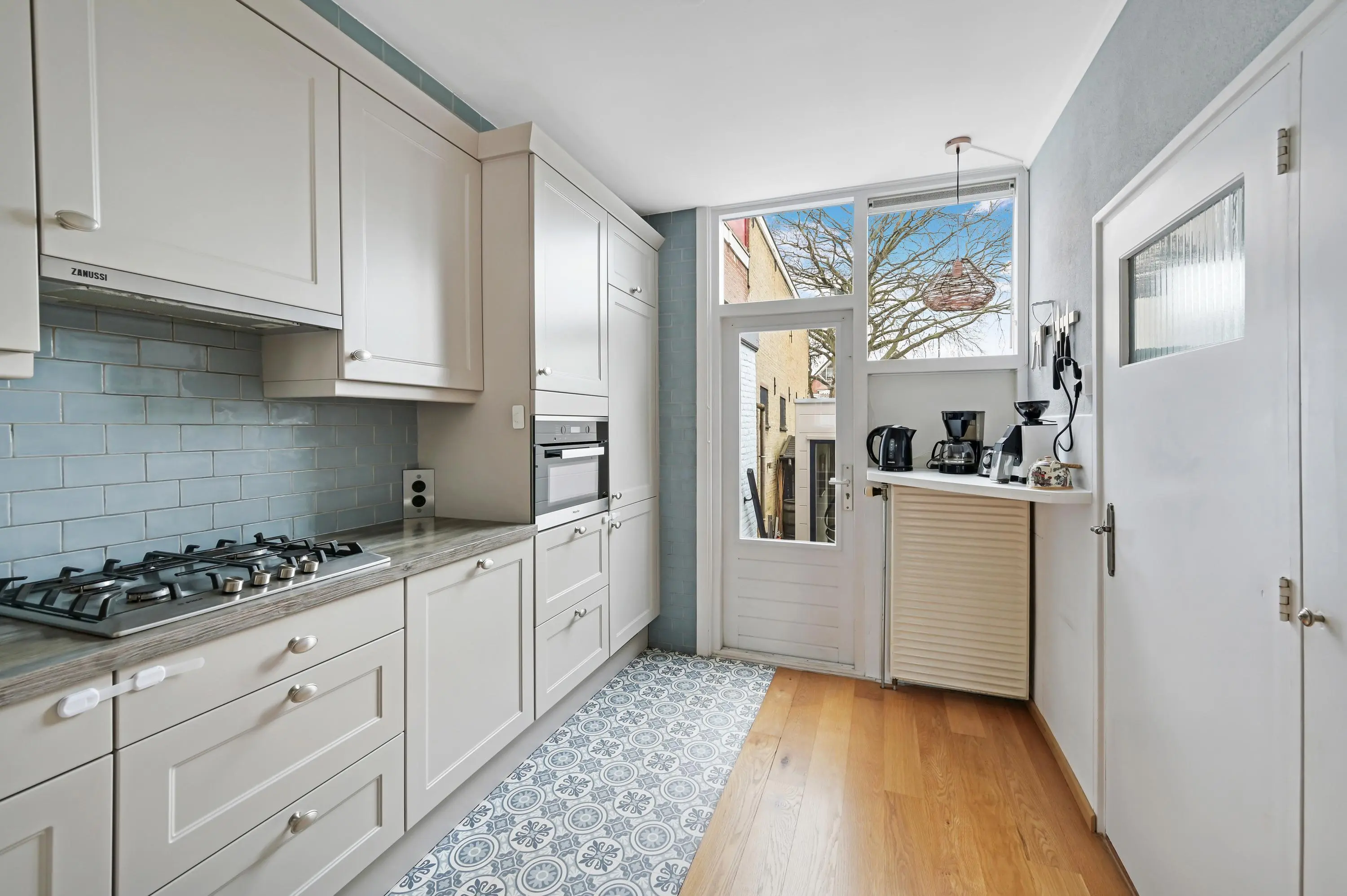 Aan de achterzijde bevindt zich de halfopen keuken (2018), uitgevoerd in een praktische hoekopstelling en voorzien van diverse inbouwapparatuur, waaronder een 4-pits gaskookplaat, vlakscherm afzuigkap, vaatwasser, koel-/vriescombinatie en combi-oven. Vanuit de keuken is er toegang tot de tuin en de hal.
