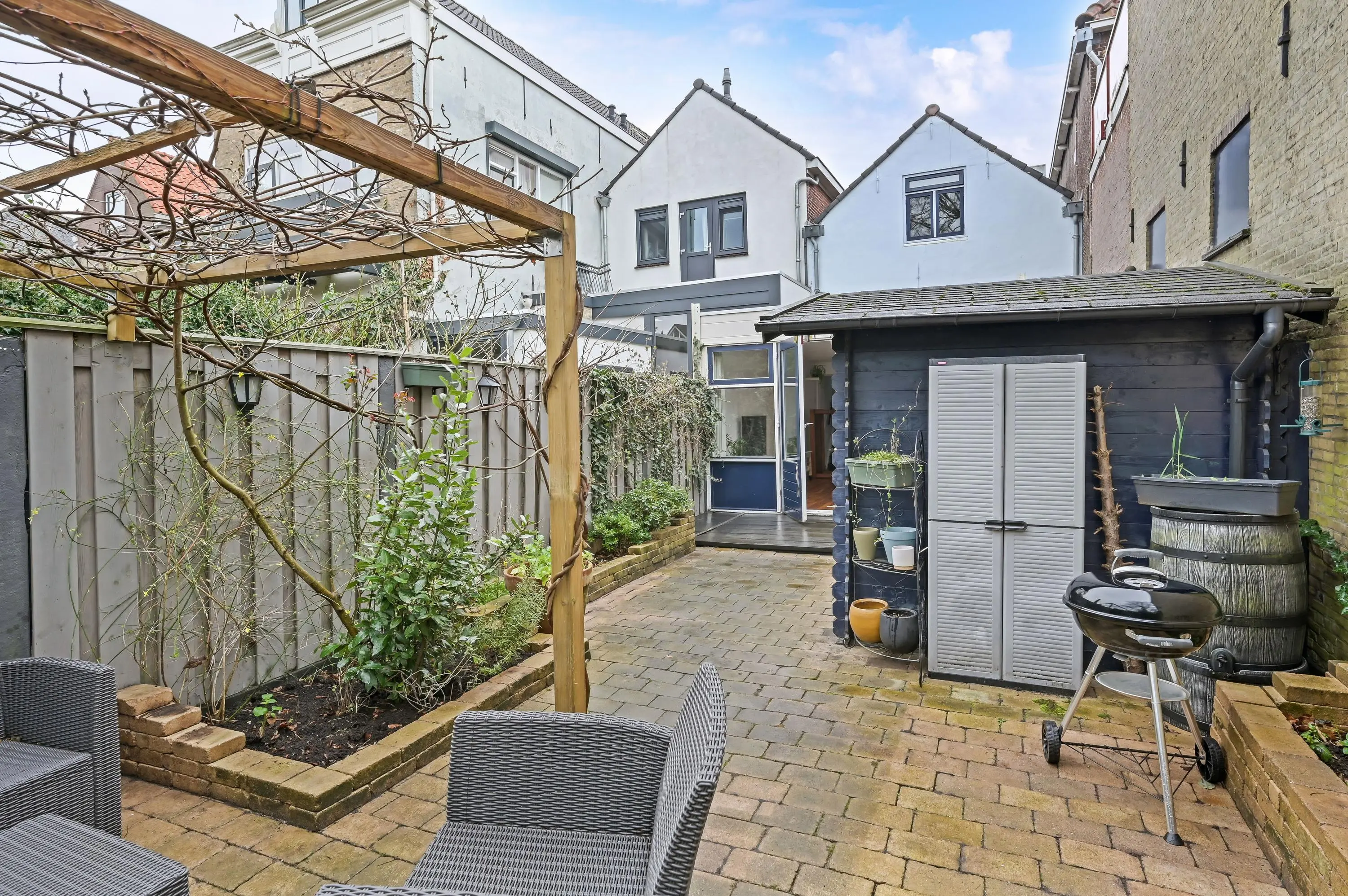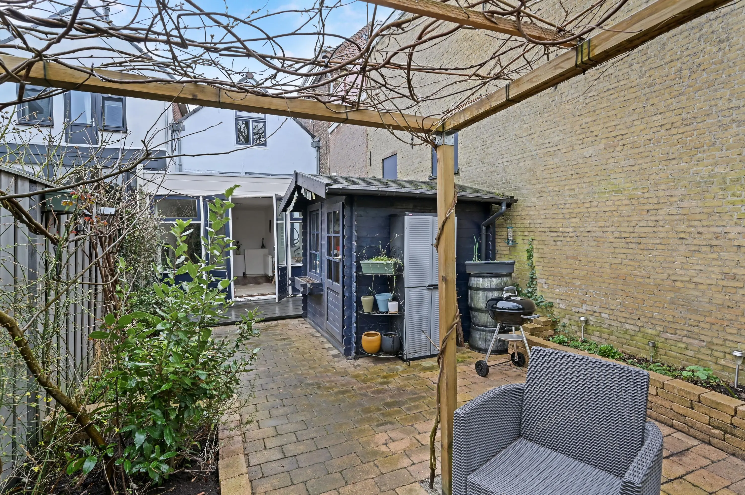 Achterin de tuin bevindt zich een praktische berging voor fietsen en tuingereedschap.