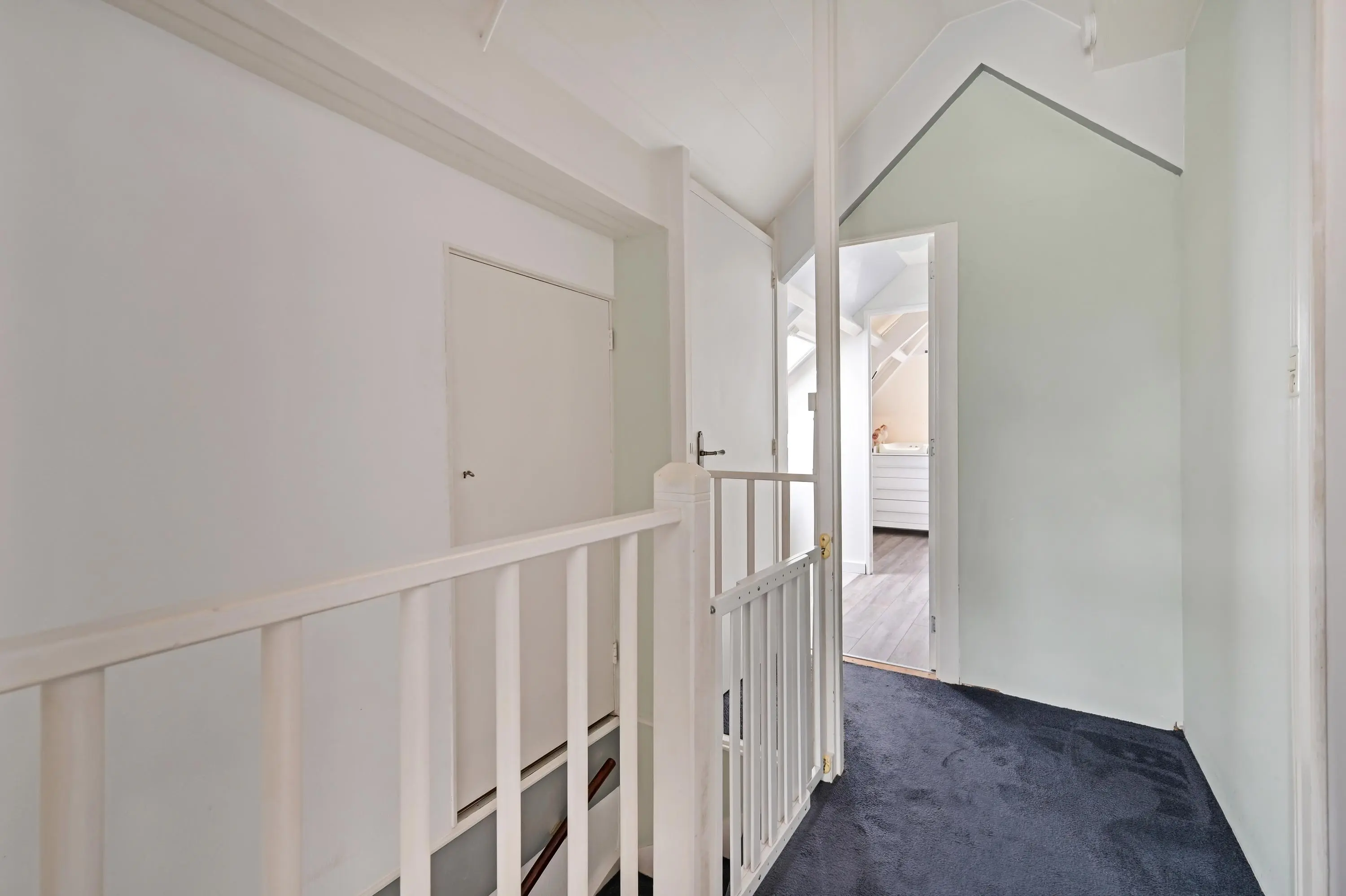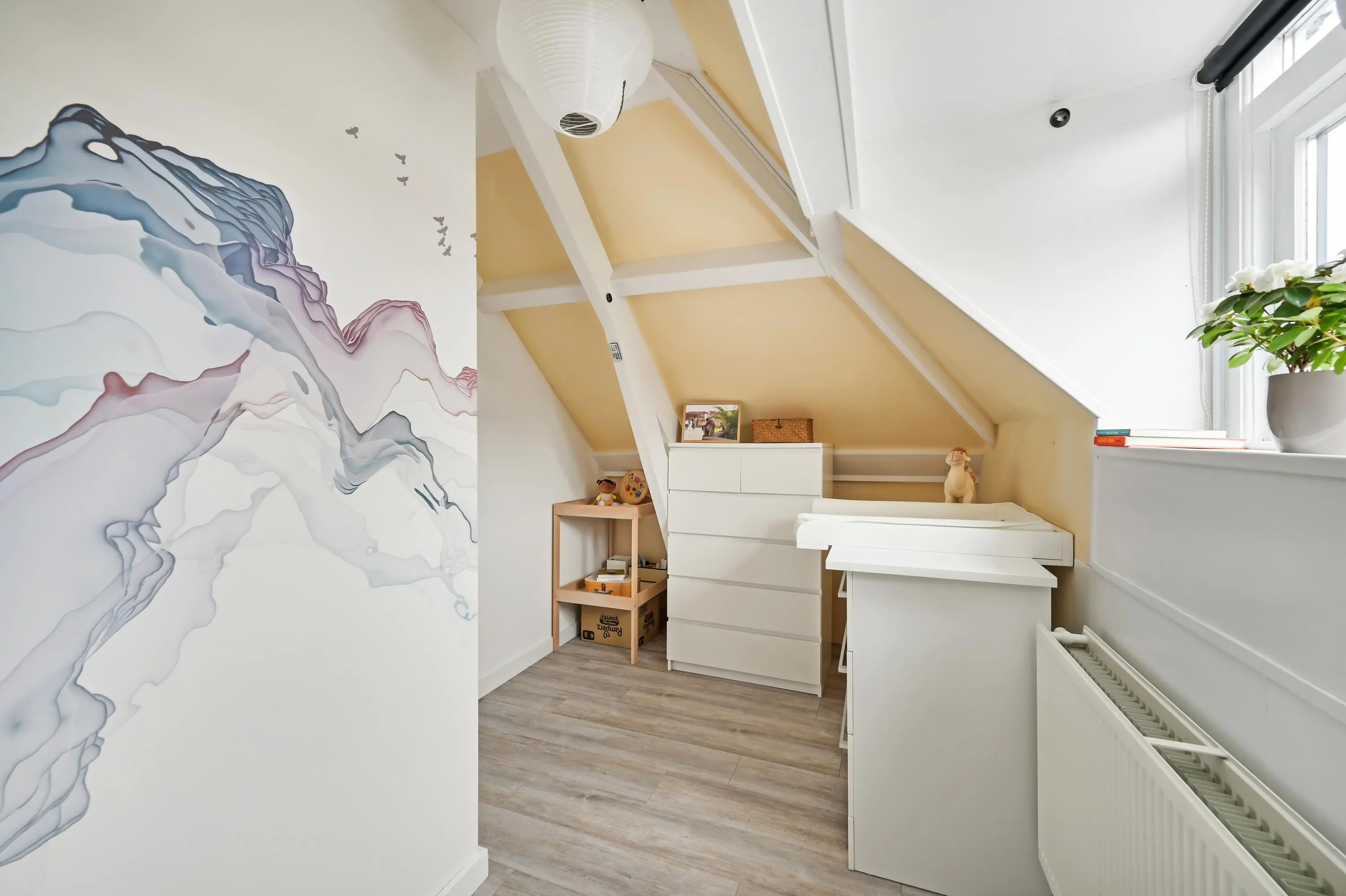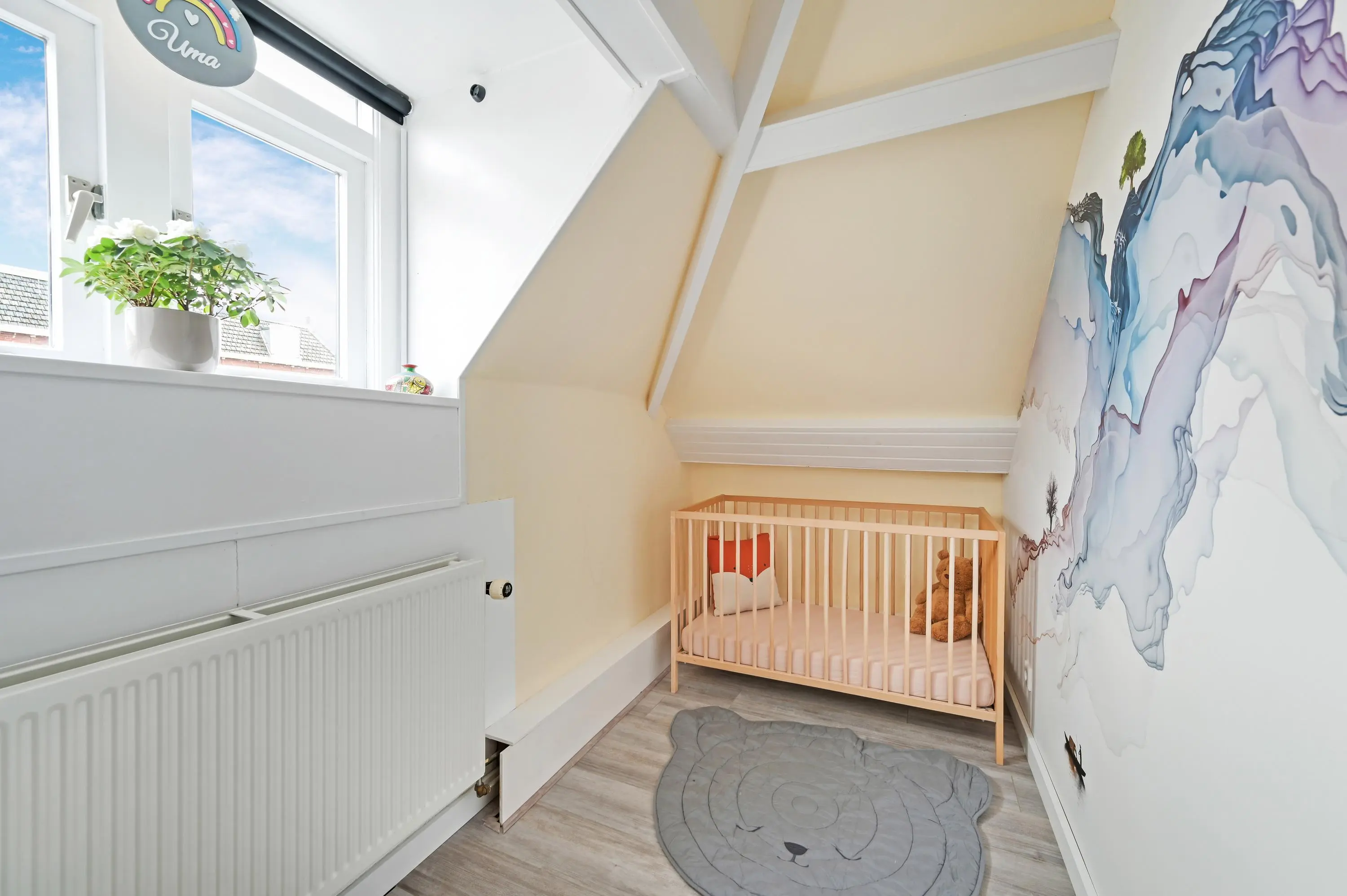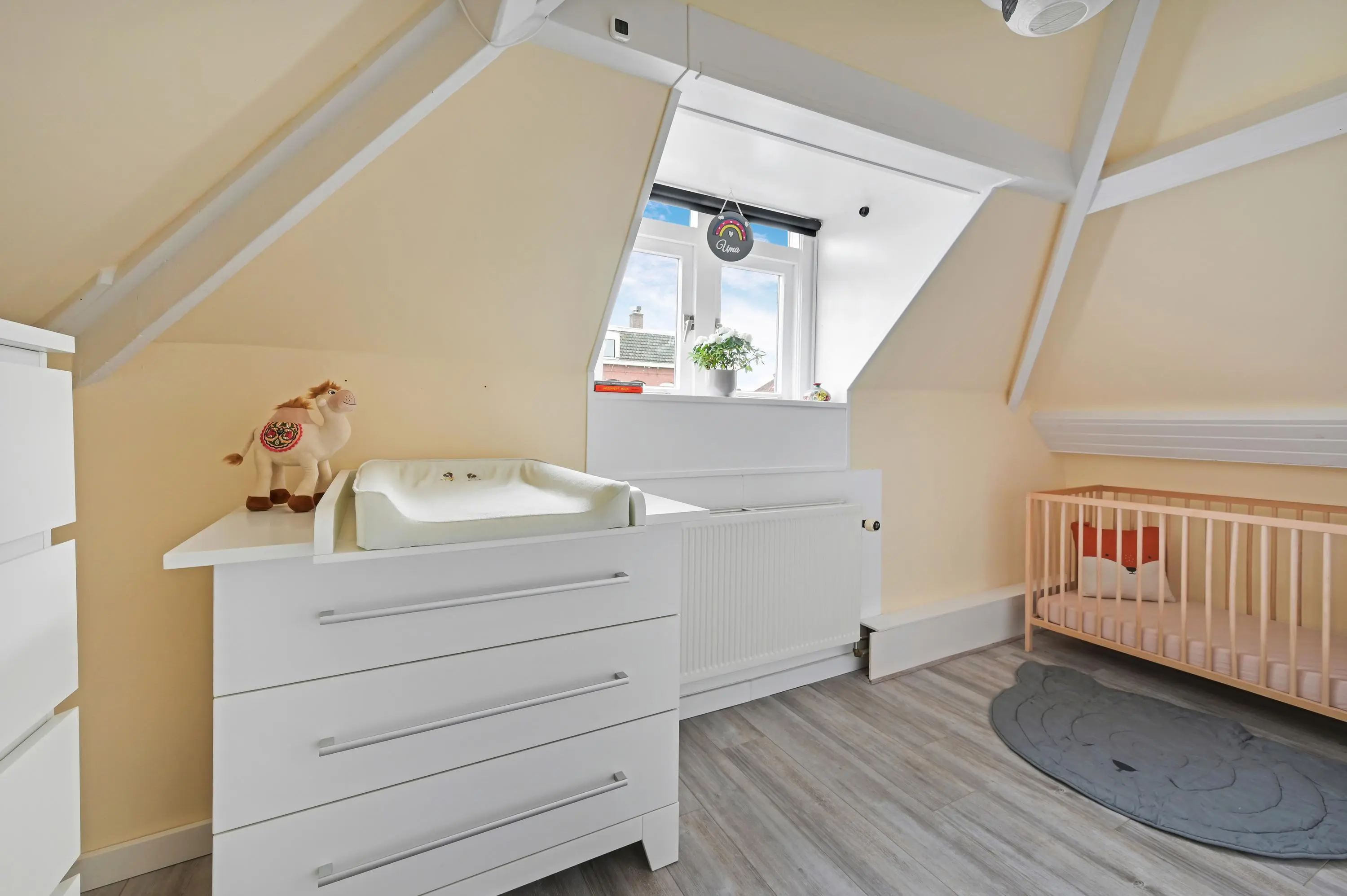 Op de eerste verdieping bevinden zich twee slaapkamers en een praktische indeling met extra functies. Beide slaapkamers zijn afgewerkt met een nette laminaatvloer en hebben zichtbare balken die bijdragen aan de karakteristieke sfeer.
