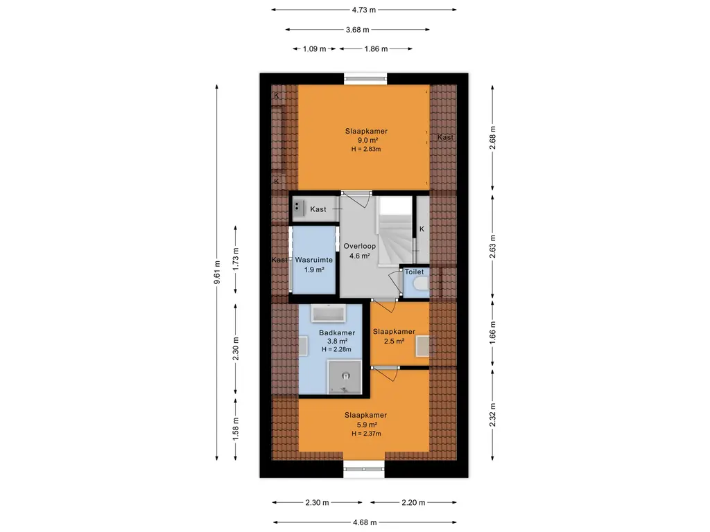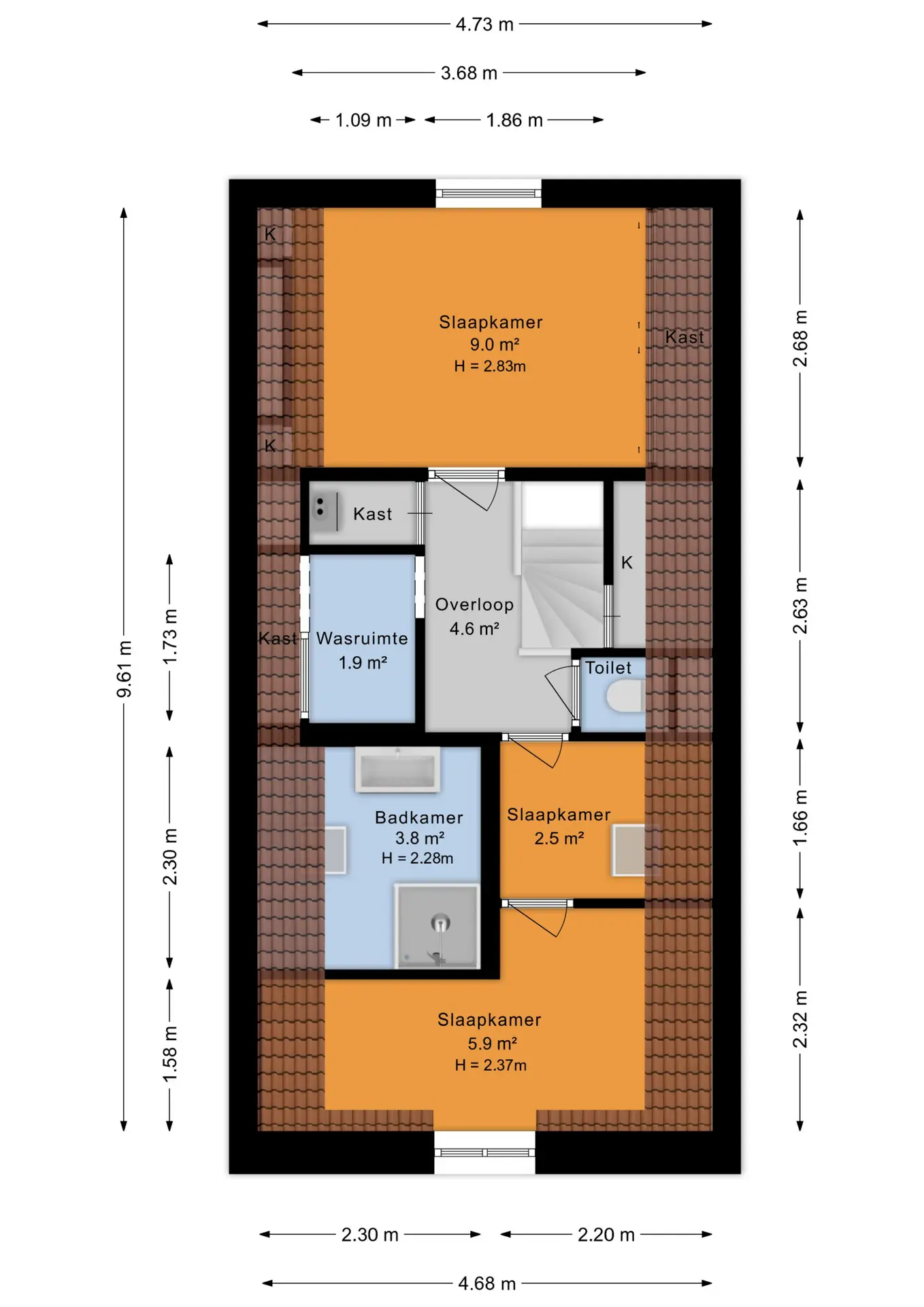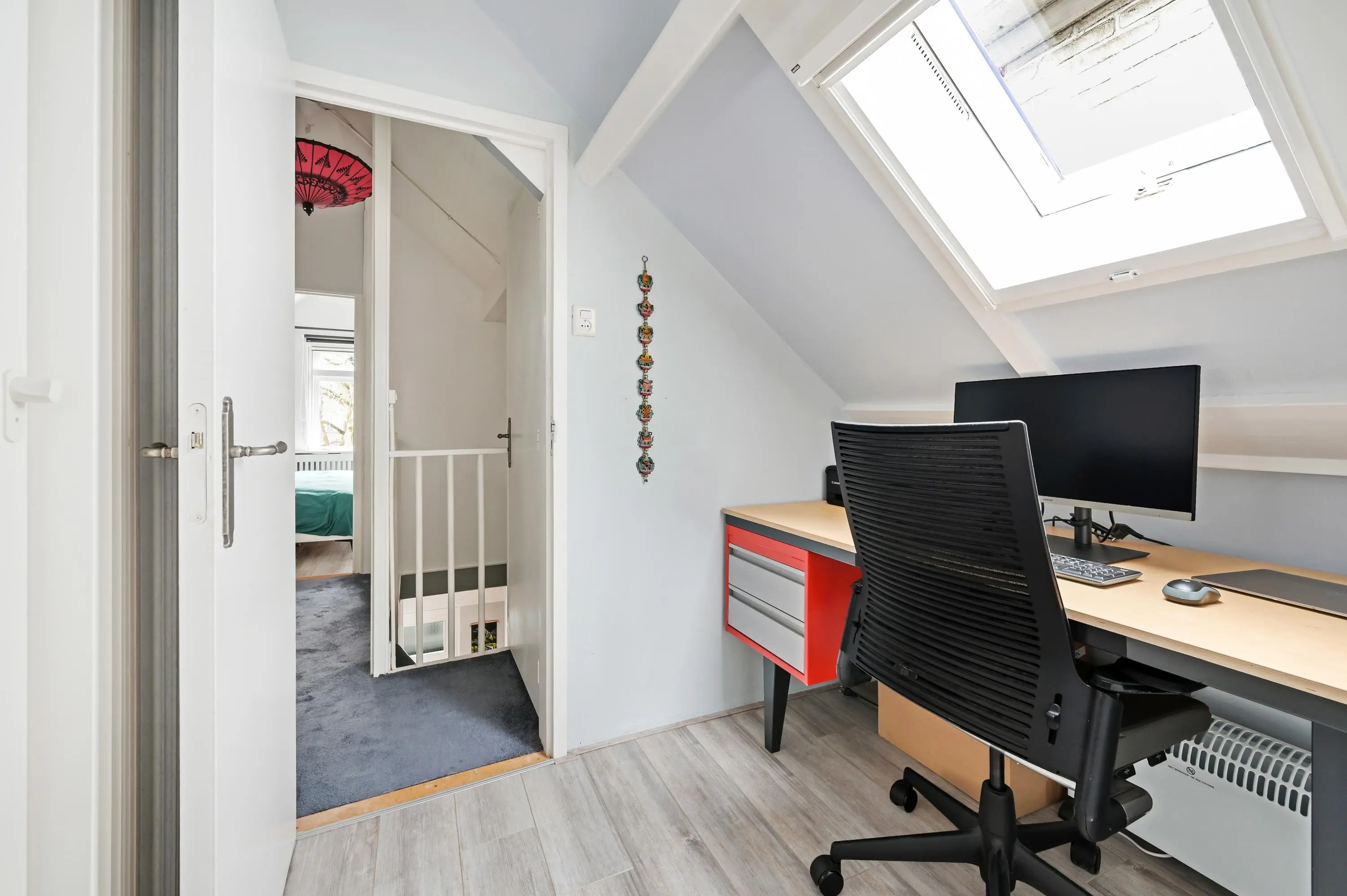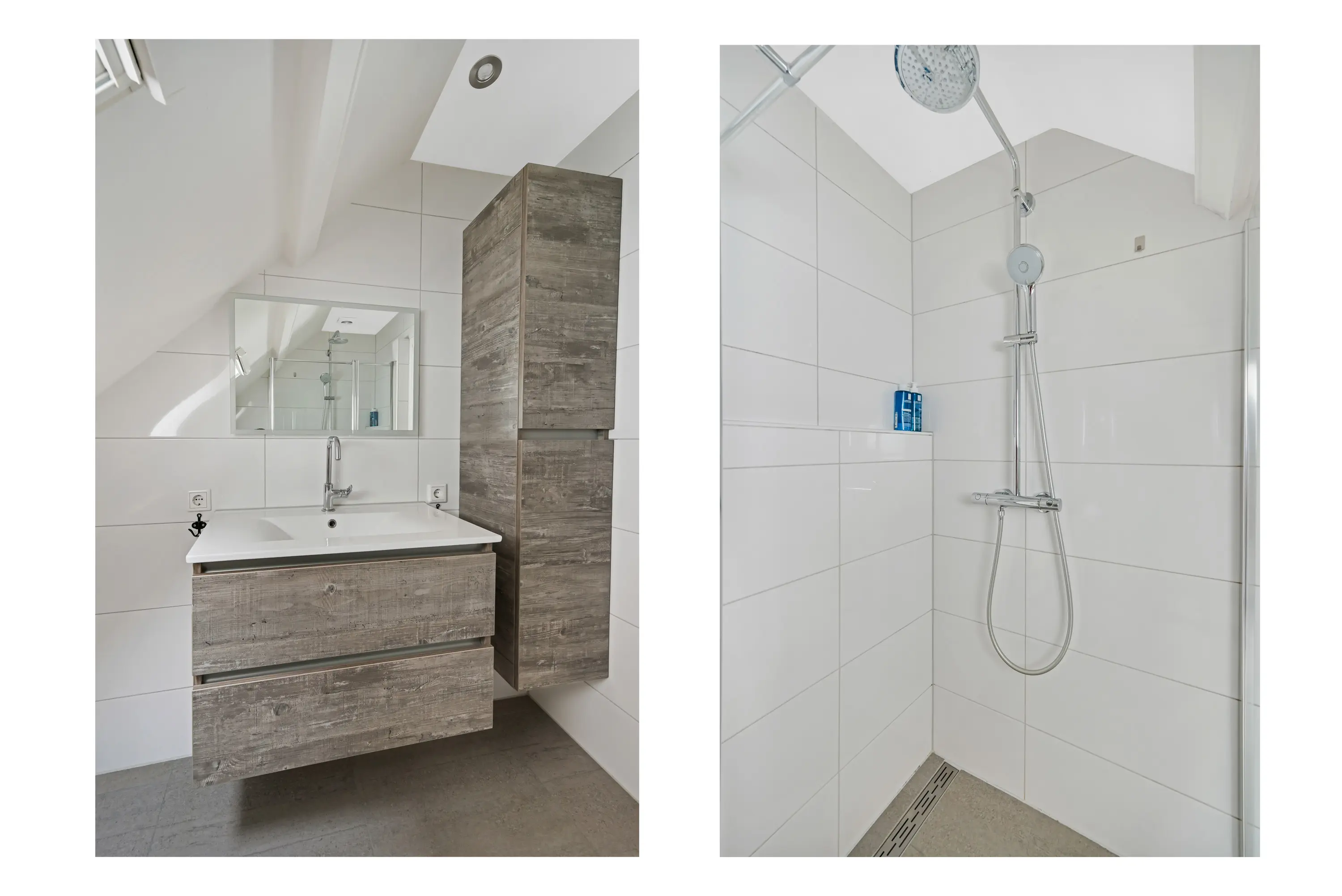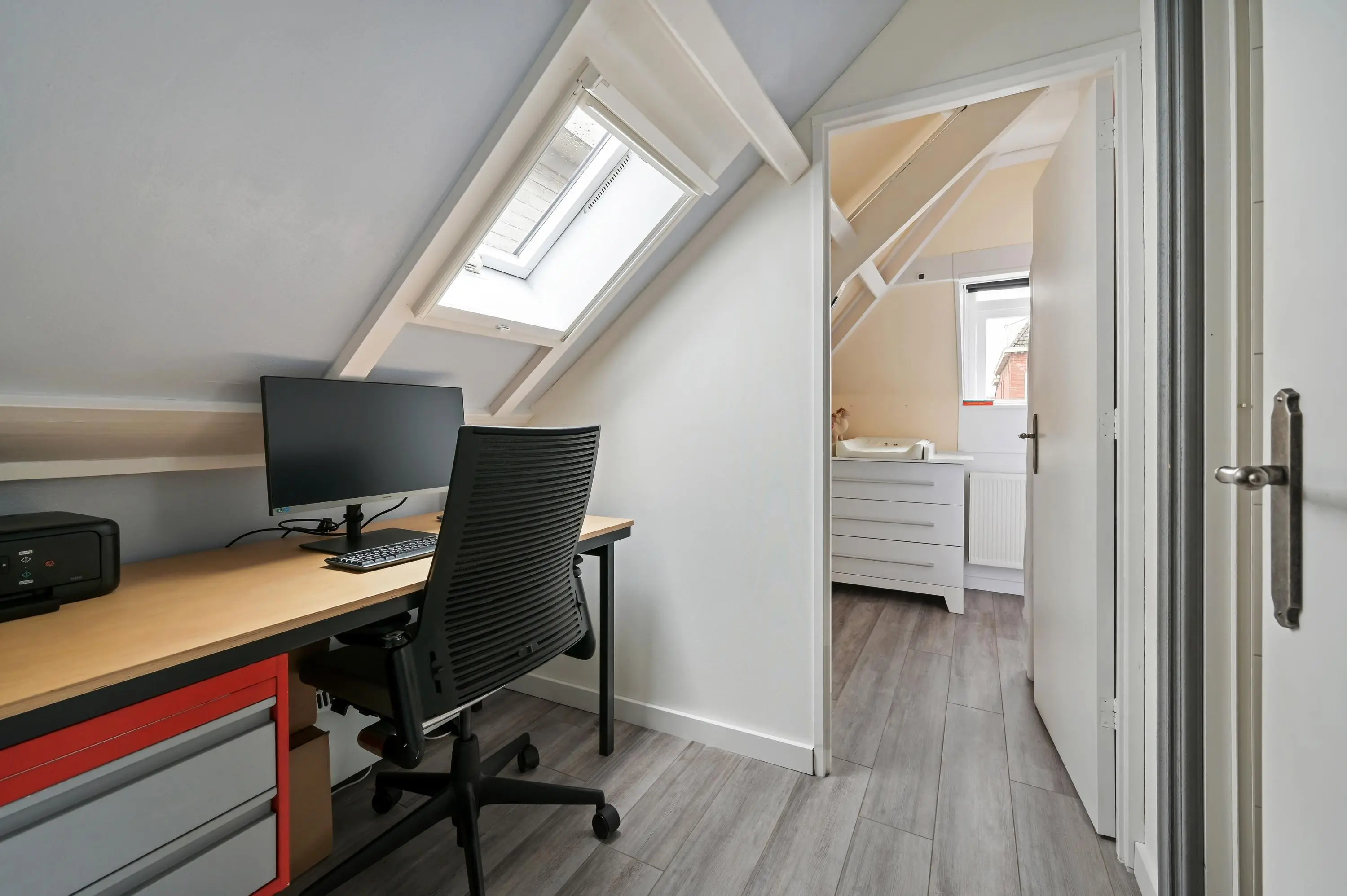De slaapkamer aan de voorzijde beschikt over een dakraam en dakkapel en biedt een prachtig uitzicht over de Noordvliet. Vanuit deze kamer is er directe toegang tot de moderne badkamer (2017), voorzien van een douchecabine met regendouche, wastafelmeubel, spiegel met verlichting en verwarming en mechanische ventilatie. Op de overloop is een praktische werkplek gecreëerd en is er extra bergruimte aanwezig. Daarnaast vind je hier een aparte toiletruimte (2017) en een wasruimte met aansluitingen voor wasmachine en droger.