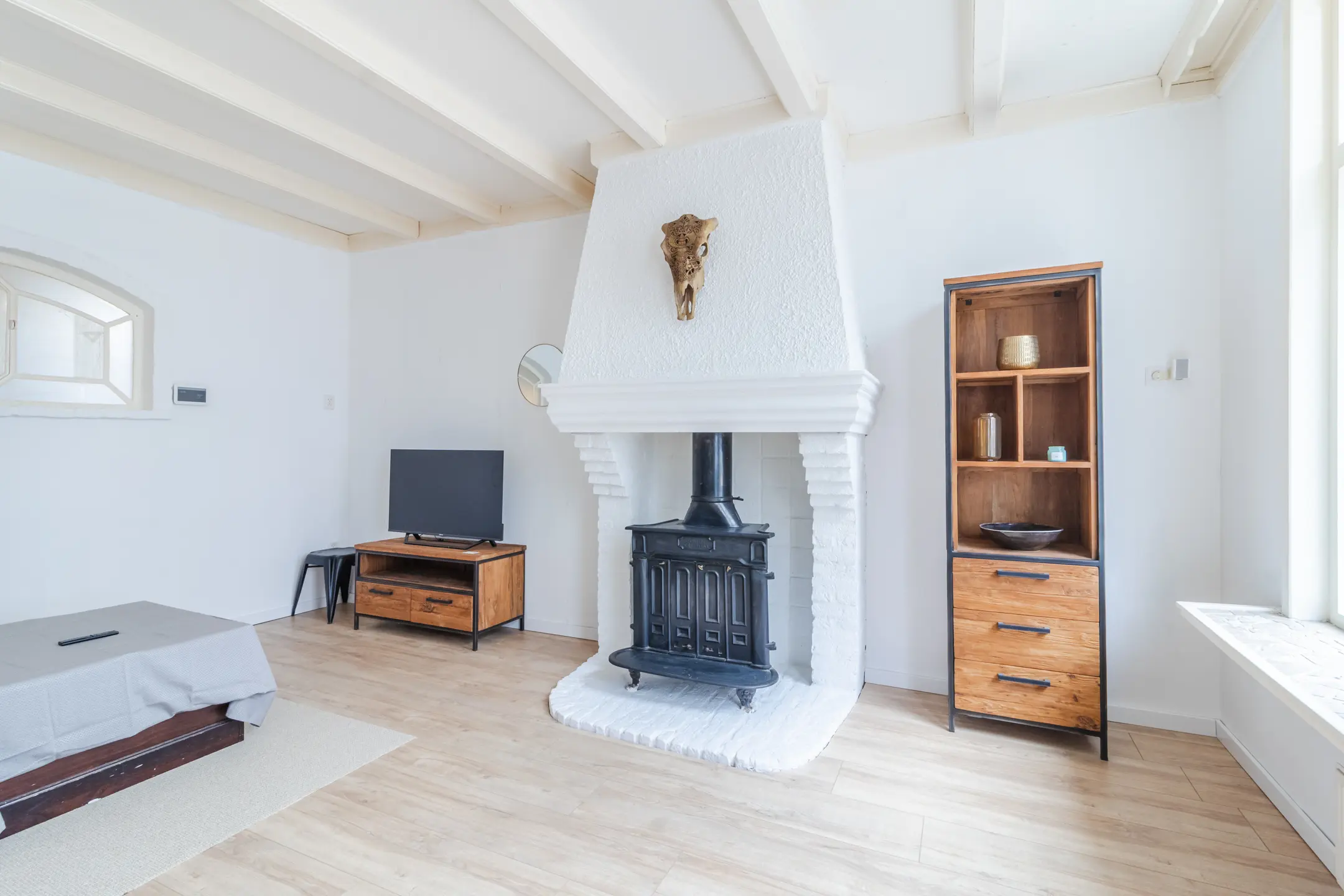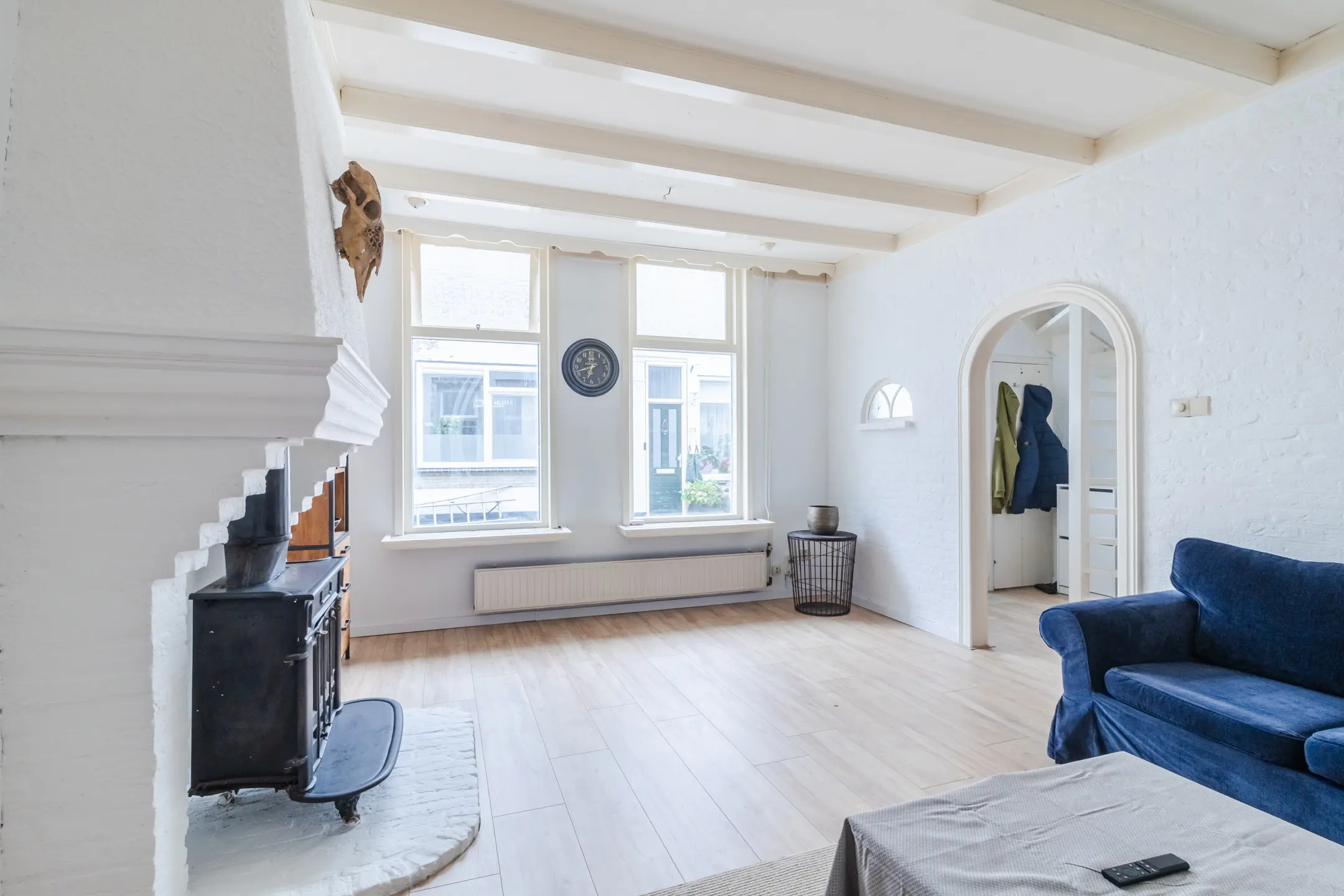 Bij binnenkomst stap je de hal in, met de meterkast en trap naar de eerste verdieping. Vanuit de hal loop je zo door naar de lichte en sfeervolle woonkamer. Hier vind je een prachtig balkenplafond, een drempelloos gelegde laminaatvloer en een gezellige allesbrander in een klassieke schouw – echt een warme, uitnodigende ruimte.