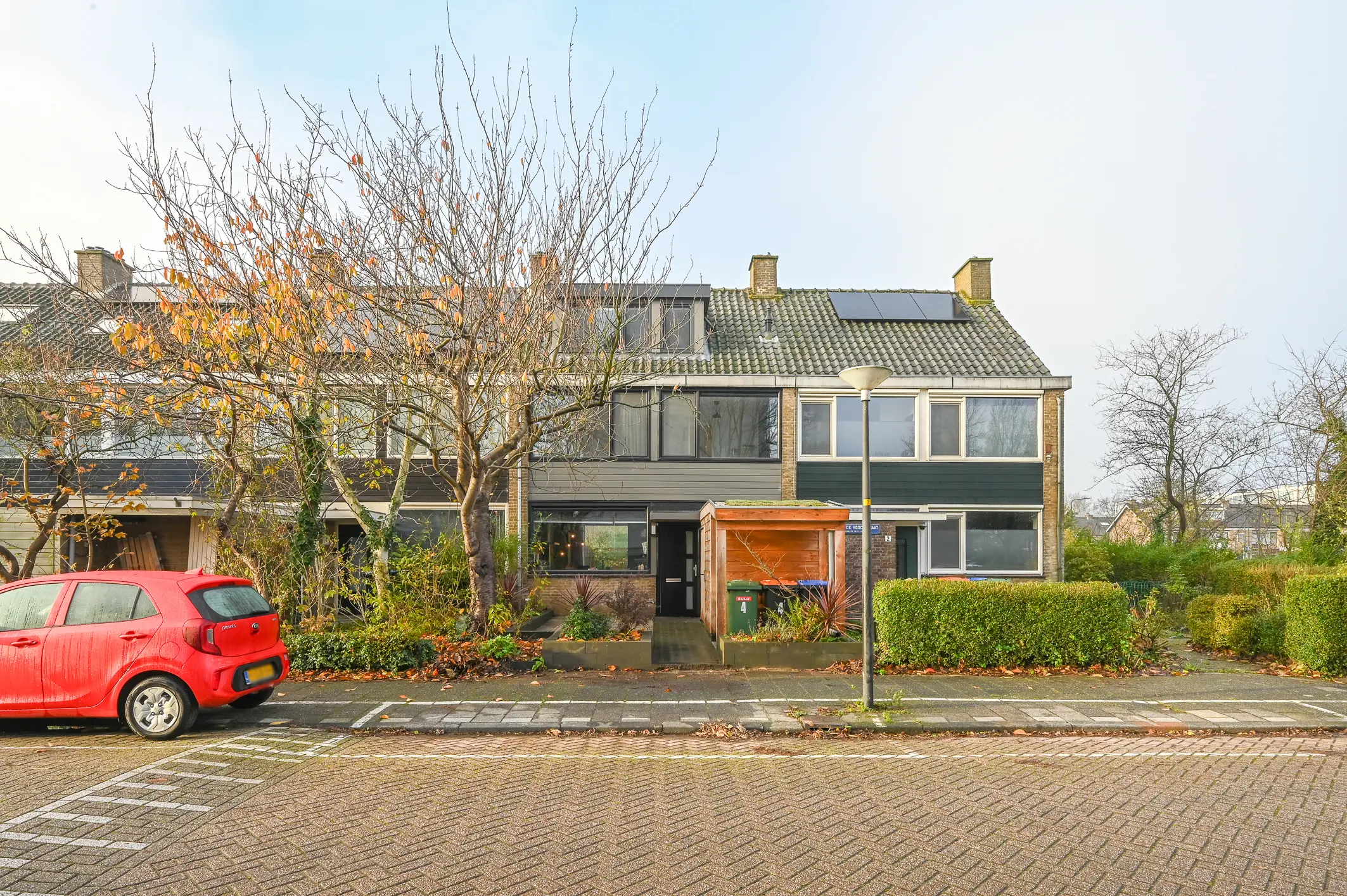 Voor de woning ligt een nette voortuin met een aangebouwde houten berging, ideaal voor fietsen of extra opslagruimte.